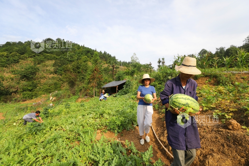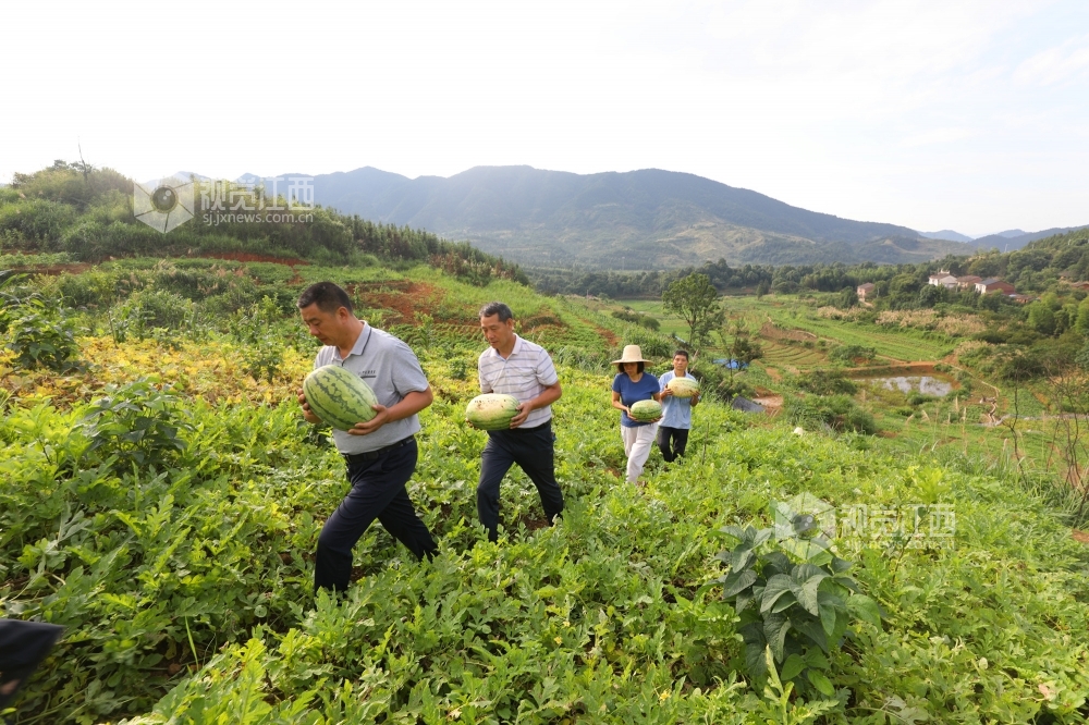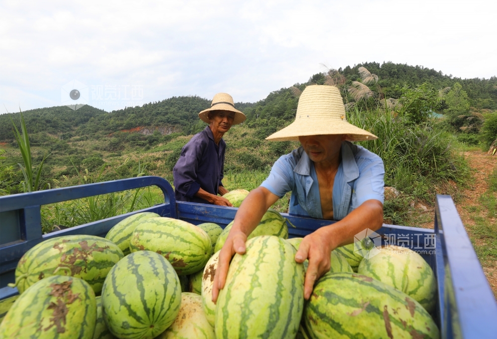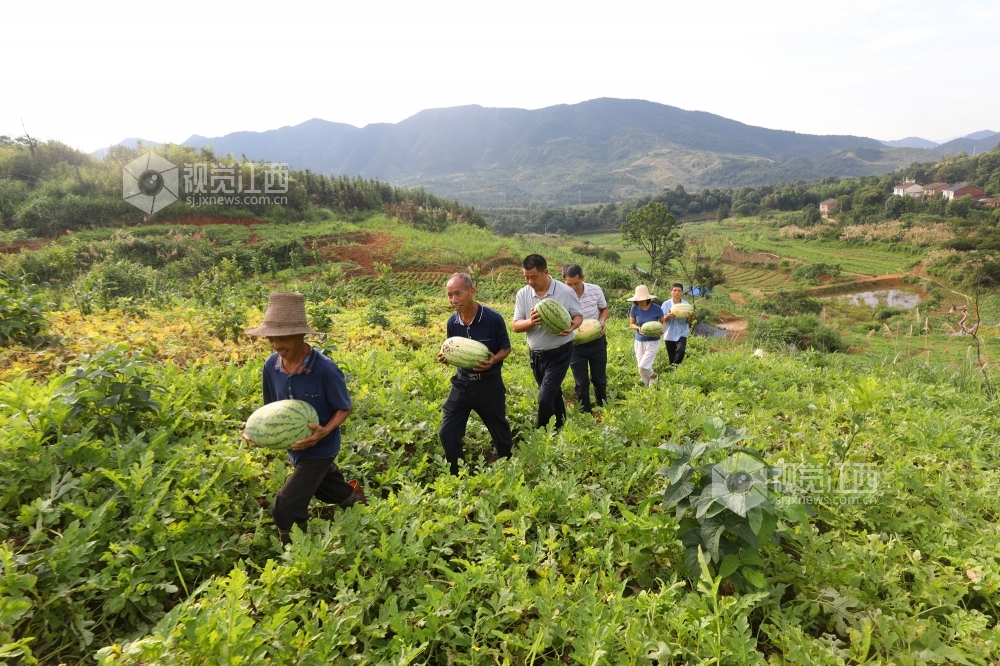 6月29日,在江西省莲花县高洲乡上塘村冲里西瓜扶贫基地,帮扶干部和贫困户正忙着从藤曼中挑选成熟的西瓜,并把采摘好的西瓜装框,拉出去售卖。
