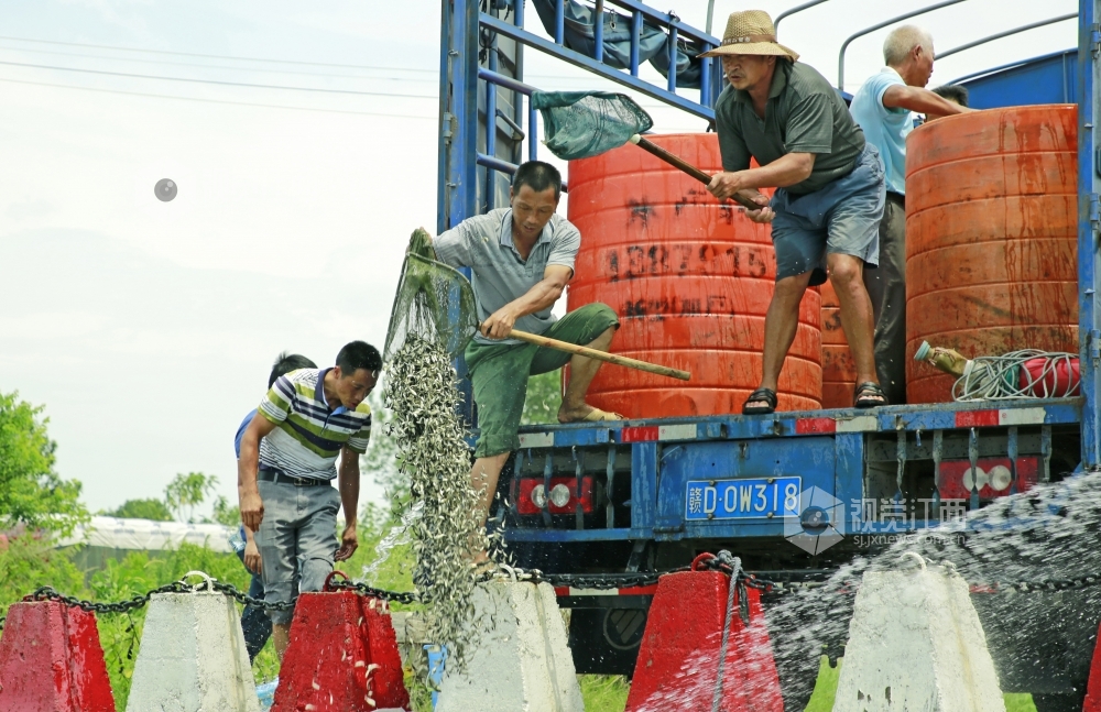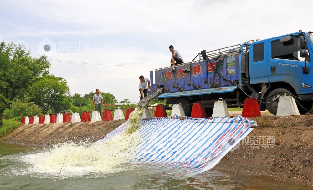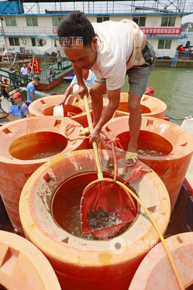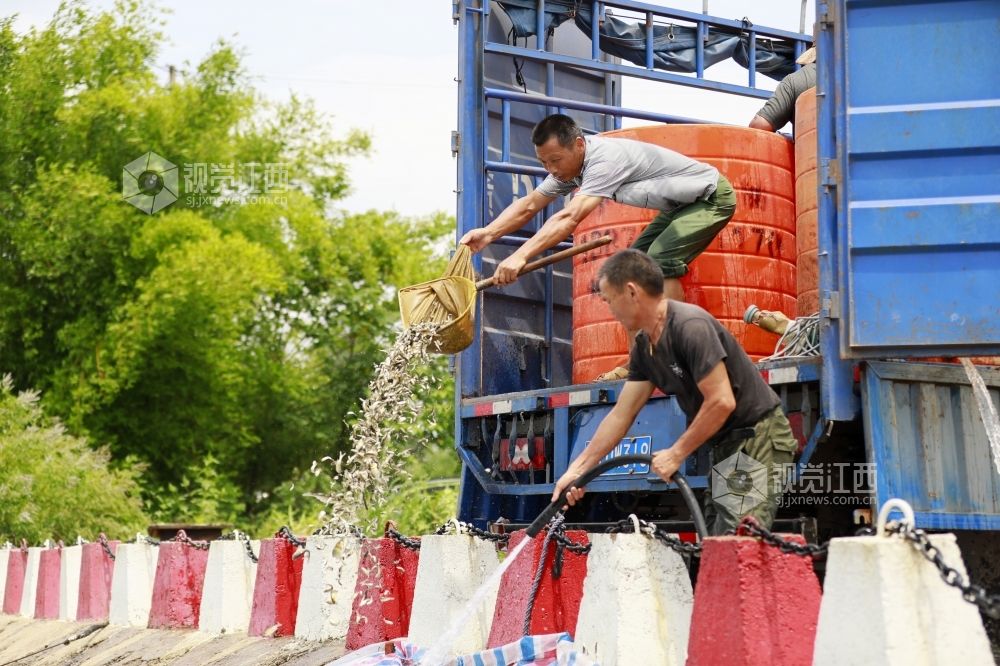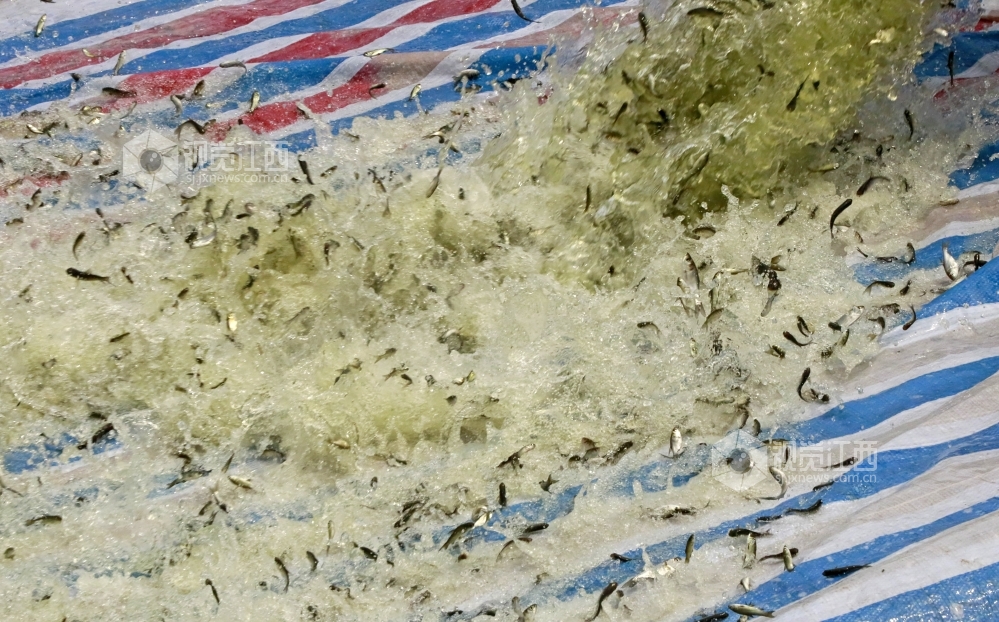 2020年6月29日,江西省泰和县在赣江南门码头水域投放青鱼、草鱼、鲢鱼、鳙鱼等苗种近500万尾。