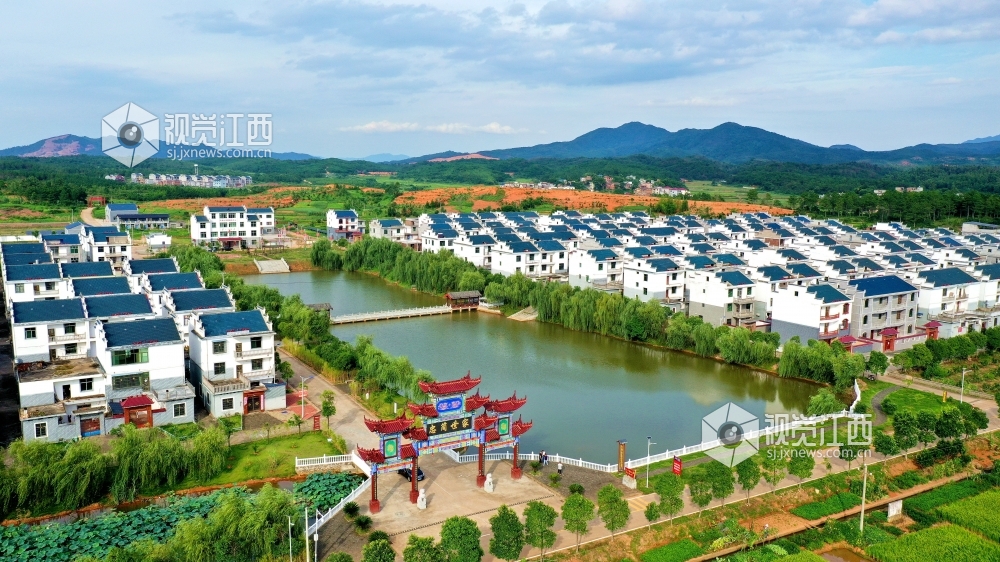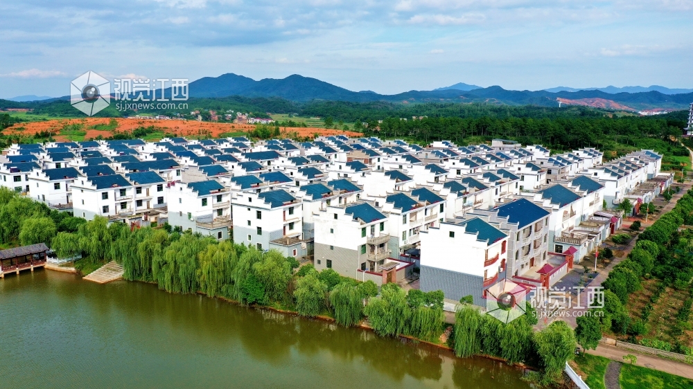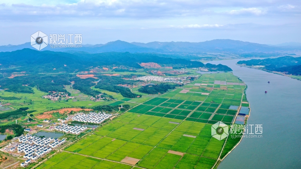 2020年6月28日,航拍下的江西省吉安市吉水县水田乡孔巷移民新村,新建的房屋青砖黛瓦马头墙整齐联排,村前毗邻赣江纵横排列的万亩抬田丰收在望,青山碧水蓝天,美如画卷。