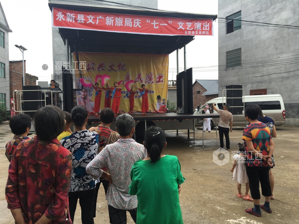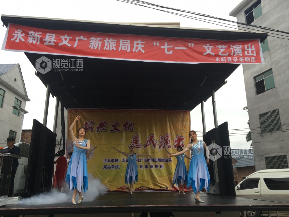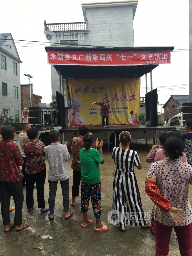 为庆祝中国共产党建党99周年,丰富农村群众业余文化生活。7月1日上午,江西省永新县采茶剧团庆“七一”送戏下乡文艺演出在永新象形乡桥头村拉开帷幕,演职人员与群众一起庆祝党的生日、感念党的恩情。