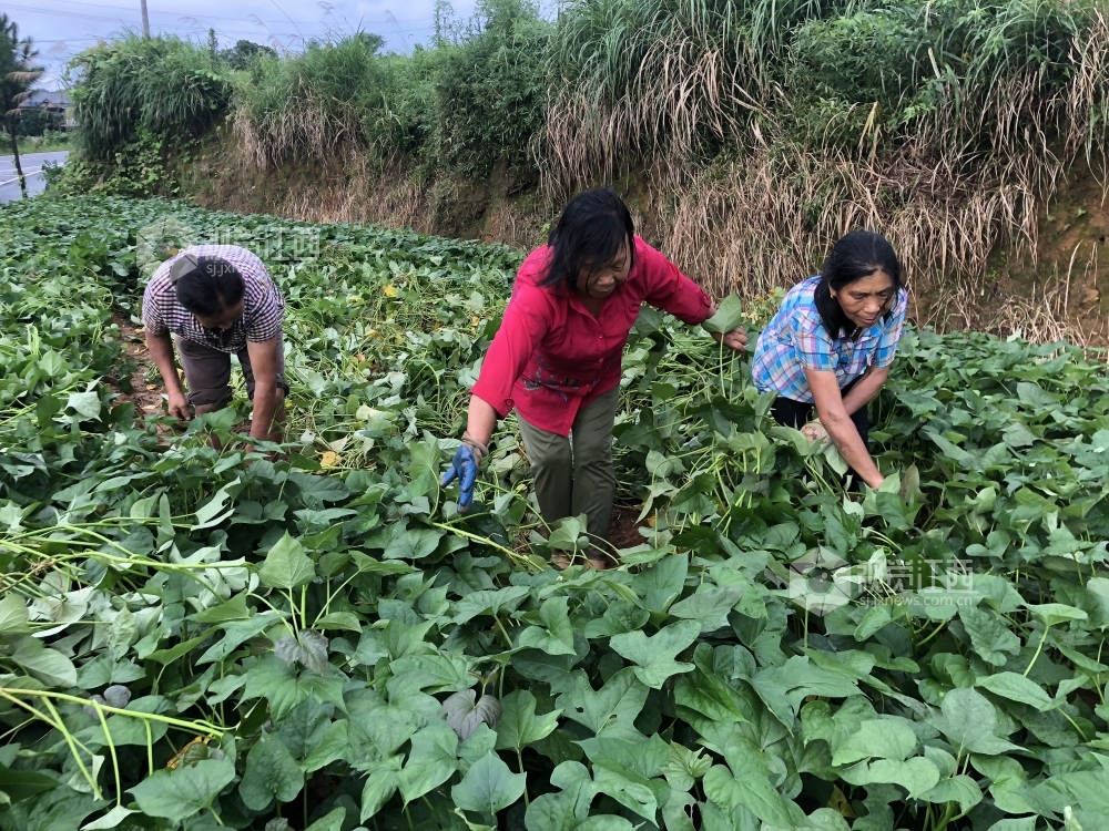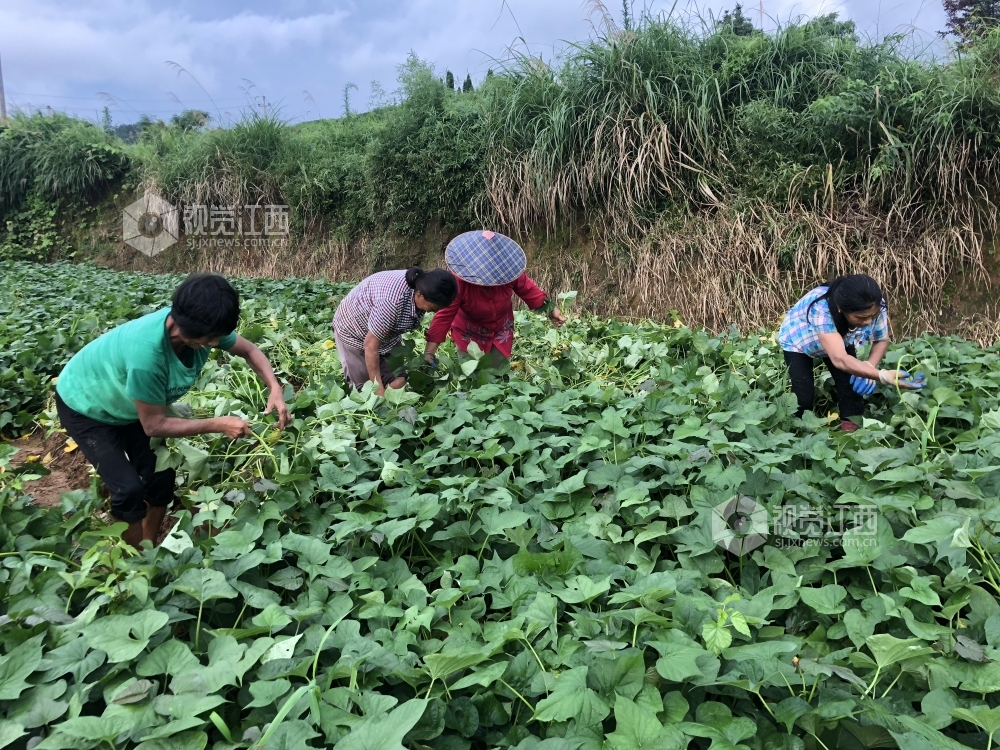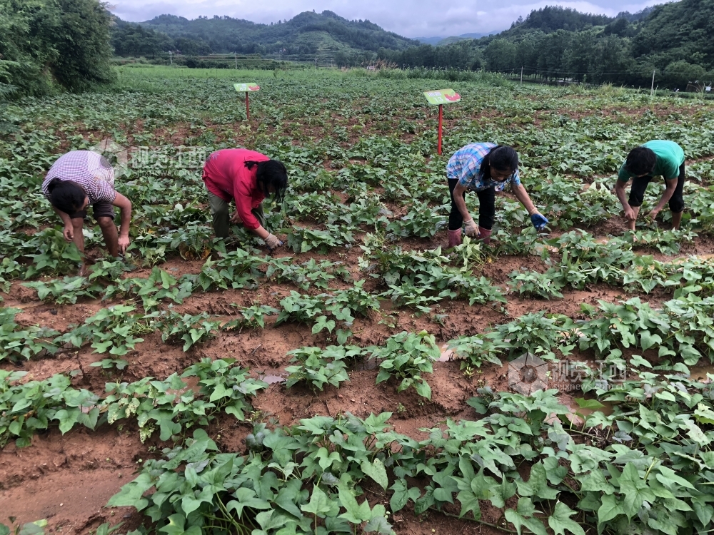 江西省横峰县港边乡大力发展红薯产业,全乡3000多户农户种植红薯4000多亩,产值一千多万元,红薯成了该乡富民的支柱产业。7月2日港边乡善塘村村民在红薯地里拔草整理薯藤。