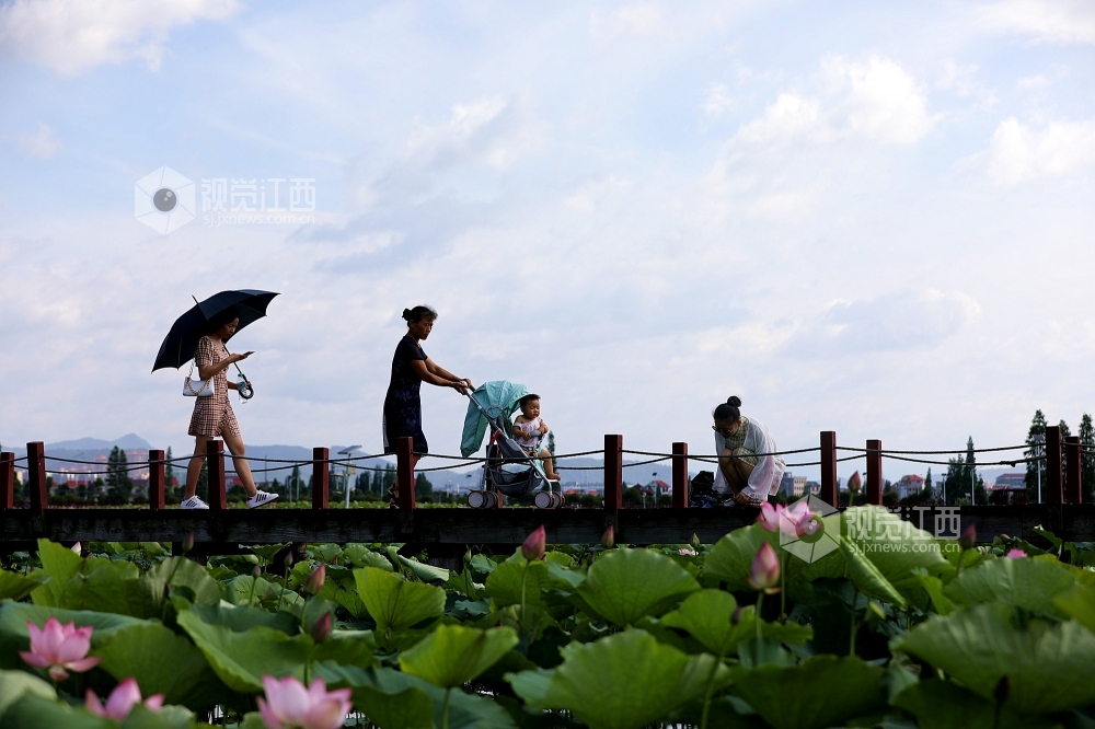 7月5日,游客在江西省莲花县荷花博览园游览。进入盛夏以来,该县荷花博览园的5000亩荷花陆续绽放,吸引了周边市民前来观赏游玩。