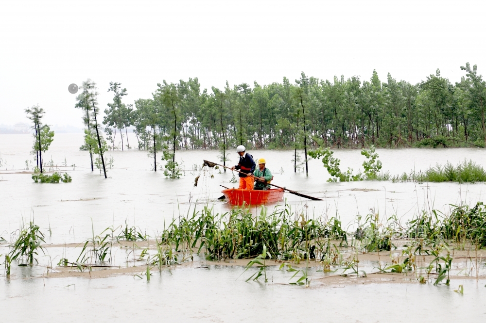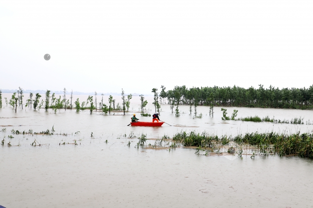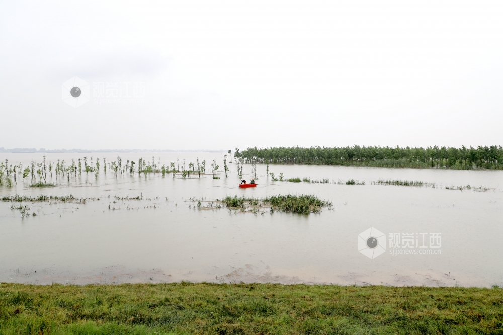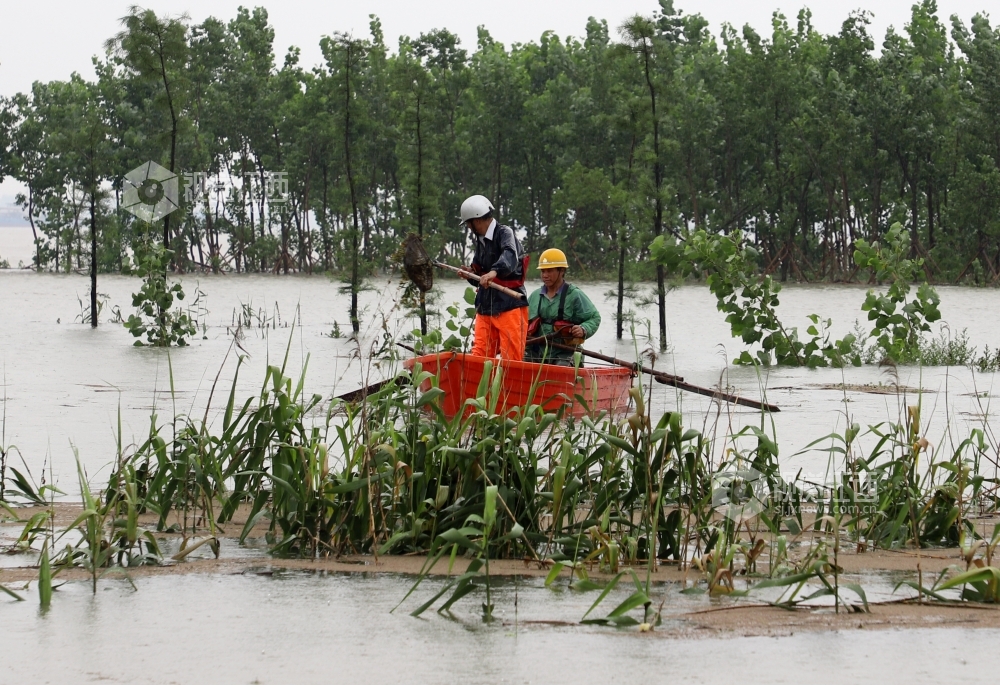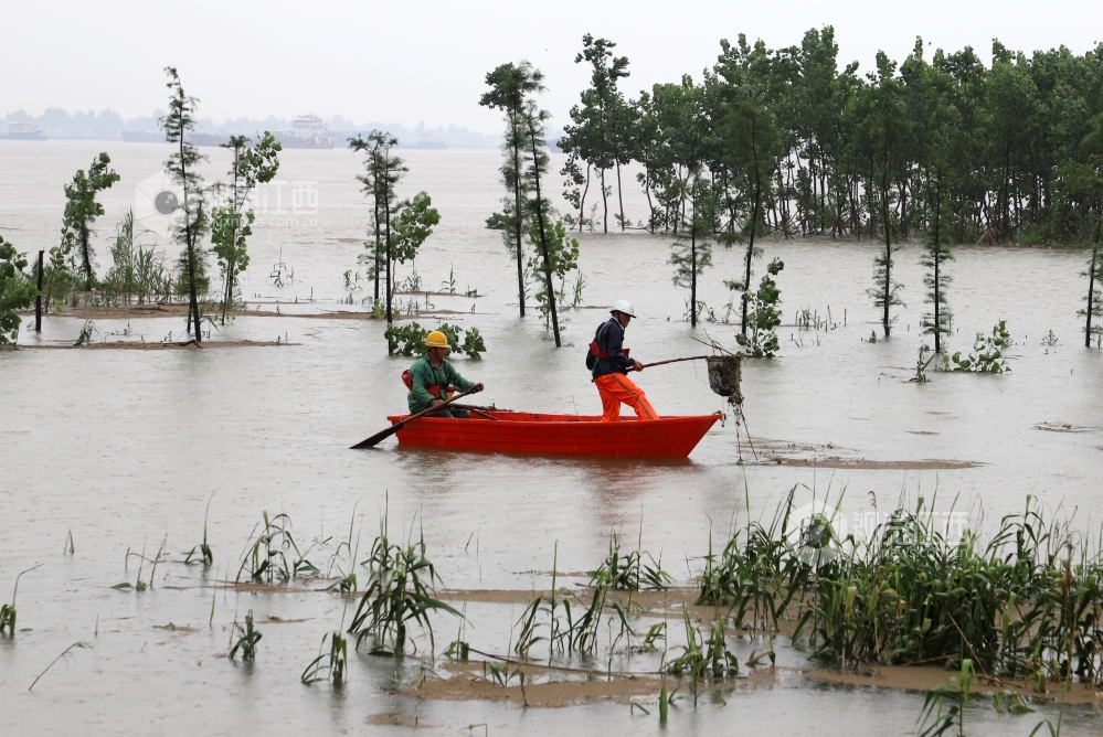 2020年7月6日,防汛人员正在长江干堤江西省九江市湖口县段牛脚芜圩堤,清理漂浮在长江河道内的垃圾。连日来,受持续强降雨及长江中上游来水影响,长江水位迅猛上涨,导致河道漂浮物增多,为疏通河道,便于查险,提升防汛处险能力,当地组织人员清理长江河道内的漂浮物。