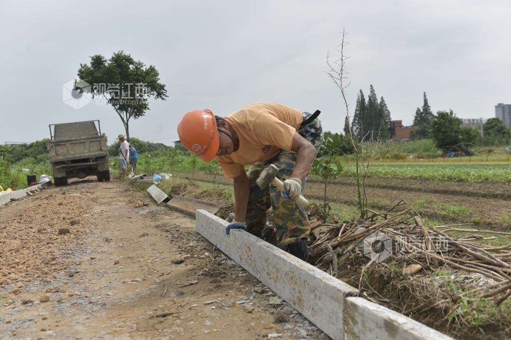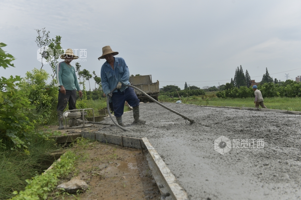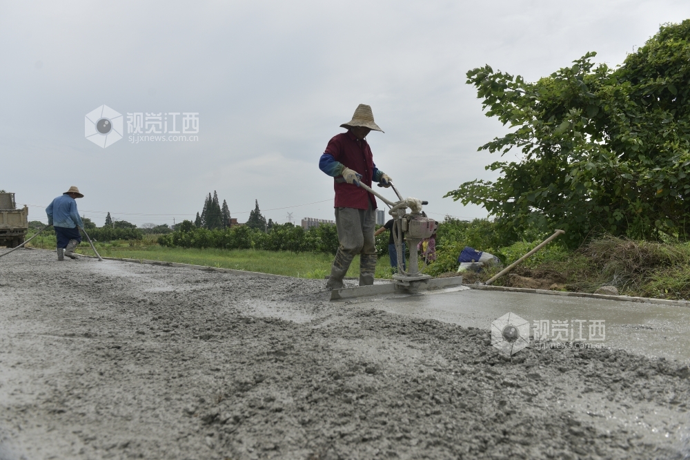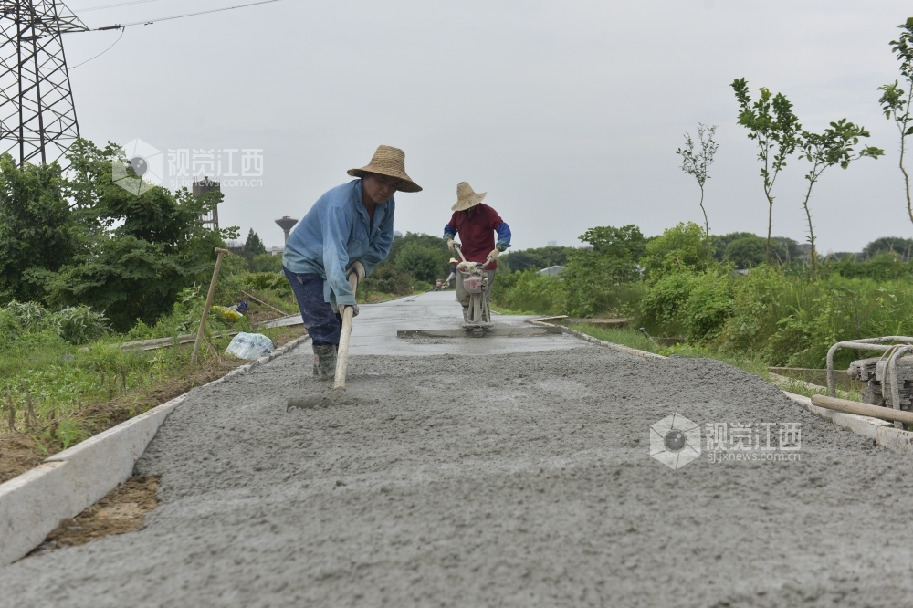 7月6日上午,在南昌市东湖区扬子洲镇林场村晒网洲自然村机耕道硬化施工项目现场,工人们顶着炎炎烈日在村干部的组织下抢抓晴好天气抓紧施工,该项目总长700余米,总投资19万元,是扬子洲镇今年来确定的八大类民生实事候选项目的其中一个子项目,该项目的实施将为村民的农业生产创造良好的便利条件。