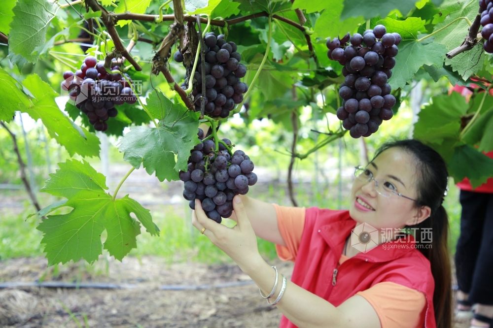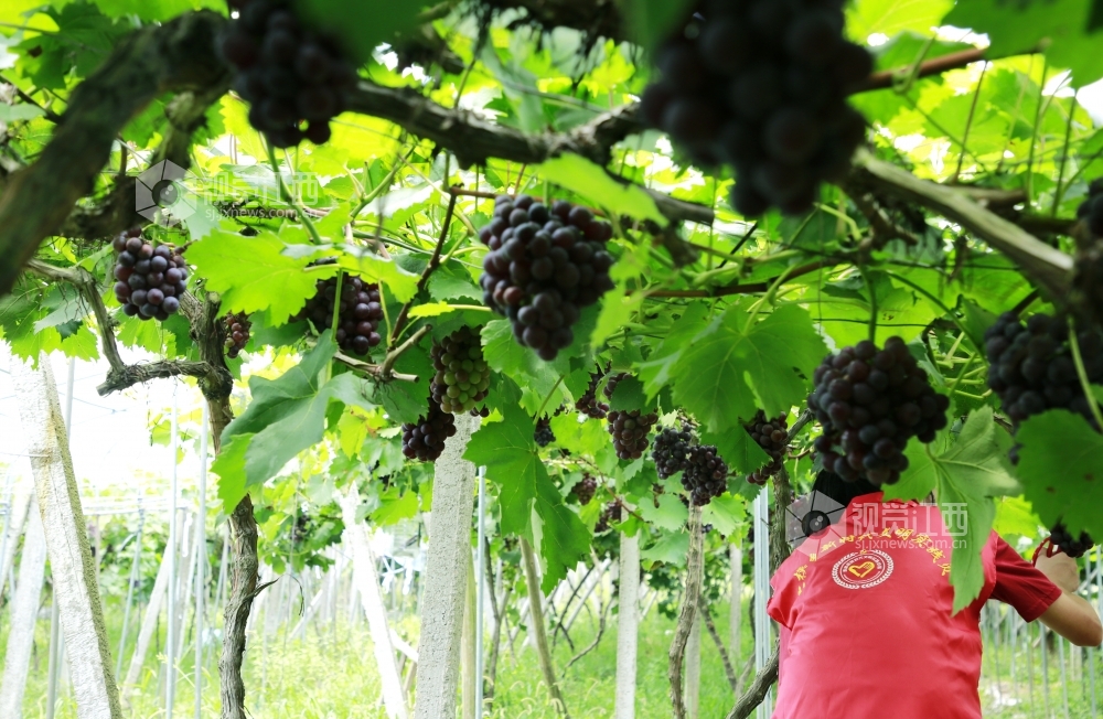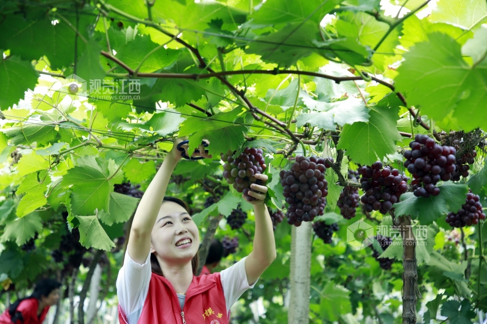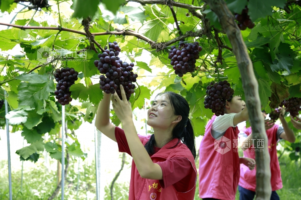 2020年7月8日,在江西省吉安市泰和县上模乡油洲村生态葡萄园内,新时代文明实践志愿者们忙着助力果农采摘葡萄。