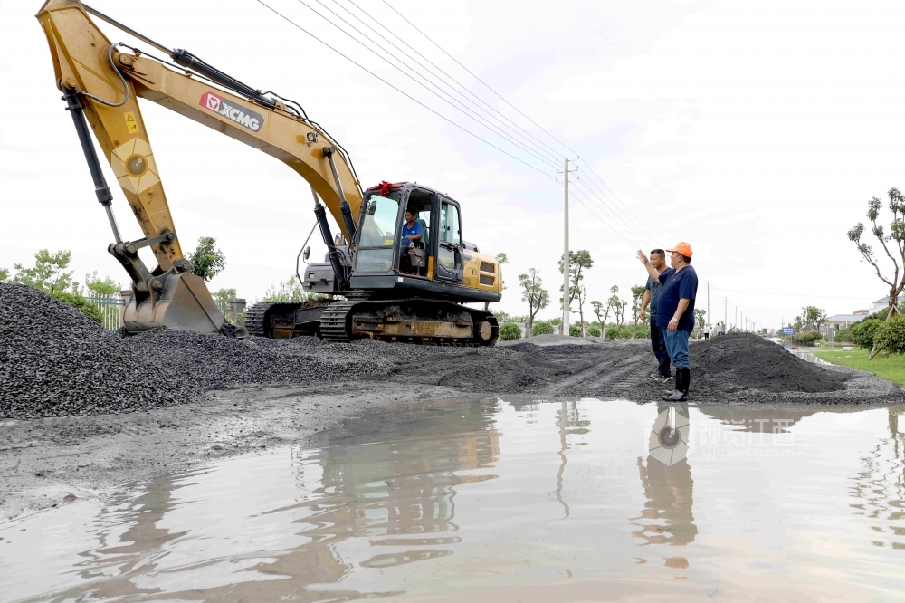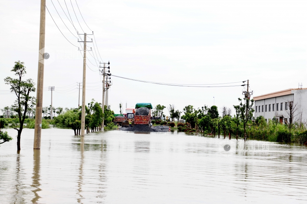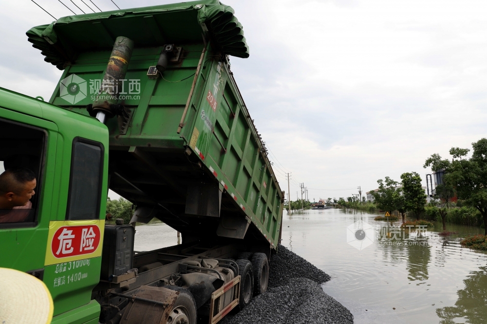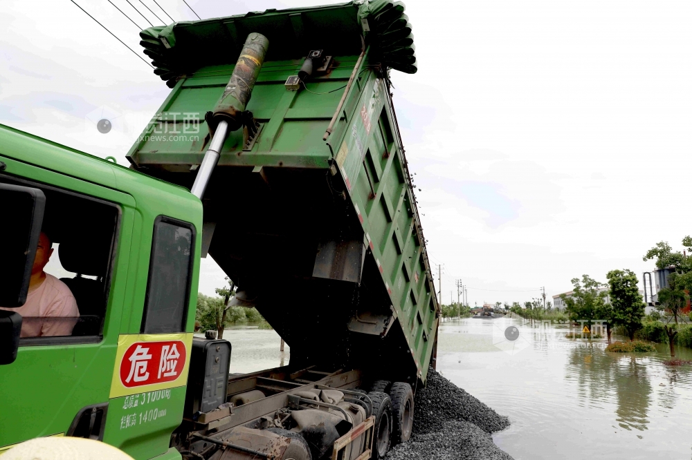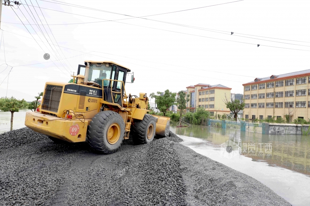 2020年7月11日,江西省九江市公路管理局湖口分局施工人员正在沿江大道抢通被洪水淹没的低洼路段。据悉,7月10日20时,长江湖口站水位达21.86米,超警戒水2.36米。当地连夜组织人员和机械设备,对水淹路段进行抢修,保障园区救灾物资道路畅通。