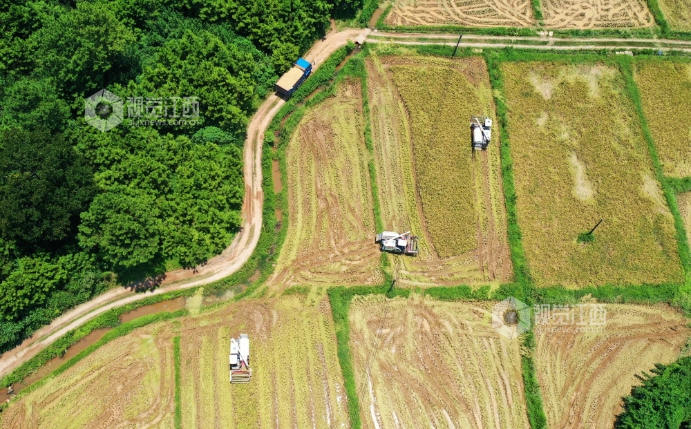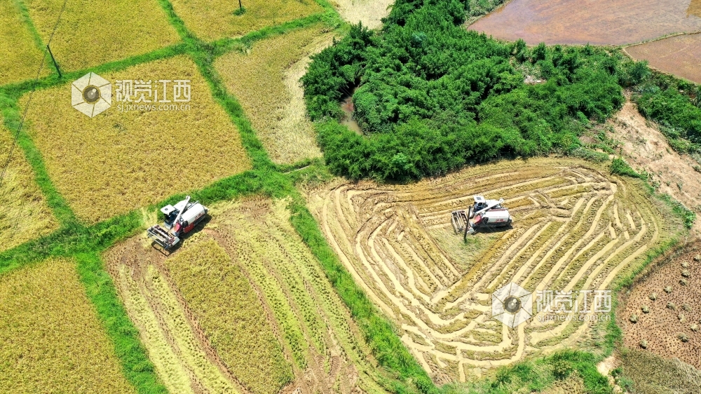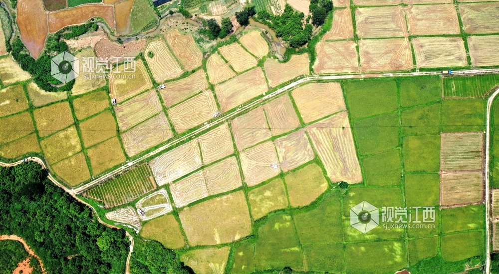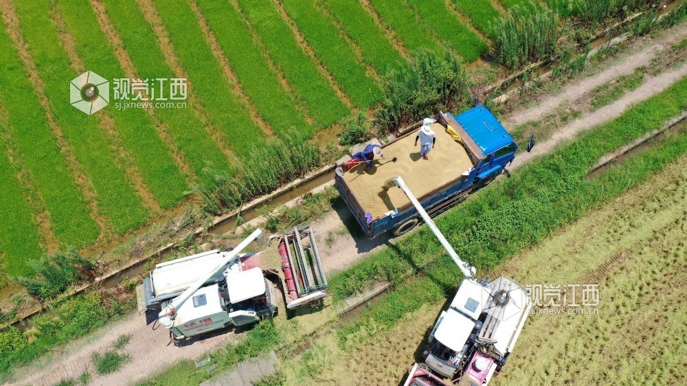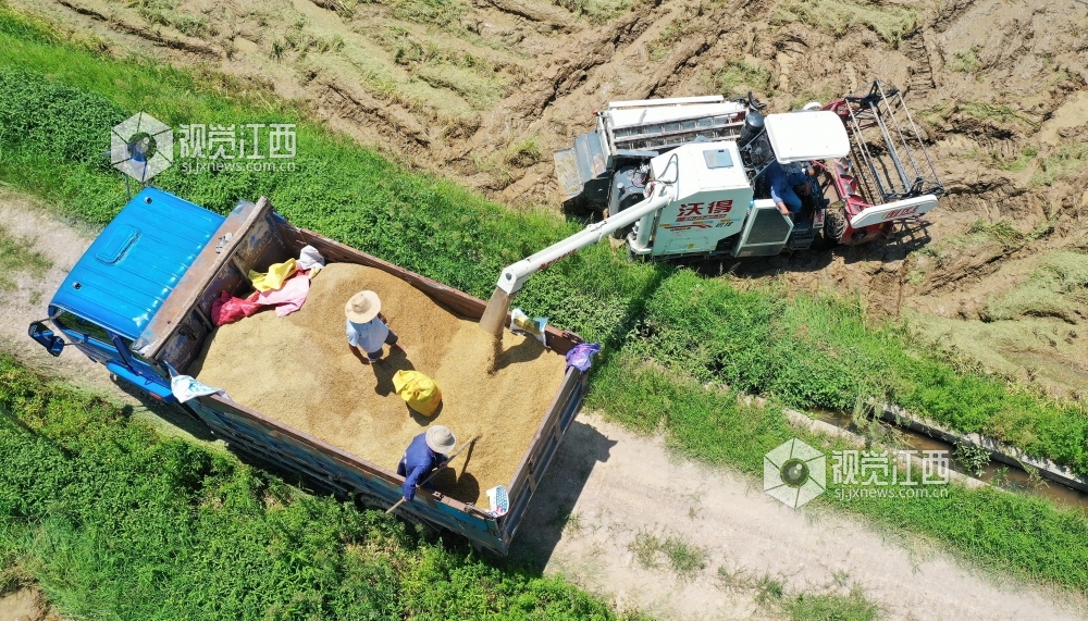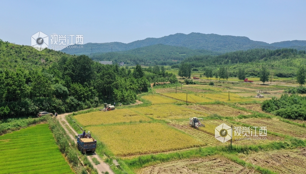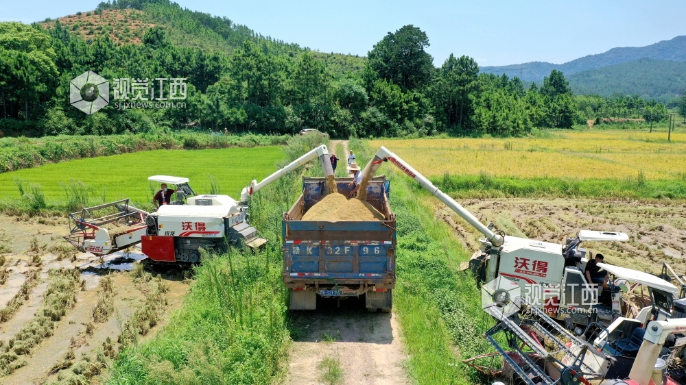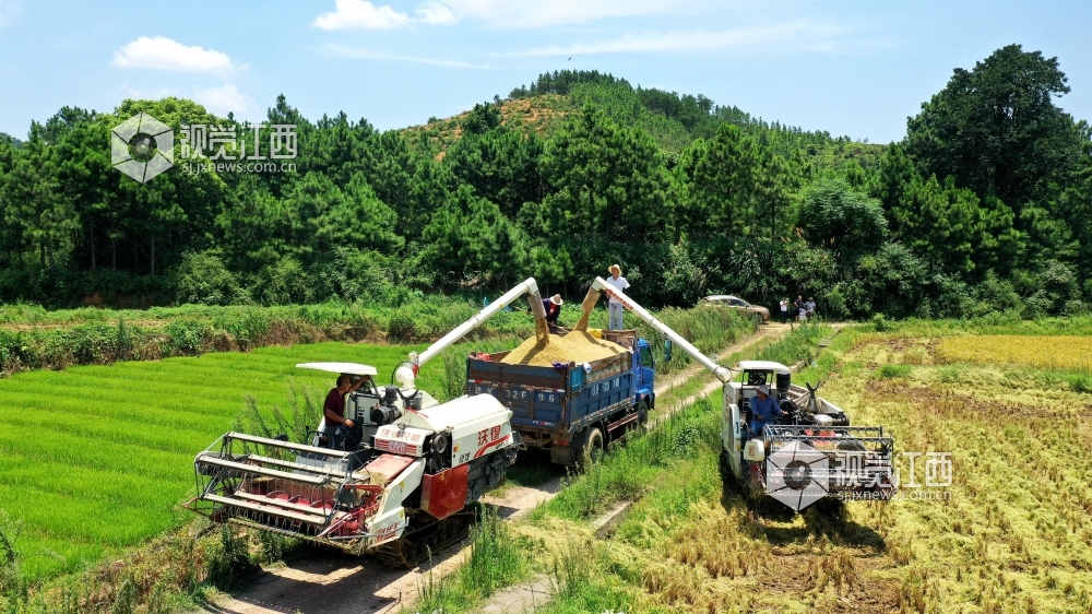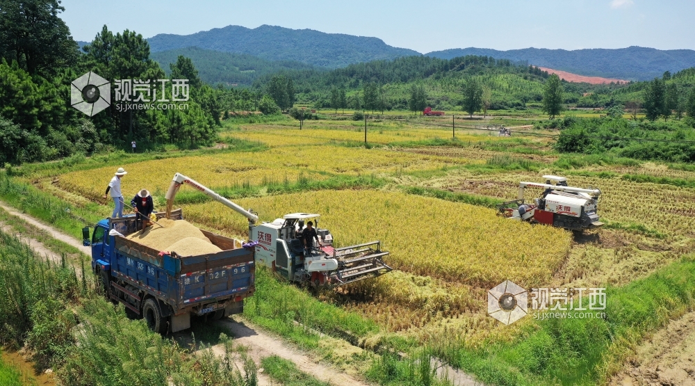 2020年7月13日,江西省吉安市吉水县水田乡桑园村中波农业稻种基地一片忙碌,收割机来回穿梭抢收早稻。