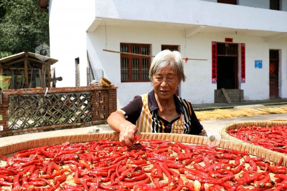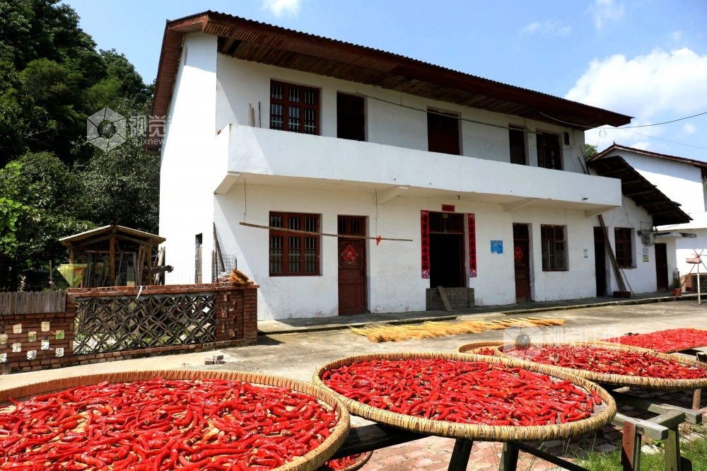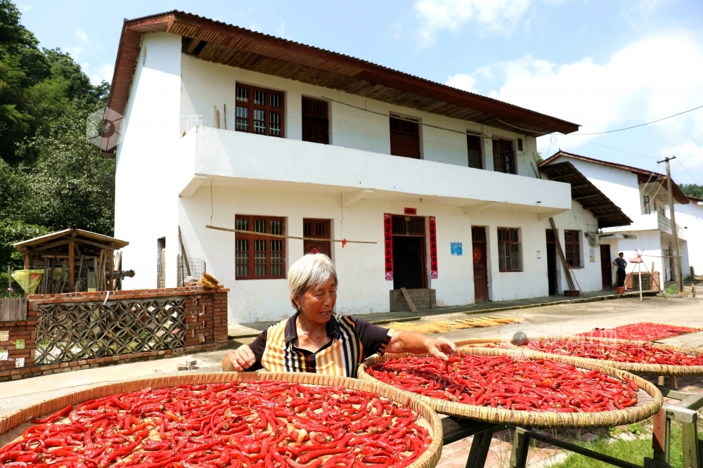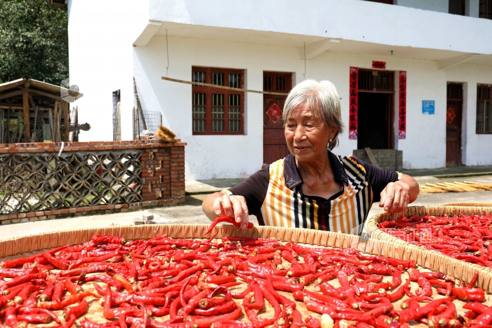 7月13日,江西省分宜县钤山镇下田村礼冠村小组村民袁秀连在家门口晾晒采摘的红辣椒。时下正是辣椒成熟旺季,分宜县一些村民将自己种植的辣椒采收下来,用簸箕晾晒在家门口院子里,红红的一片,构成一幅温馨的乡愁画卷。
