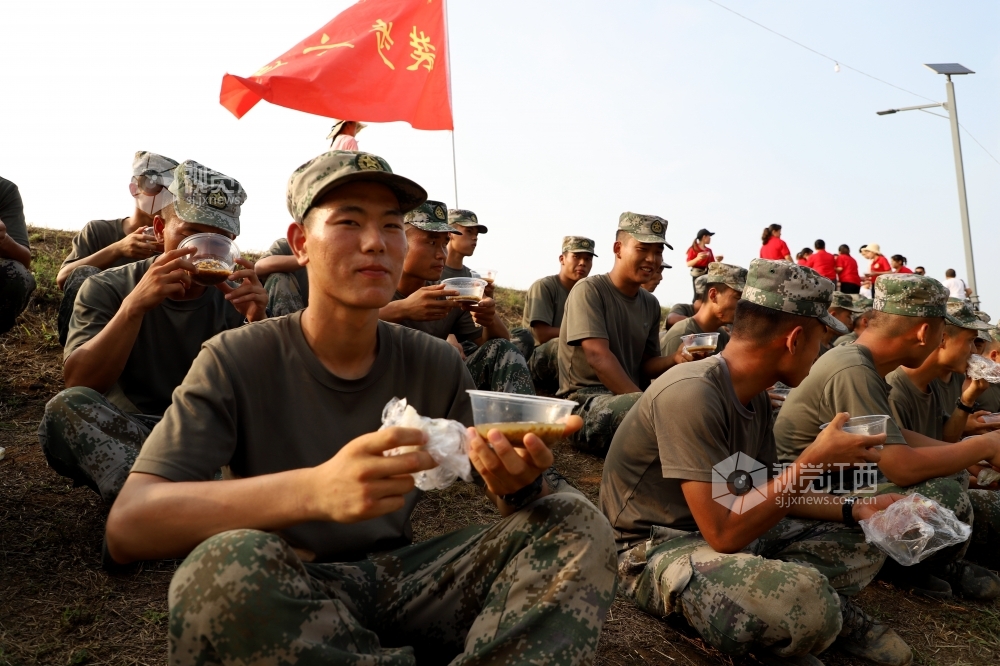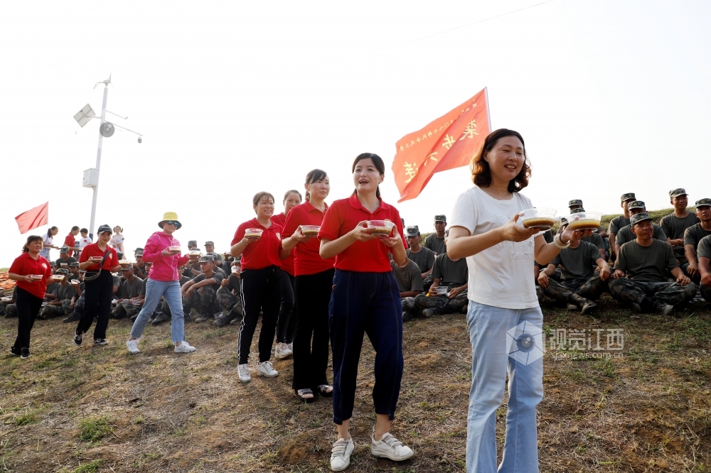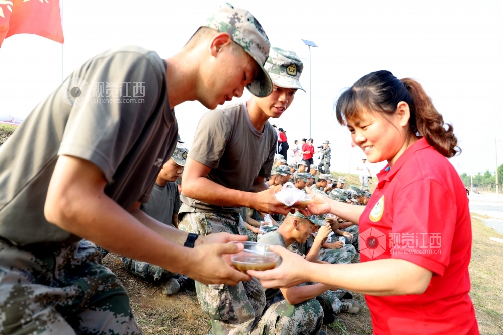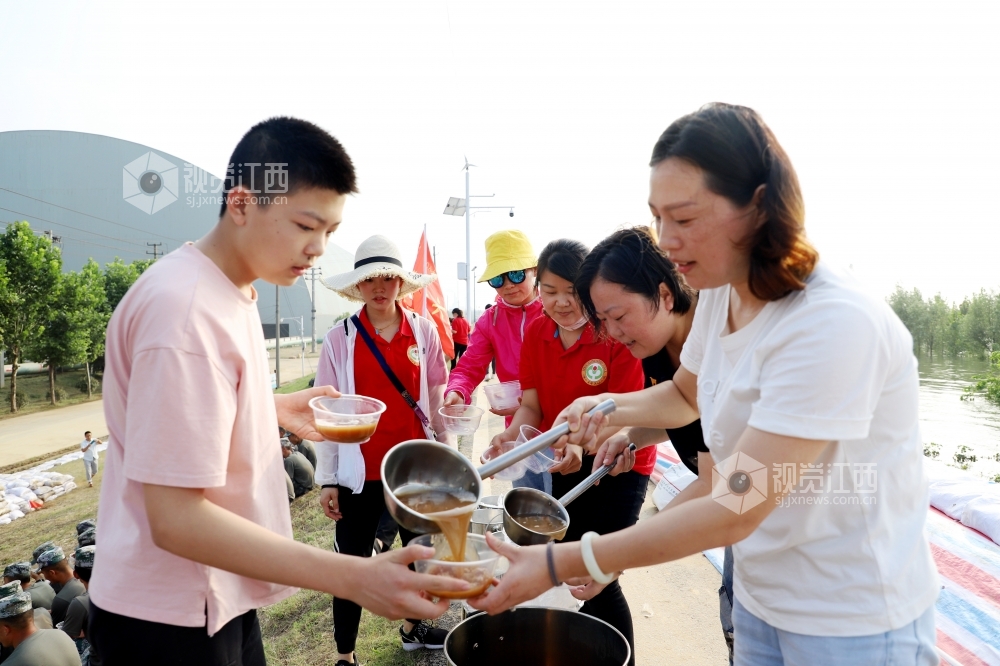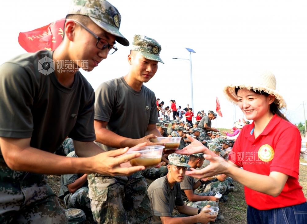 2020年7月14日,群众给抗洪官兵送来绿豆汤、米粑,共叙军民鱼水情。连日来,在江西省九江市湖口县长江干堤牛脚芜堤,持续的高水位浸泡,堤坝多处出现险情,400多名抗洪官兵正在和当地干部群众开挖导渗沟,扛沙袋,修筑支墩,全力守护大堤安全。