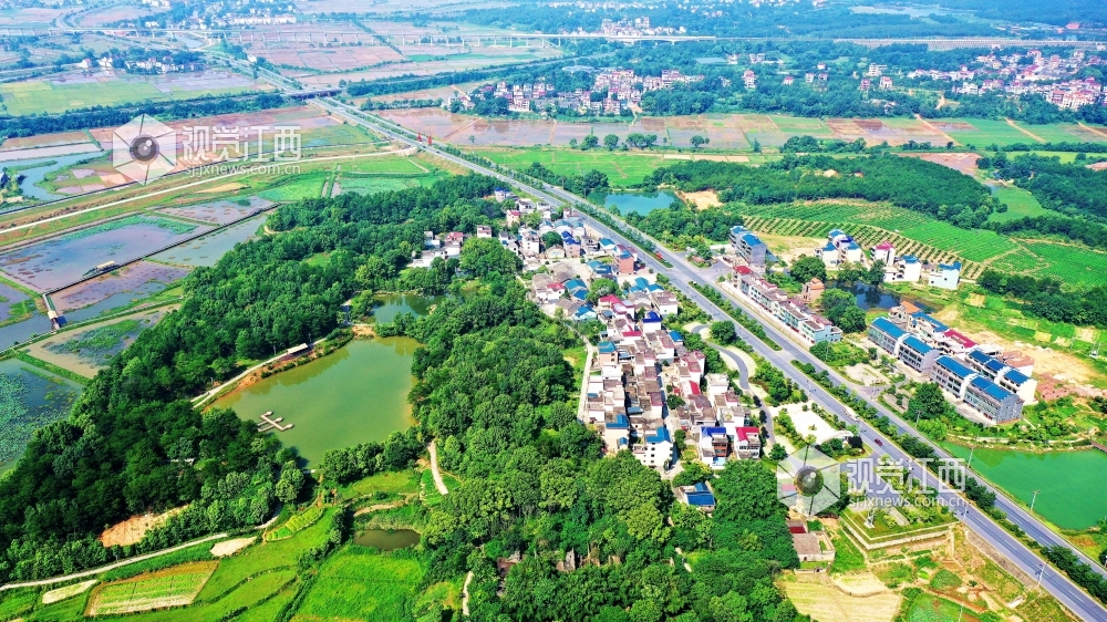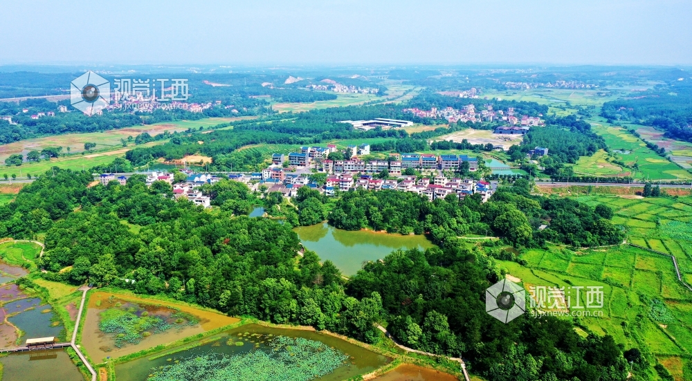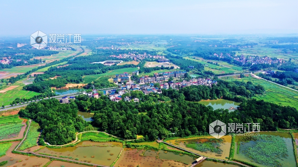 2020年7月15日,航拍下的江西省吉水县金滩镇卧虎岭村,古樟连片,荷塘环绕,屋舍整洁美丽,美如画卷。