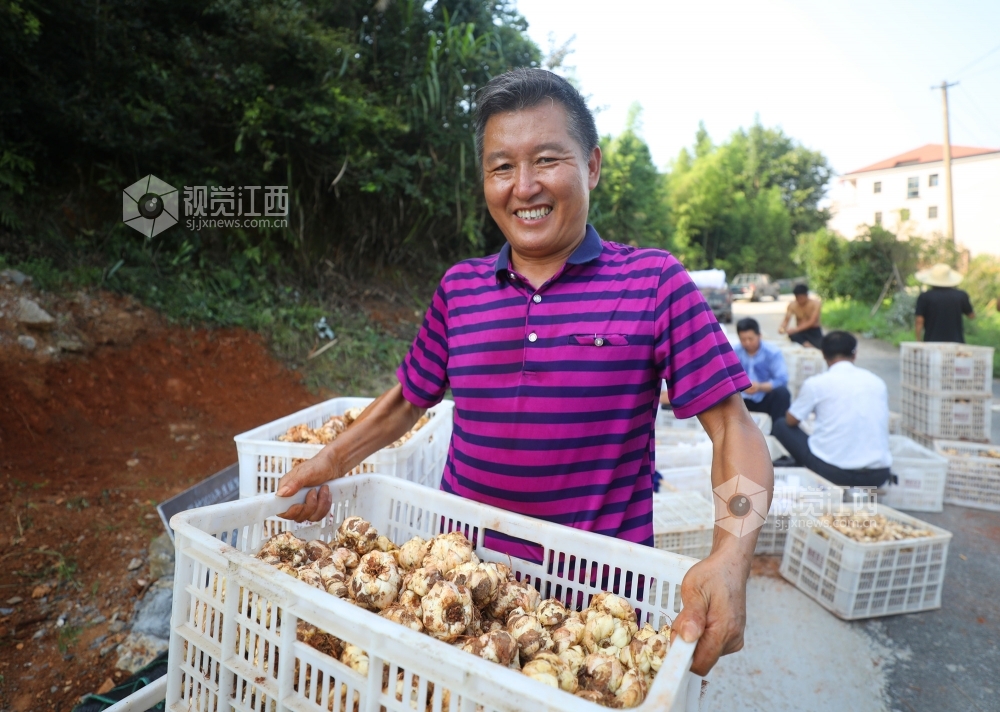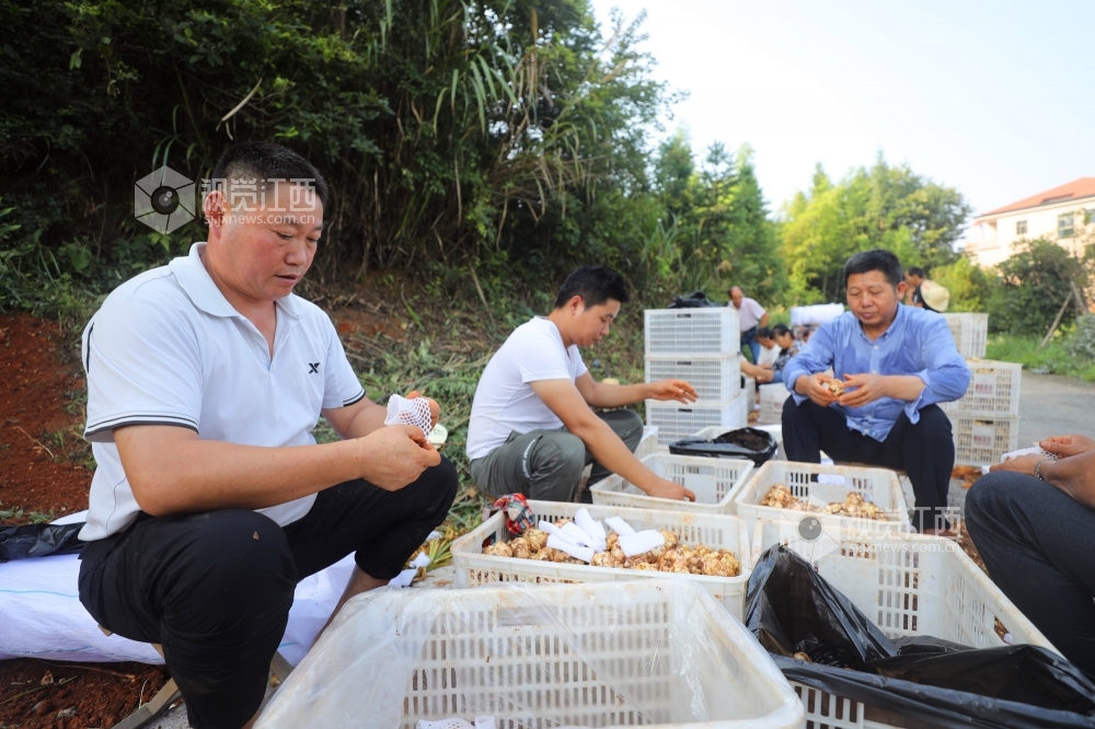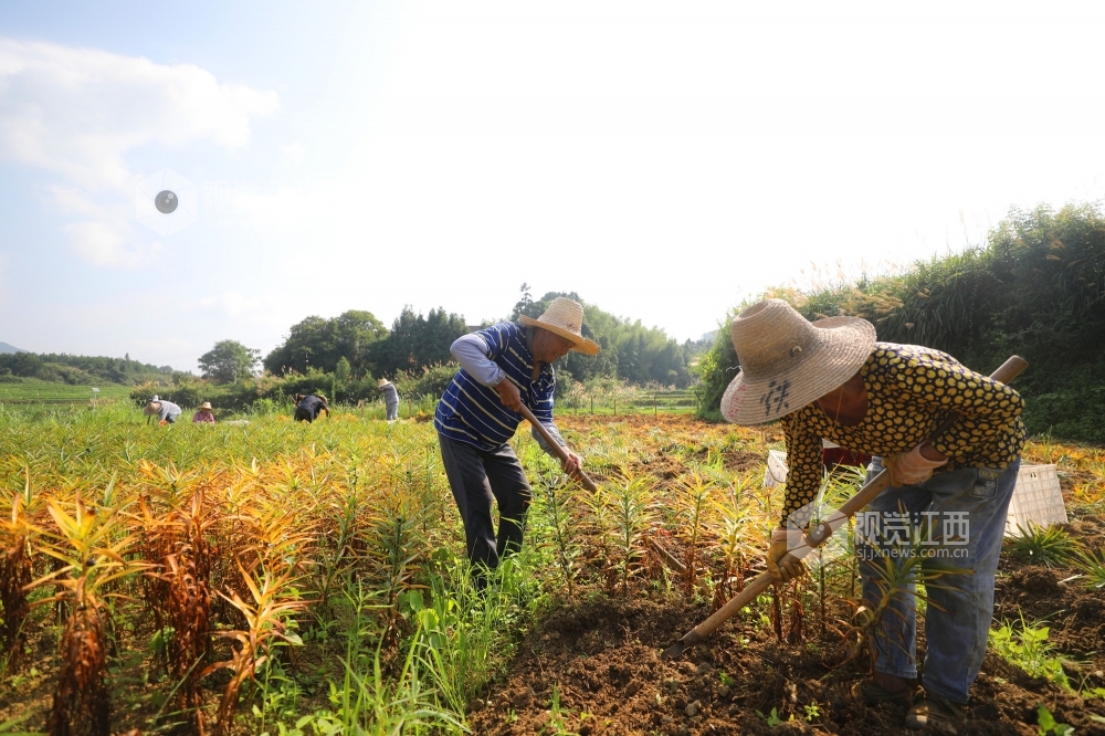 7月15日,莲花县六市乡山背村村民正在采收百合,去年9月份该村种下了药用百合60多亩,7月中旬进入成熟采收期。早上5点,种植基地里就开始热闹起来,村民正忙着采挖、清泥土、装车。据初步估算,亩产2000斤左右。百合丰收,不少乡亲都抢着到基地来打零工,一天能赚上一百元。挖百合的乡亲赚钱高兴,入股种植百合的贫困户更是乐得合不拢嘴,基地里每天采挖的百合还没出土,就已经被企业订购。