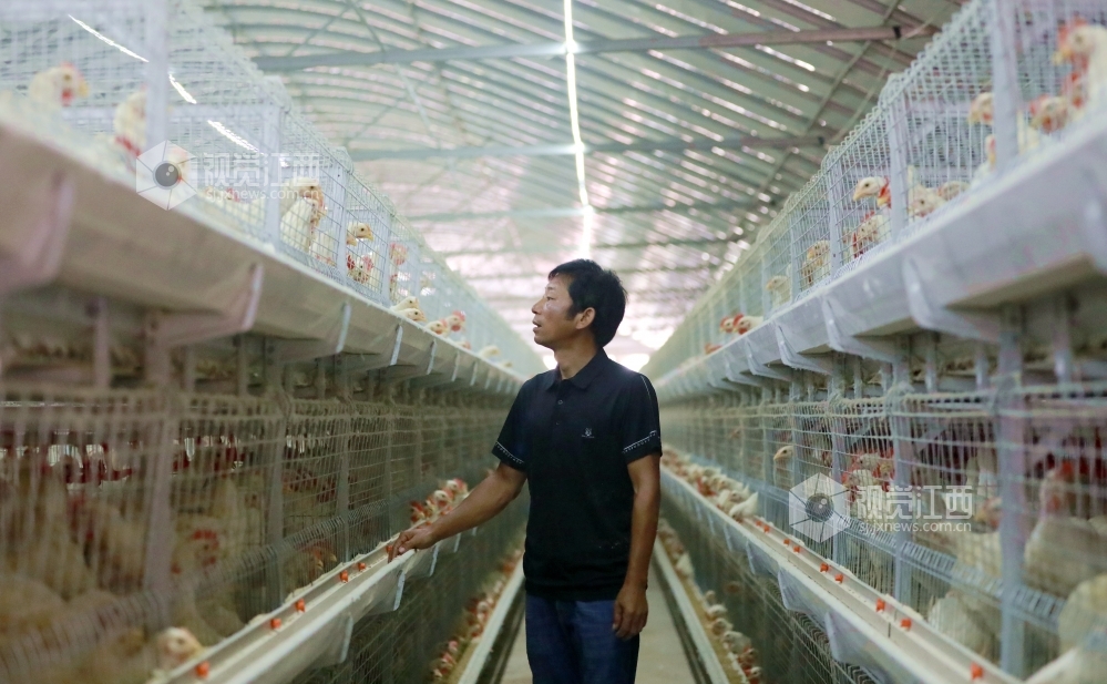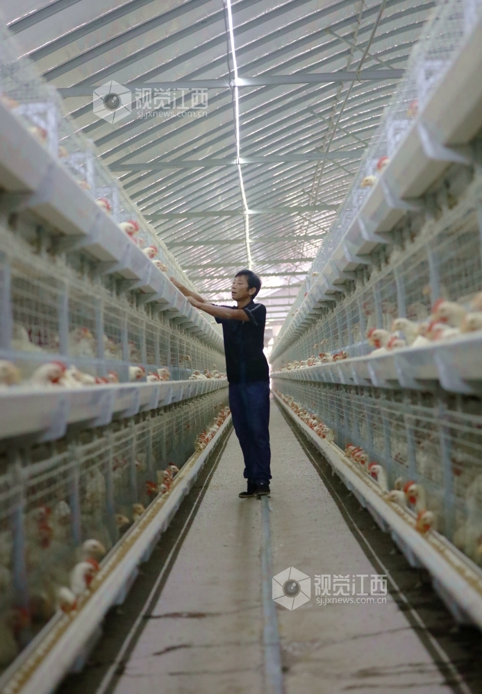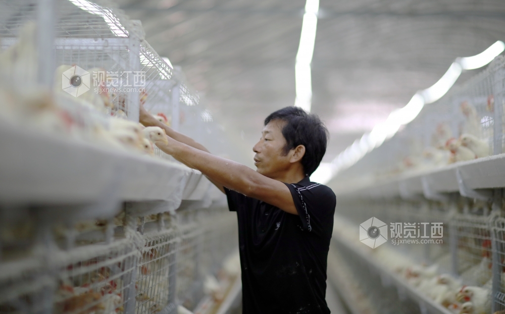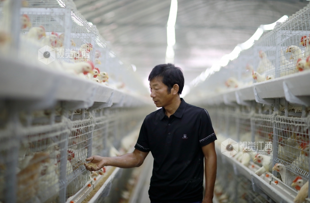 2020年7月16日,江西省吉安市吉水县八都镇东坊村鑫丰养鸡合作社标准化科技养鸡场,致富带头人周伟生正在查看肉鸡生长情况,该合作社今年首批4.8万羽肉鸡将在近日全部出栏。