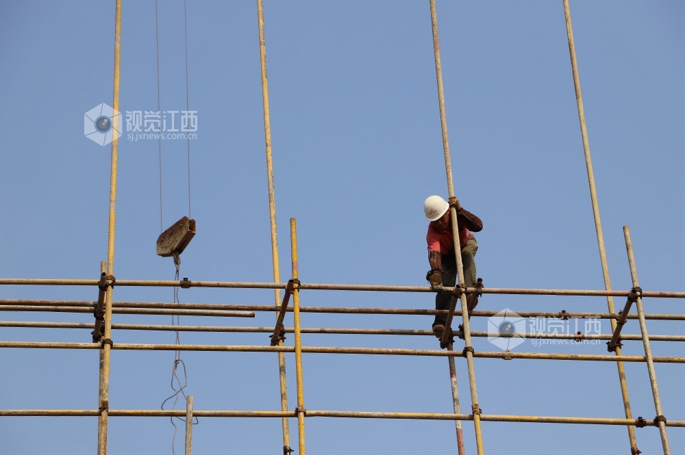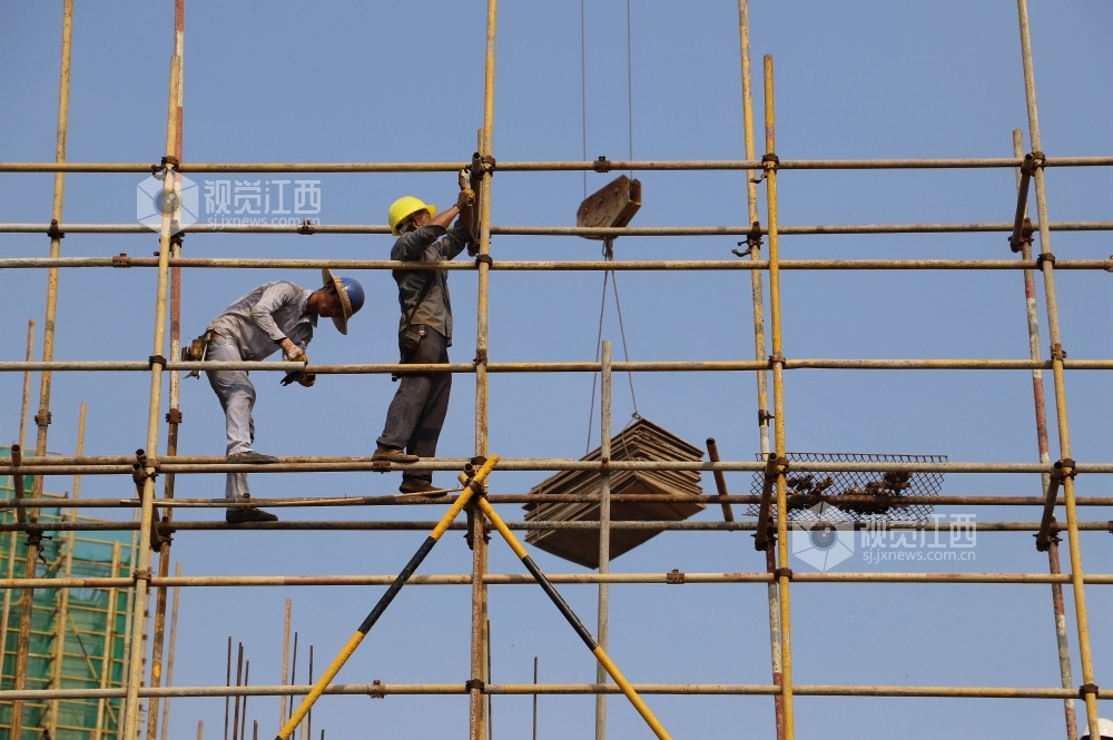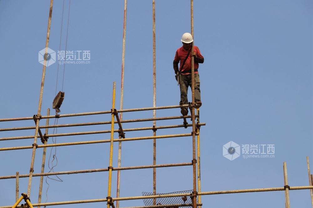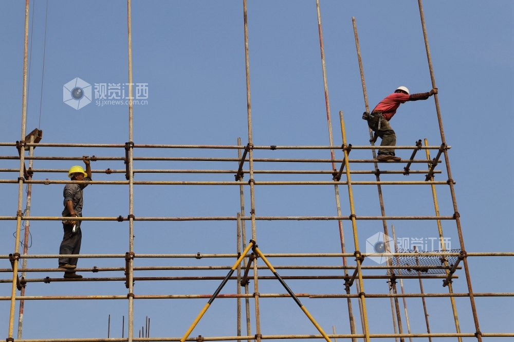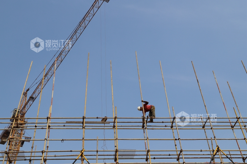 7月17日,江西省安福县平都镇蒙冈岭社区棚户区改造工程工地工人在搭建脚手架。近期,安福县连续出现晴热天气,白天最高气温达到摄氏37度,但该县工业、交通、水利、旅游、城建等各项目建设工地却一派热火朝天的施工景象。目前,安福县各条战线在抓好常态化疫情防控的前提下,持续发力,有序做好“六稳”“六保”工作,为夺取疫情防控和经济社会发展双胜利而努力。
