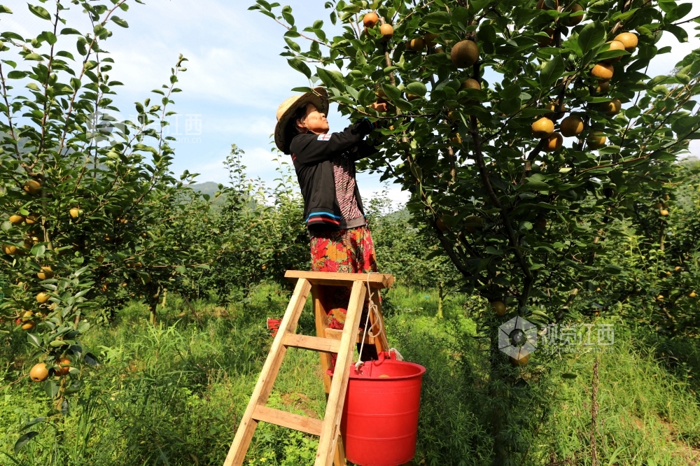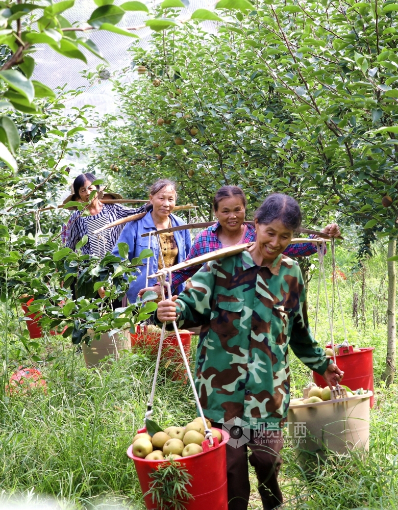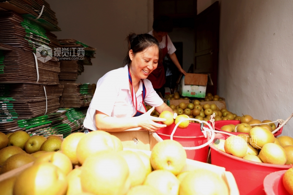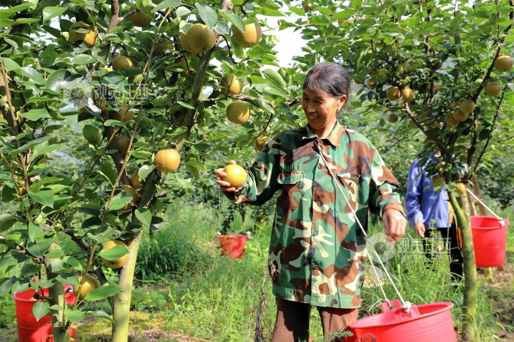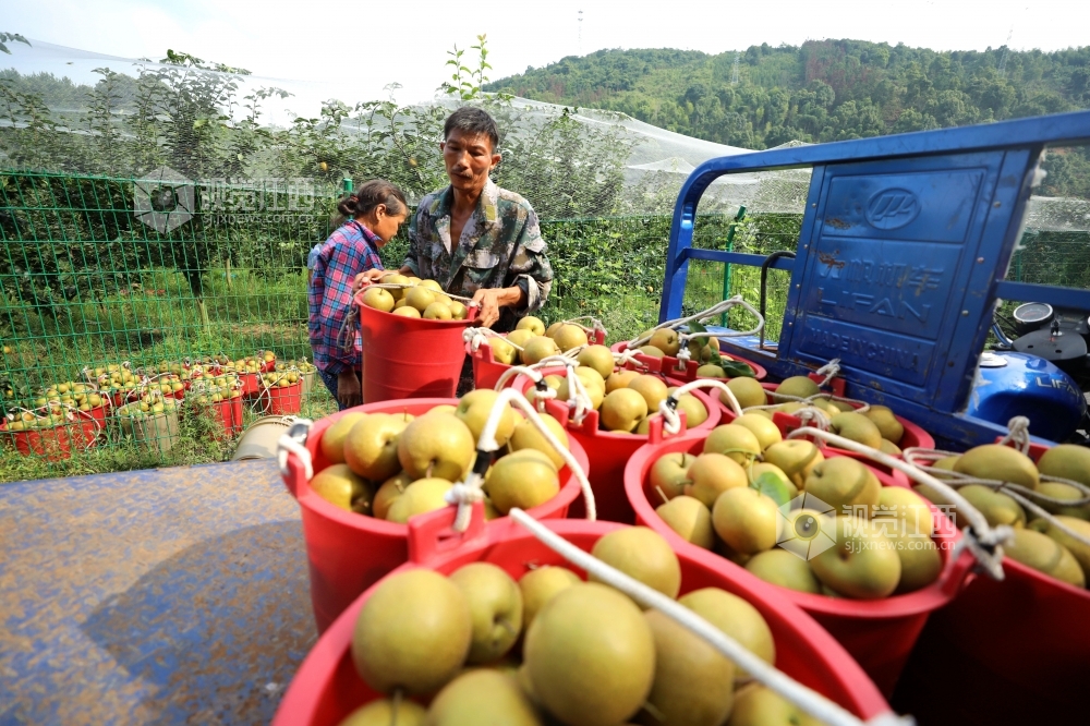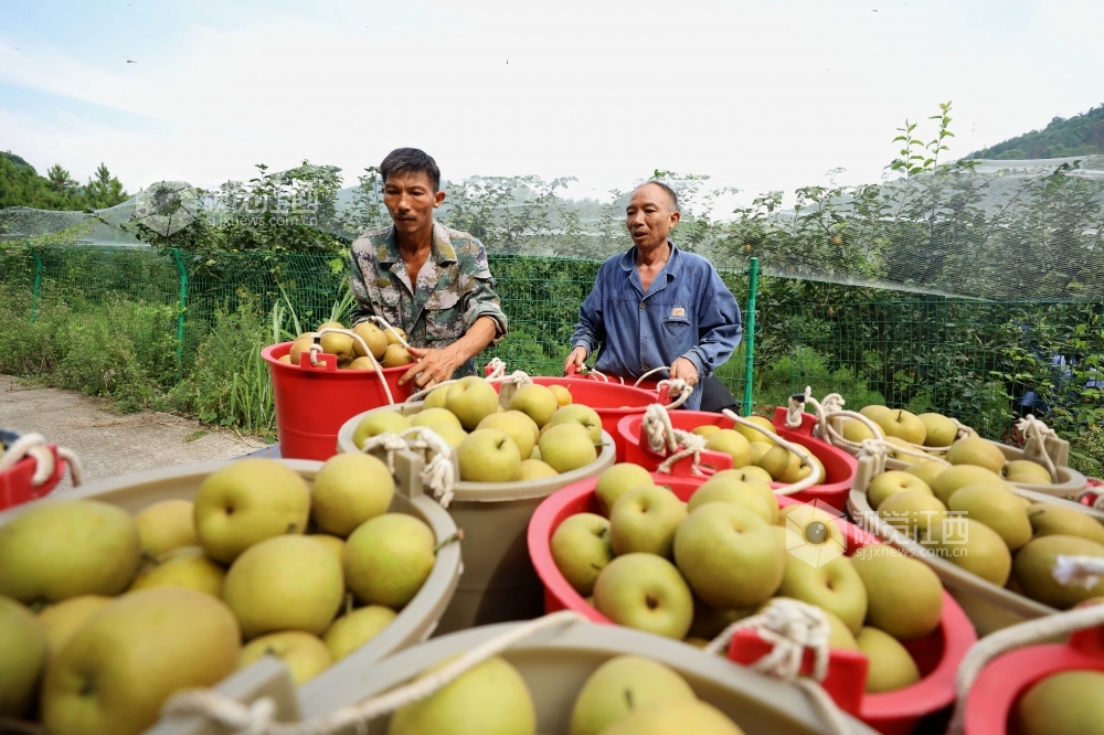 7月17日,江西省分宜县洞村乡程家坊村产业扶贫基地翠冠梨喜获丰收,果农抢抓时机采摘供应市场,确保丰产增收。