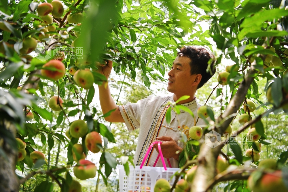 2020年7月20日,在江西省上饶市铅山县太源畲族乡蟠桃园里,畲民正在摘蟠桃。目前,正是当地蟠桃成熟时节,当地畲民种植的蟠桃陆续上市,果树种植成为当地畲民增加收入的有效途径。