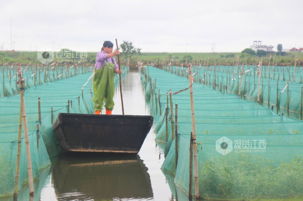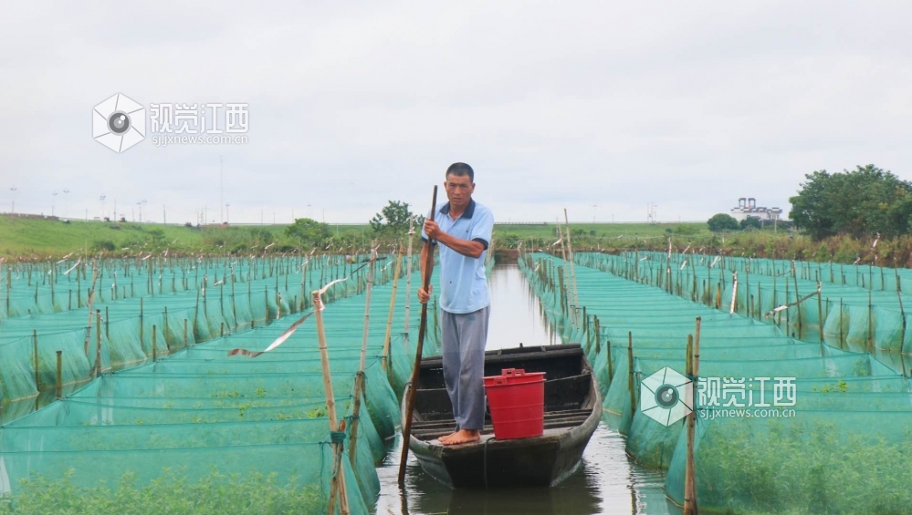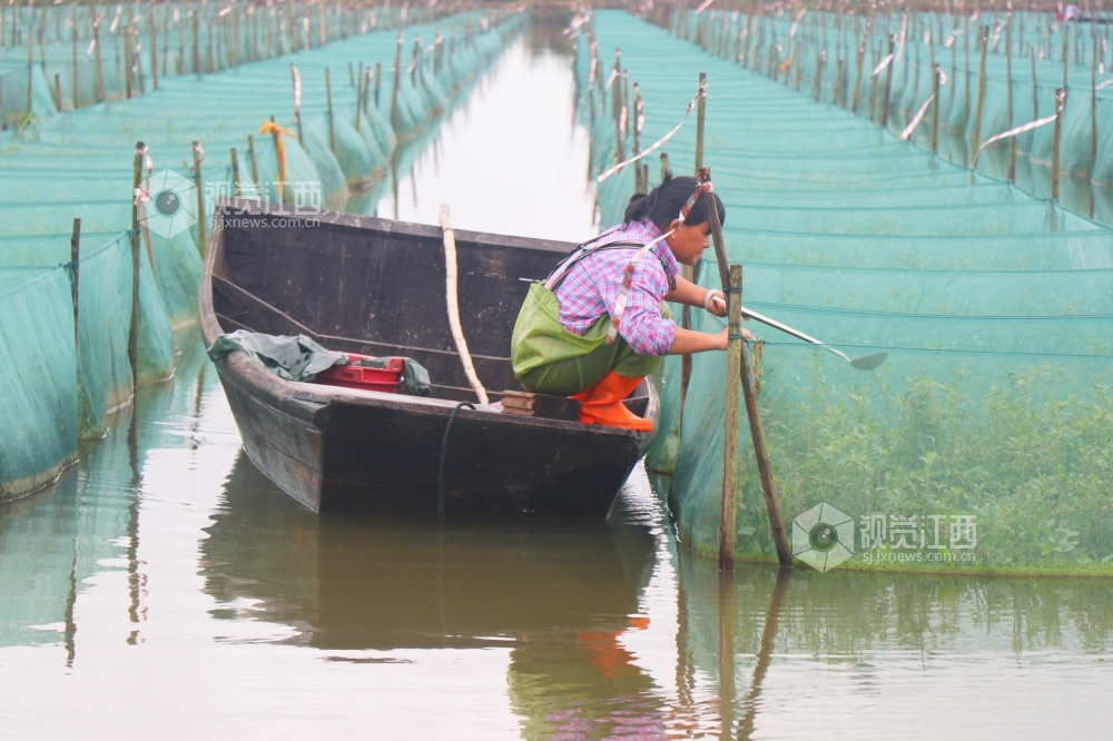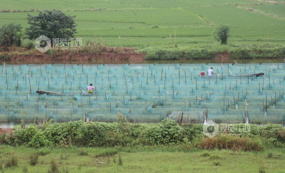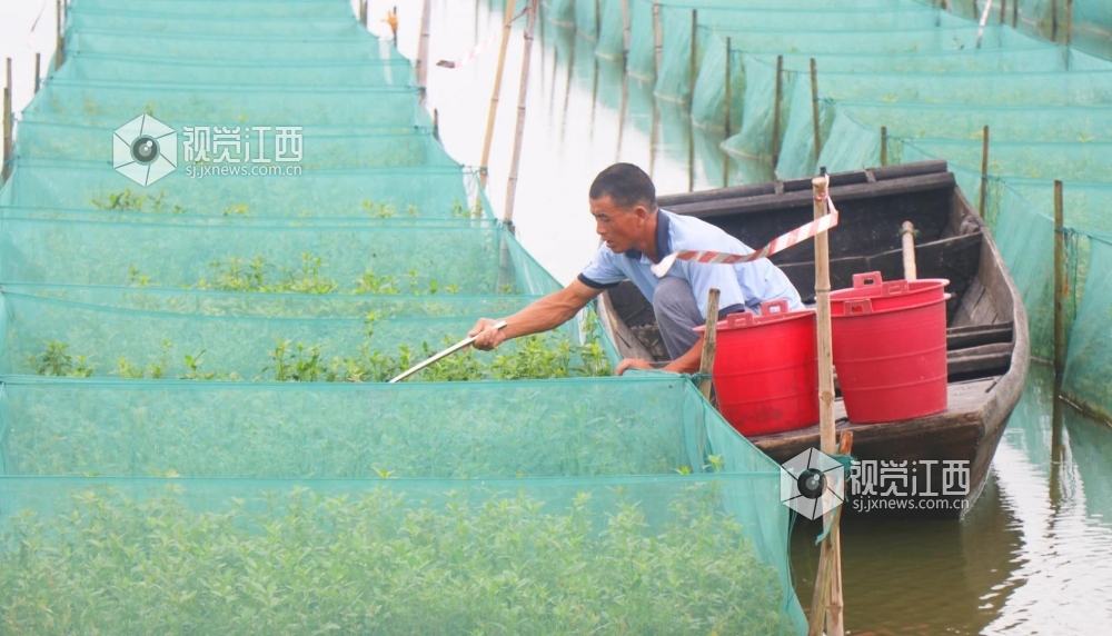7月20日,江西省余干县康山垦殖场网箱鳝鱼养殖基地,农户正在喂食作业。江西省余干县依托丰富水面资源,大力支持发展特色水产养殖,带动贫困户脱贫致富。