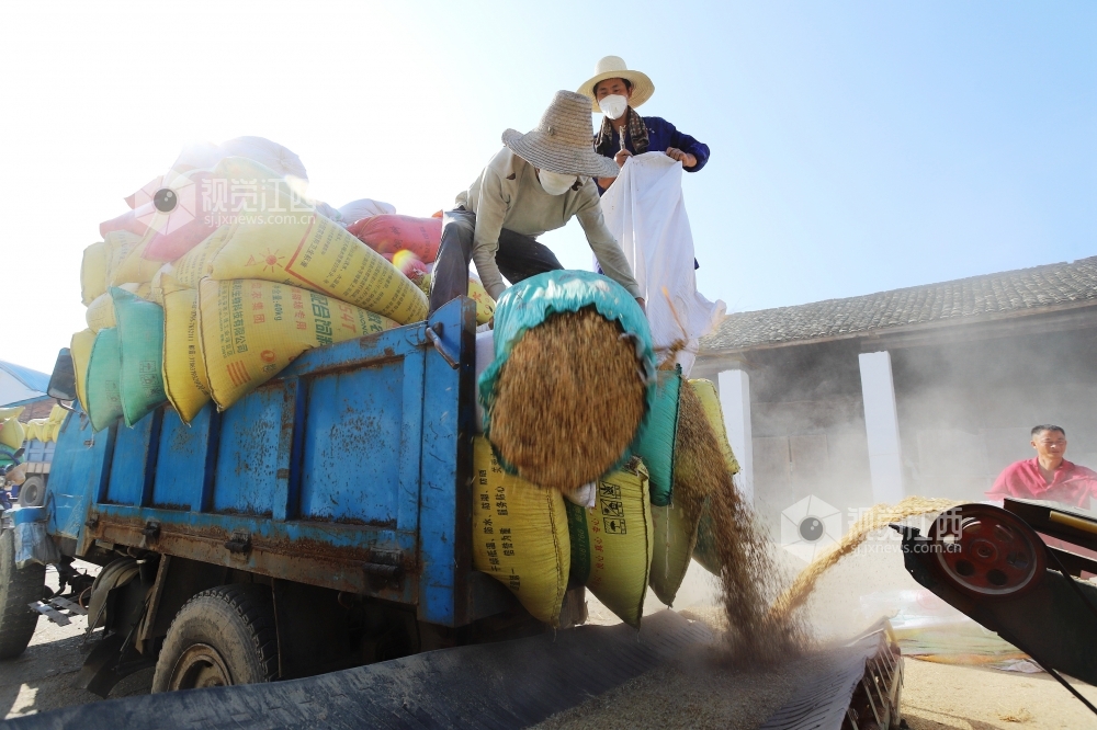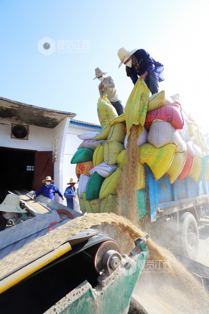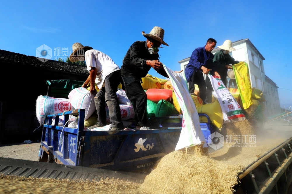 7月22日,江西省安福县甘洛乡粮农在一家粮企售粮。今年,该县在认真落实国家扶持双季稻生产、上调籼稻最低收购价等惠农强农政策的基础上,出台了一系列配套措施,调动了全县农民种粮积极性,全县早稻种植面积突破36万亩,平均亩产均在450公斤左右,预计全县今年总产可达16.2万吨,较去年增长2.5%。