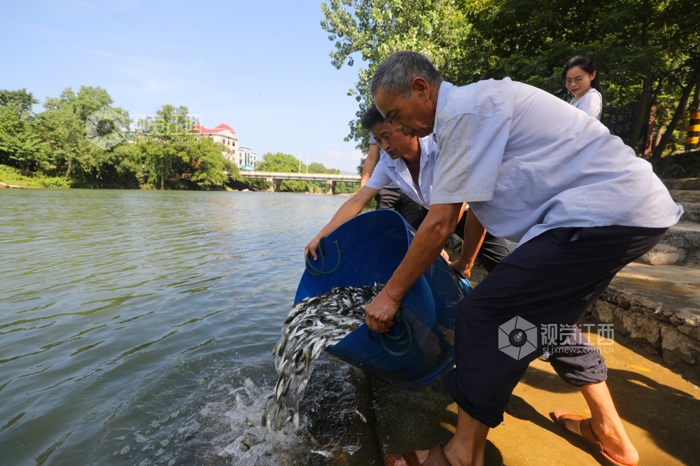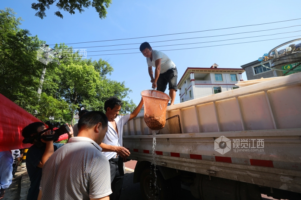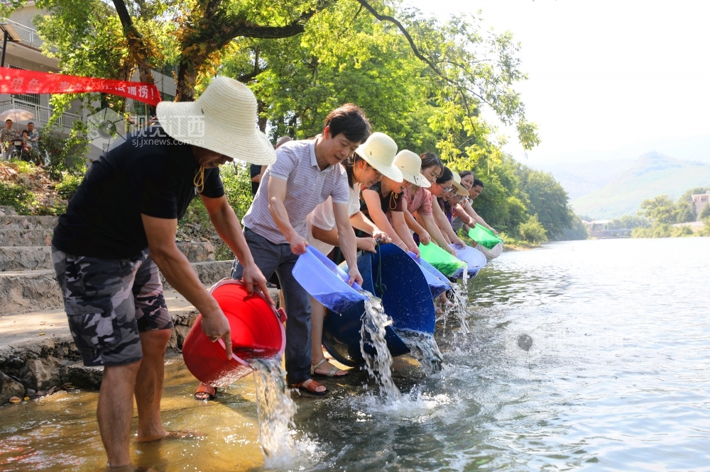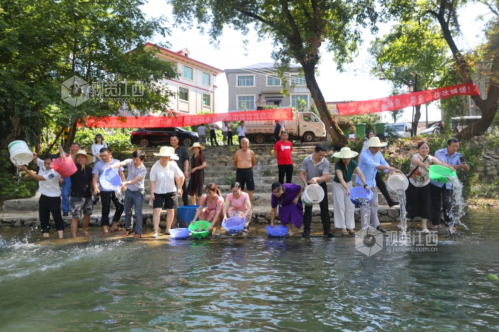 7月23日上午,在江西省莲花县莲江汤渡段,该县农业农村局工作人员和市民一起小心翼翼地将一盆盆鱼苗投放进莲江。此次共投放420万尾青鱼、草鱼、鲢鱼、鳙鱼等鱼苗,以维护当地生物多样性,改善水域生态环境。