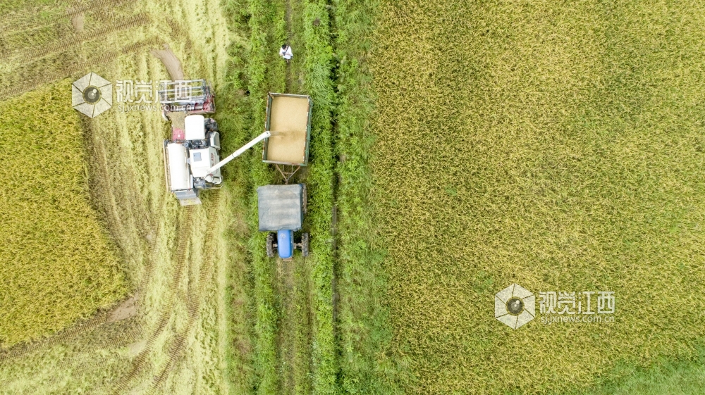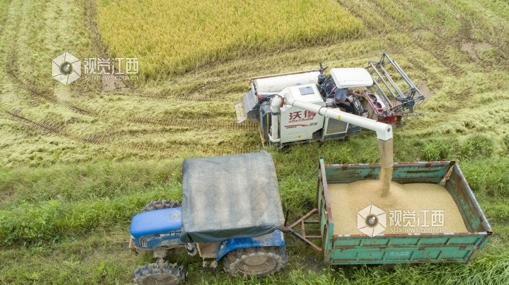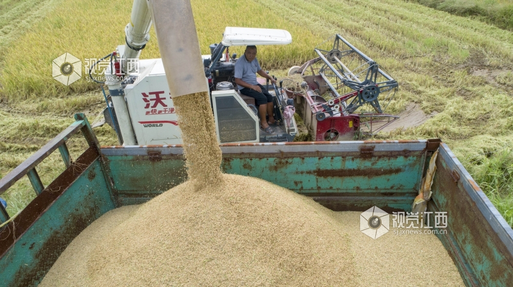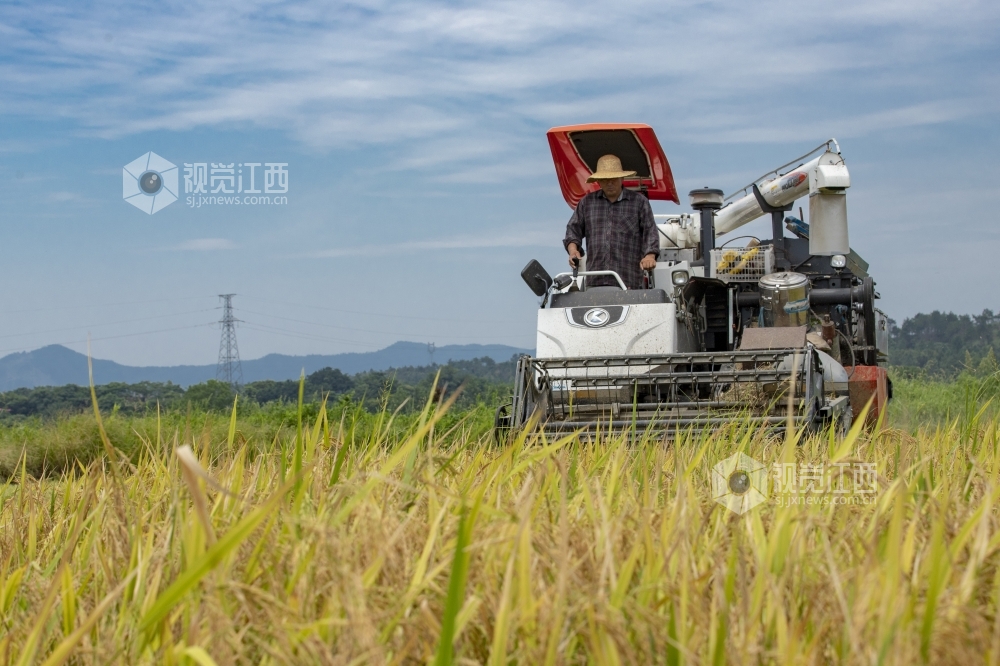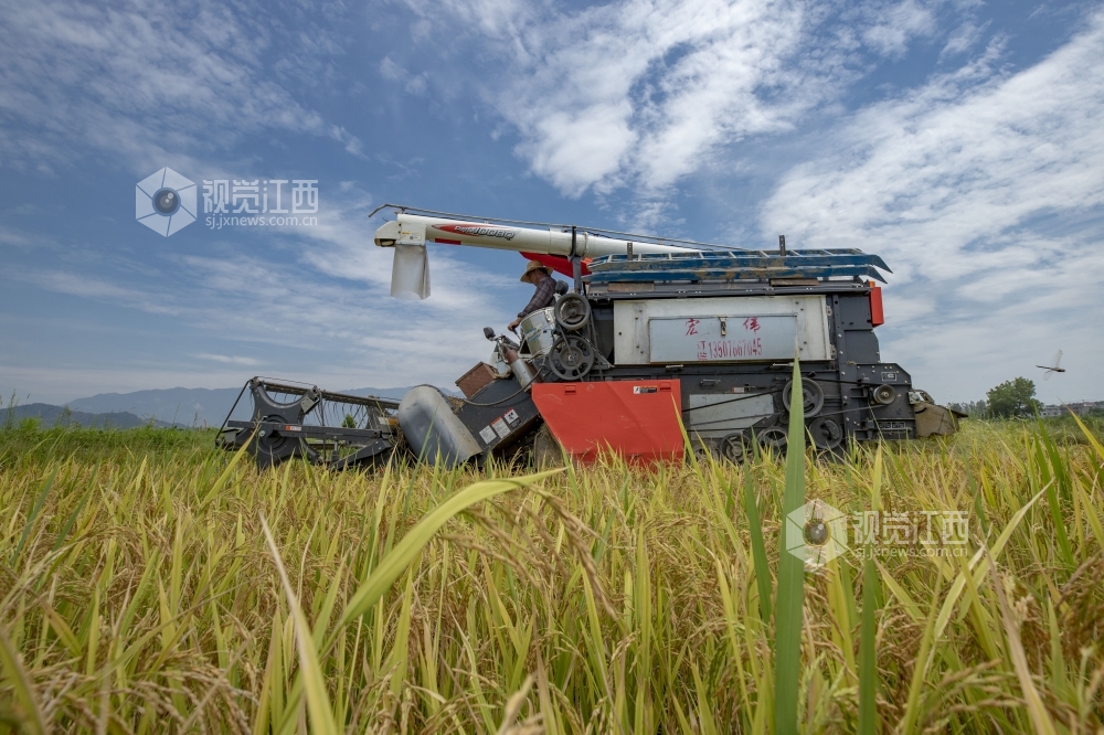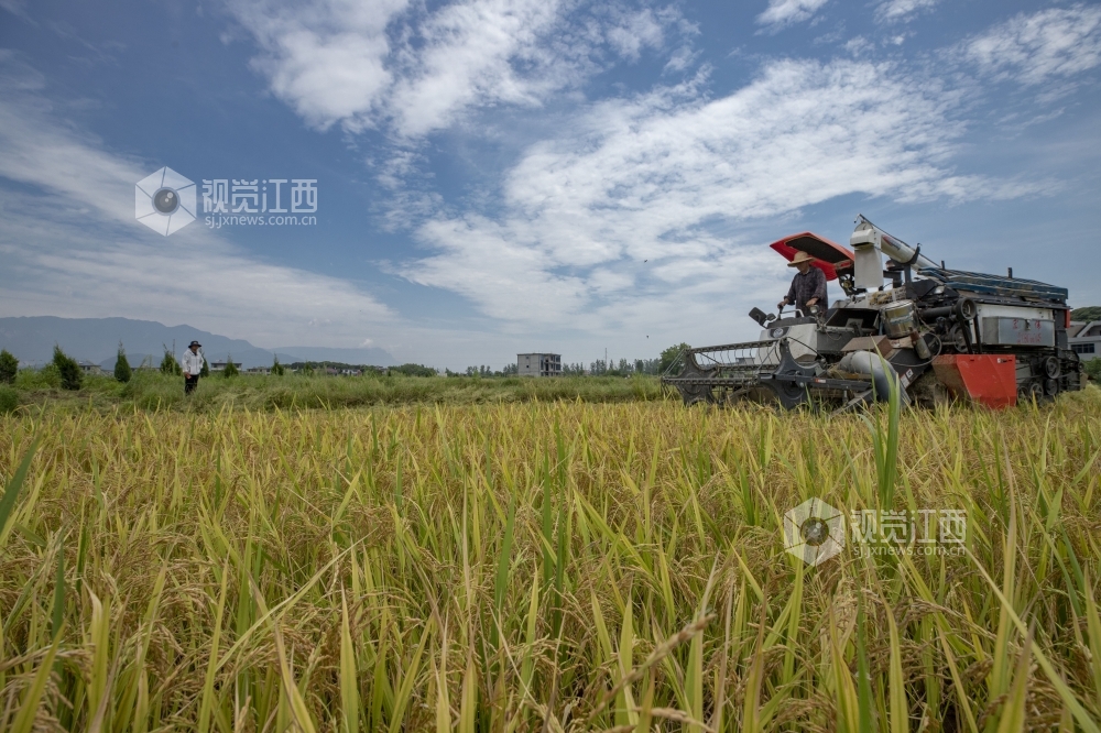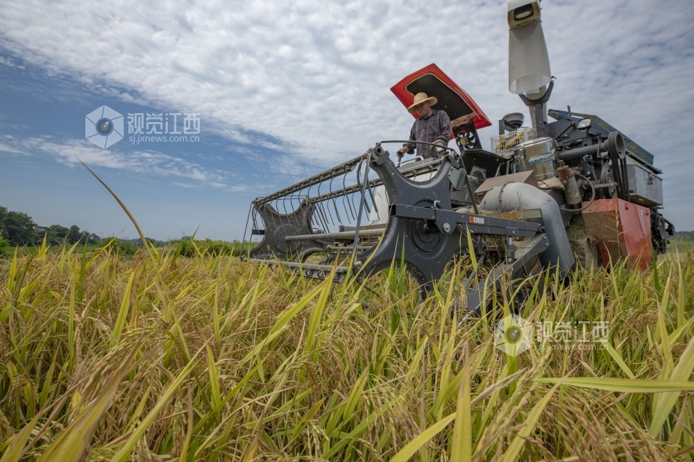 7月23日,江西庐山市星子镇,招星粮食种植农民专业合作社社员驾驶收割机抢收早稻。受鄱阳湖持续高水位和连续降雨影响,庐山市早稻受灾严重。当地农业部门迅速组织专业合作社、农机大户开展自产自救,及时排涝,抢收早稻,确保将洪涝灾害对粮食生产的不利影响降到最低。