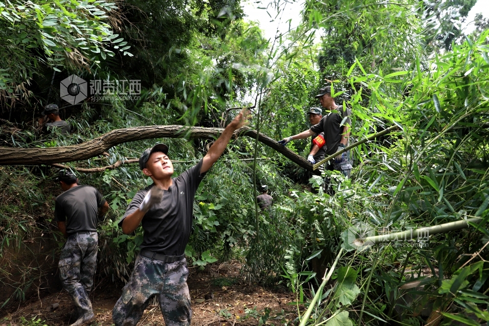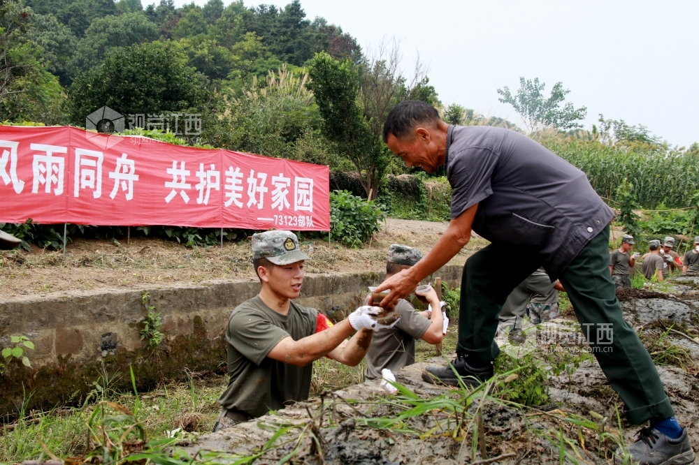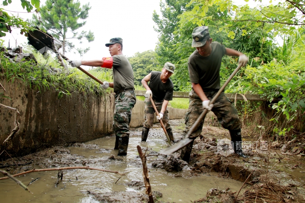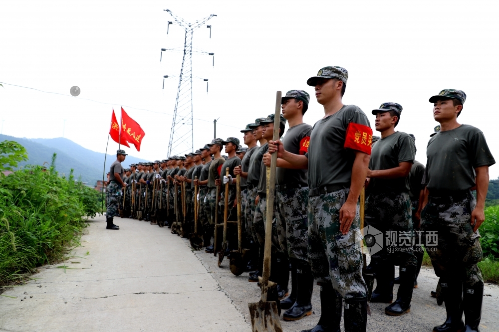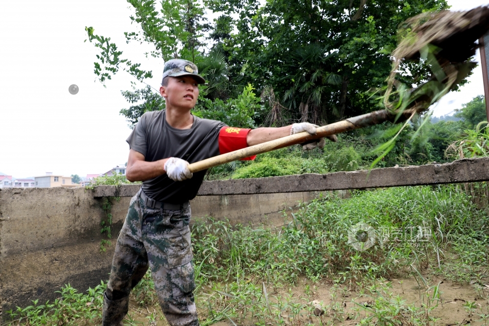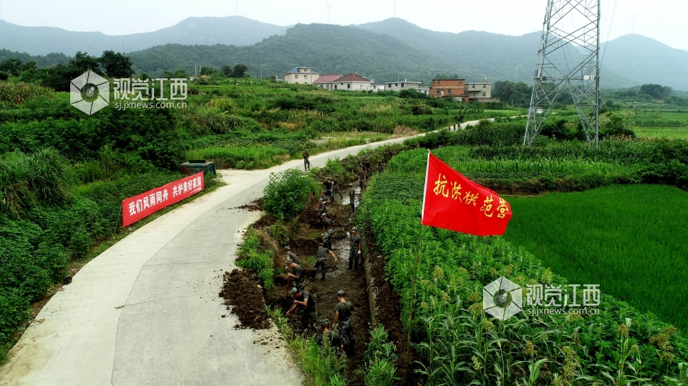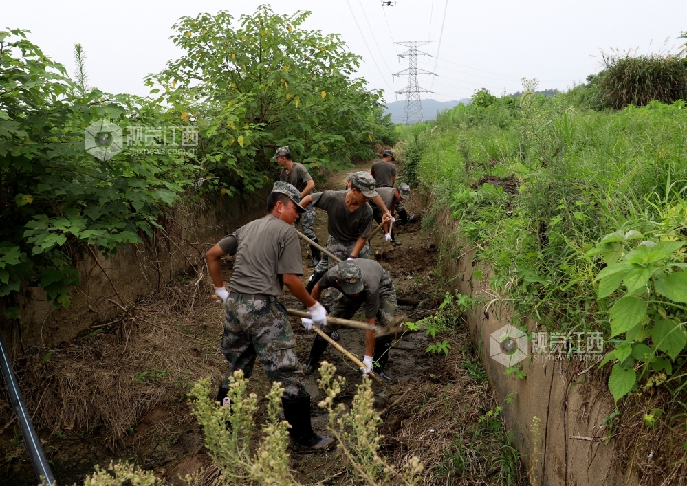 2020年7月25日,驰援湖口县抗洪抢险一线的某部队“抗洪模范营”百名官兵携带铁铲、镰刀等工具驱车赶到该县付垅乡殷山村,清理殷山水库灌渠内的垃圾和淤泥。随着鄱阳湖、长江水位持续下降,子弟兵们一边坚守在抗洪抢险一线,一边帮助地方灾后恢复生产生活。