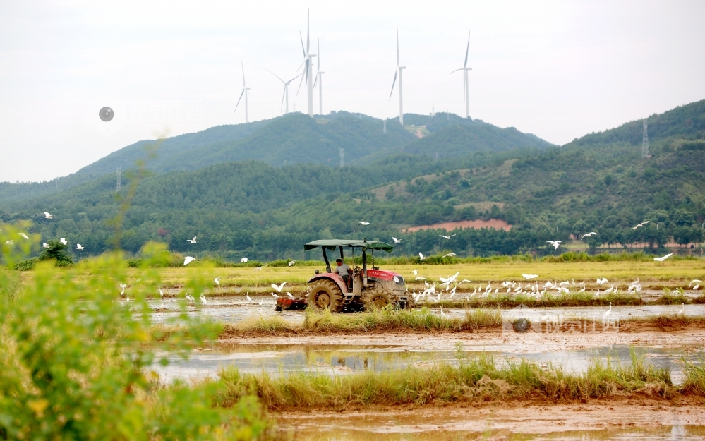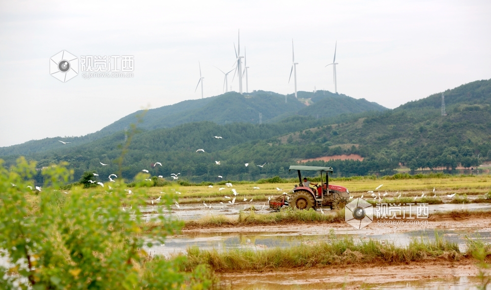 2020年7月30日,江西省吉安市吉水县醪桥镇袁家村早稻收割后,村民正抓紧时间翻耕农田,一群白鹭在耕田机旁上下翻飞,构成一幅人鹭共处的和谐画面。江西省吉安市吉水县大力推进生态文明建设,强化河湖村庄环境建设,加大野生动物保护力度,全面营造水清、岸绿、河畅、景美的生态环境。