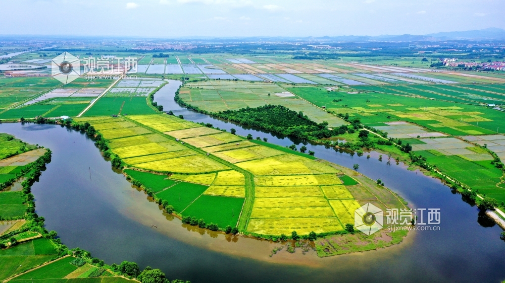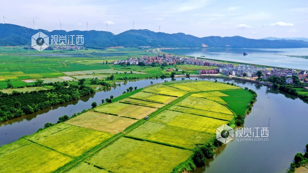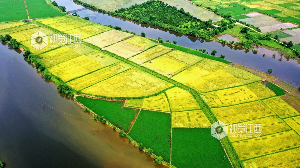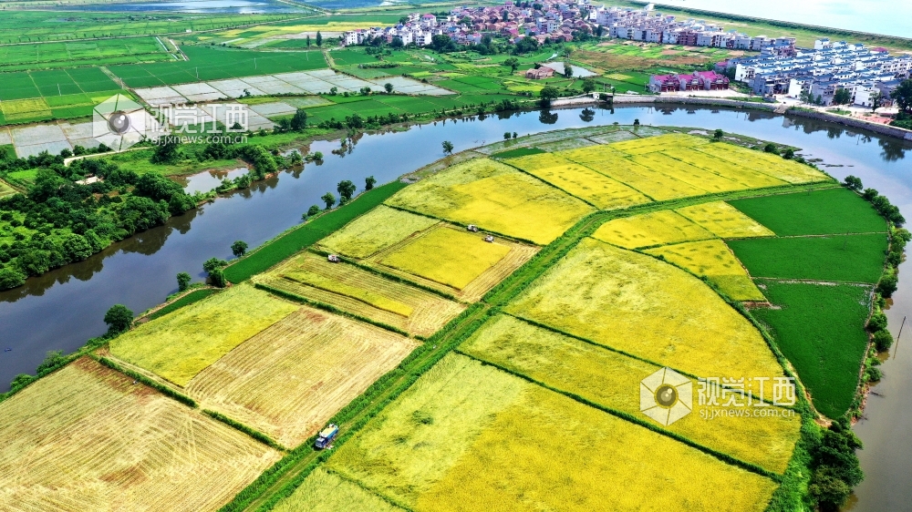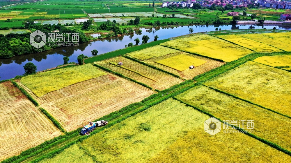 2020年7月30日,江西省吉安市吉水县盘谷镇菜园村赣江边一洄水湾农田内收割机来回穿梭,村民正抢抓农时收割早稻,确保颗粒归仓。受前期雨水影响,江西省吉安市吉水县部分早稻收割较晚,当地粮农抢抓农时及时收割,以便尽快播种晚稻,确保今年粮食丰收。