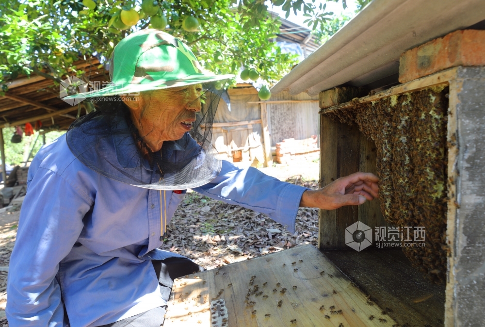 7月31日,在江西省莲花县荷塘乡井下村坳背山上,年近七旬的朱庚生正忙着照顾自己养的30多箱蜜蜂。朱庚生一家以前因为缺钱缺技术,被评定为贫困户,在帮扶干部的支持下,他来到这里养殖蜜蜂、土鸡、鱼,还种上了橘子、杨梅、油茶树,把这片荒山荒坡改造成小农场,一家人的日子越过越甜。