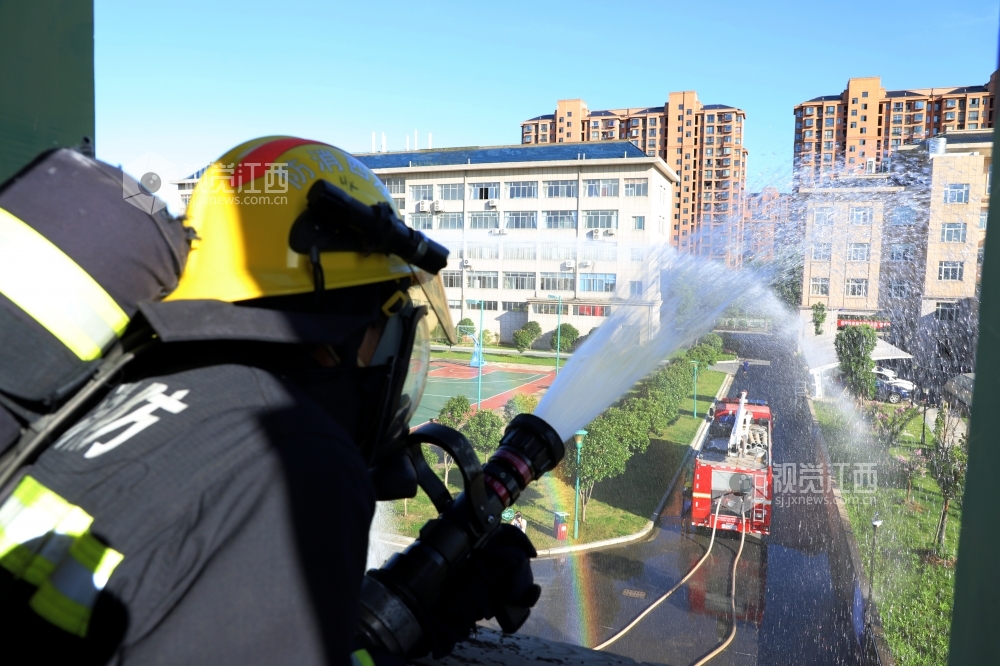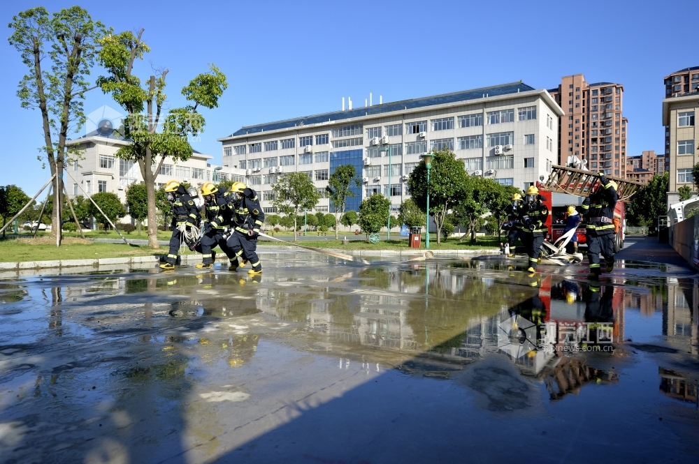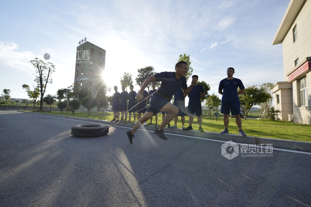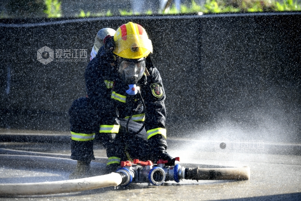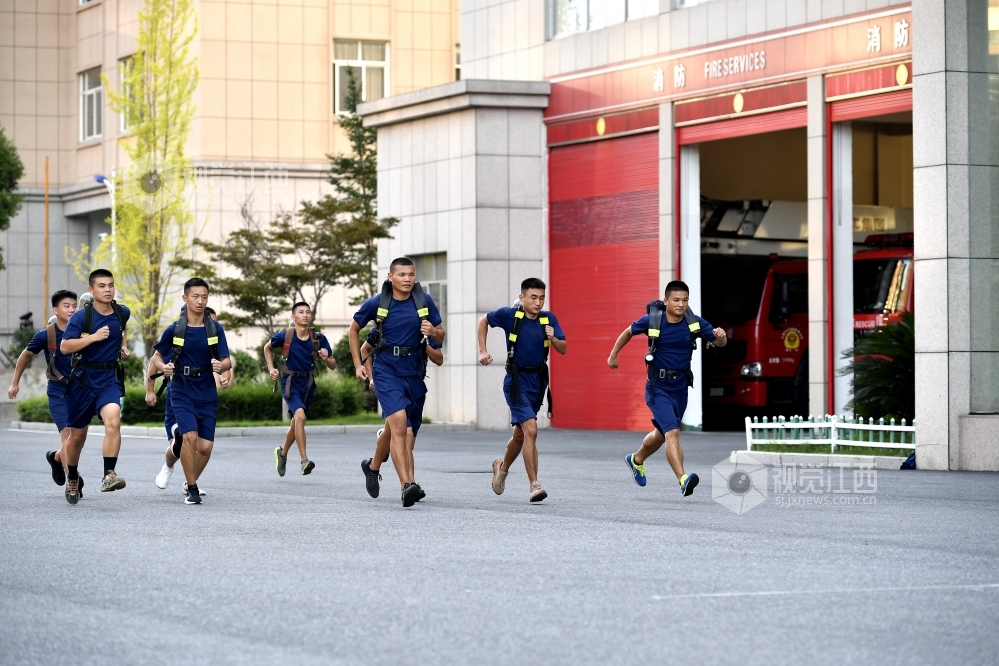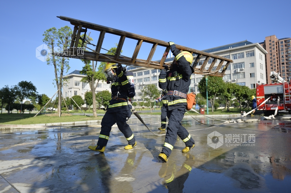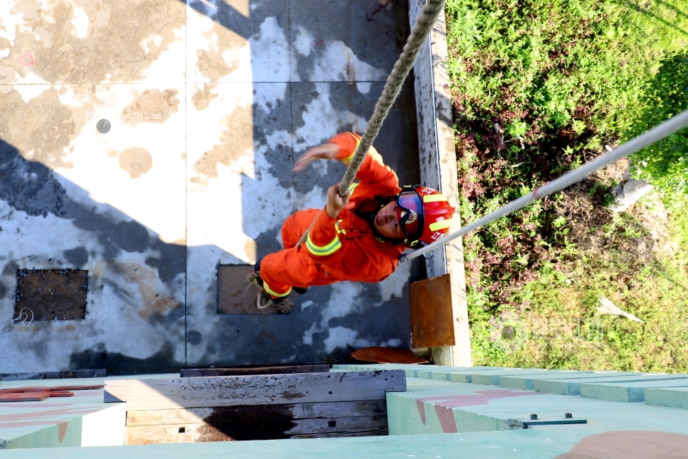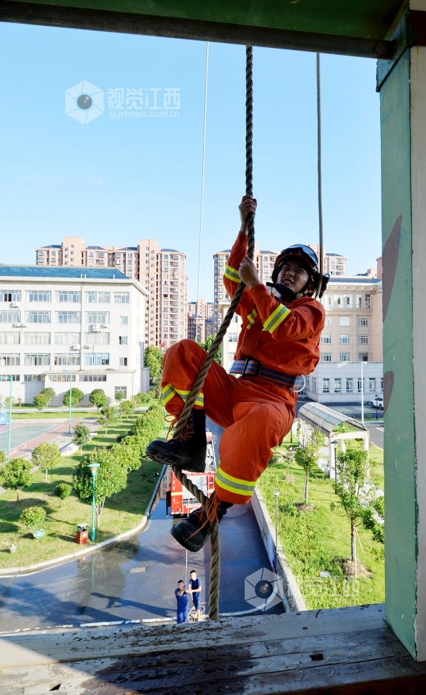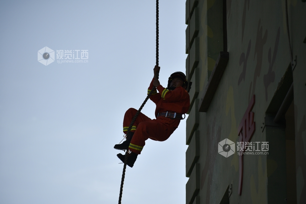 2020年7月31日,江西省九江市湖口县消防救援大队石钟山大道消防救援站,身着火焰蓝制服的消防队员们在训练场进行爬绳、登楼灭火等日常训练,努力锻造一支召之即来、来之能战、战之必胜的“火焰蓝”铁军 确保在党和人民需要的时候拉得出、上得去、打得赢。