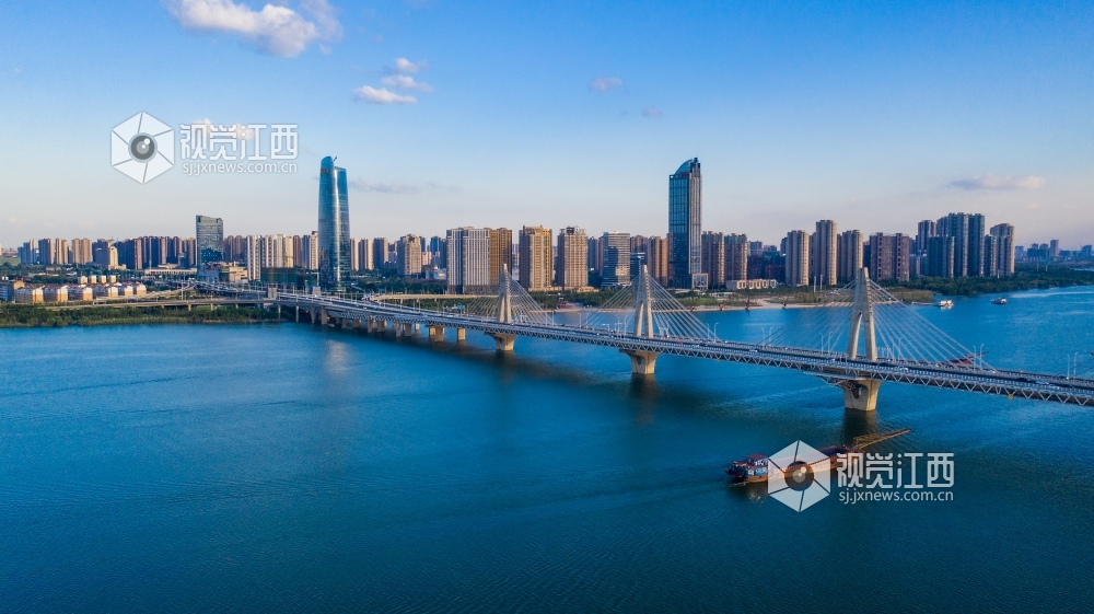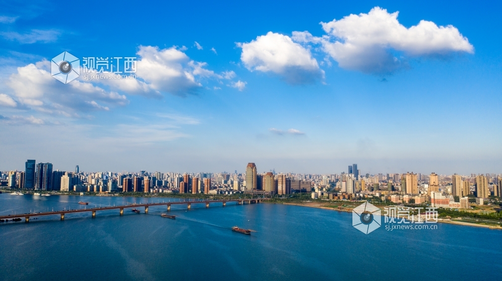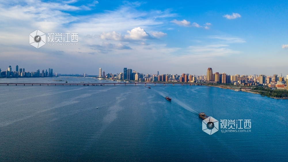 2020年8月2日,南昌市赣江上空天空蔚蓝,呈现蓝天白云美景。