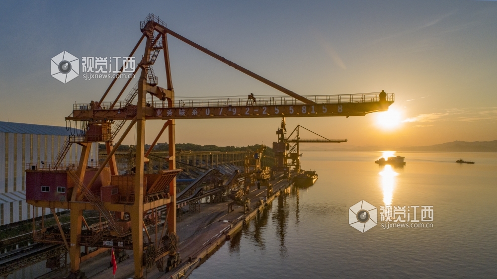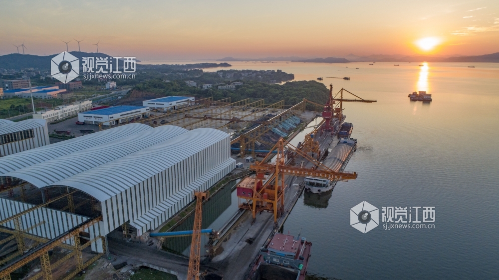 8月3日,江西省鄱阳湖畔,庐山市工业园区码头航拍。晨曦之下主航道水天一色、熠熠生辉。当地秉承绿水青山就是金山银山的发展理念,大力推进生态、环保和科技型工业发展。连日来在抓好防疫、防汛工作同时庐山市全力以赴推动经济发展,黄金水道日渐繁忙。