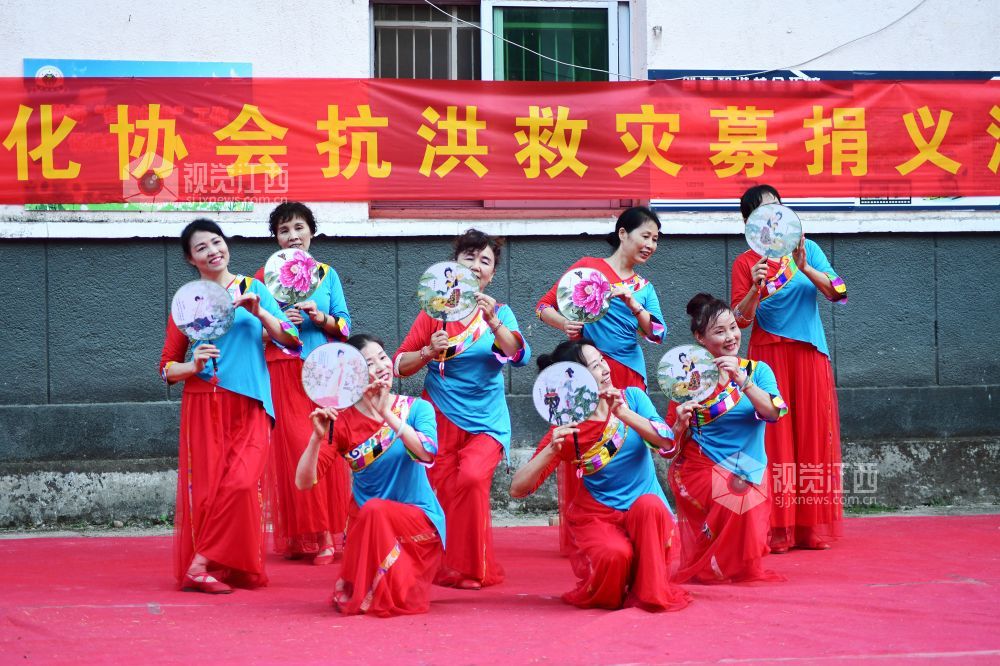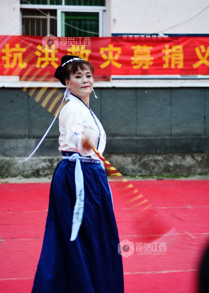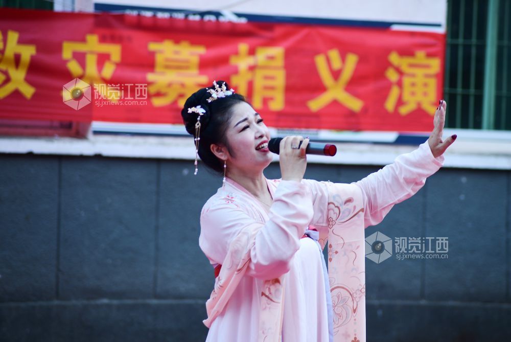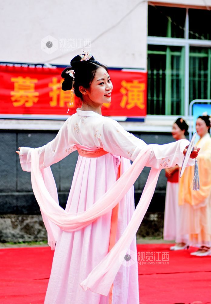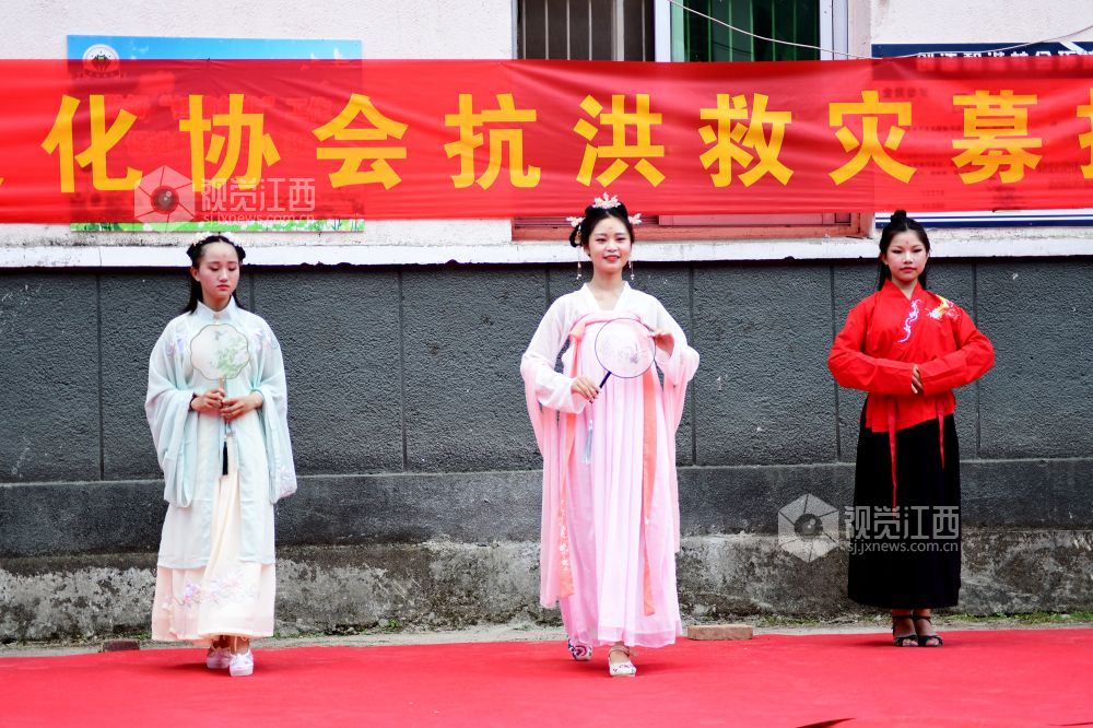 2020年8月1日,在江西省上饶市铅山县武夷山镇西坑村,该县汉服文化协会志愿者正在义演。7月的山洪让铅山武夷山镇西坑村受灾严重,民房进水,民众生产生活都受到影响。为让西坑村受灾的群众得到更多的帮助,极大地提振了西坑村人民群众恢复生产生活的信心,该县举办此次义演和捐赠活动。据悉,本次义演募捐活动共募得善款28550元。