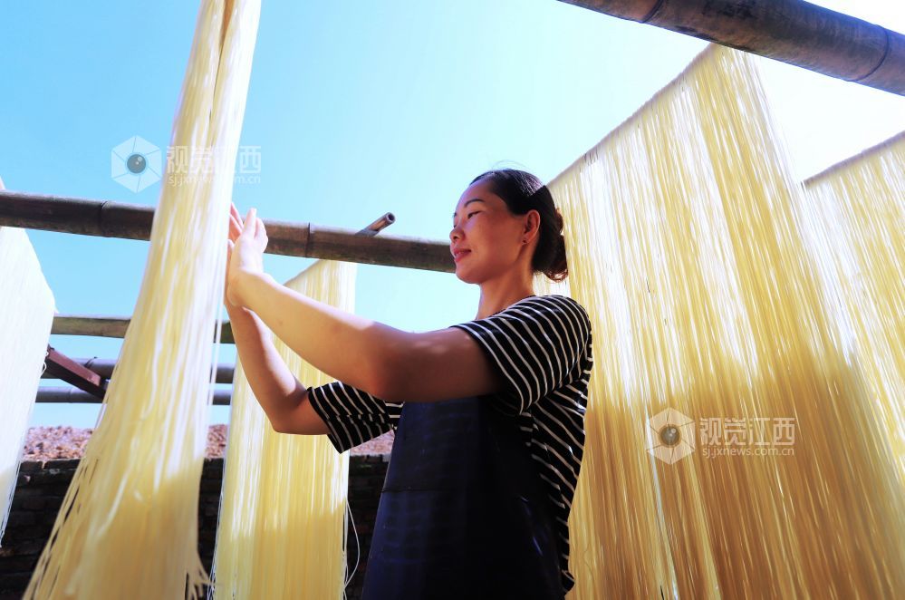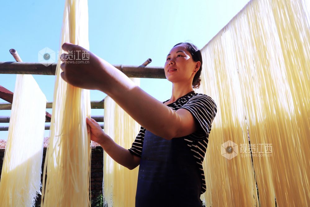 8月4日,江西省安福县平都镇江南村村民温亮英在晾晒米粉。温亮英于2014年返乡创办大米加工厂,年生产米粉200余吨,通过线上线下销售,带动了当地120余户粮农增收。