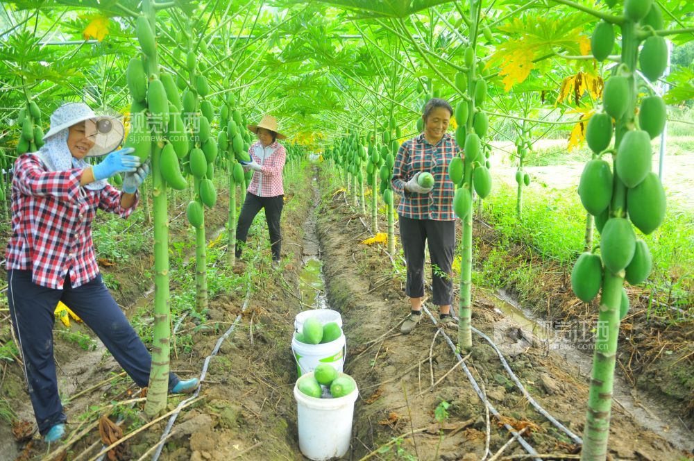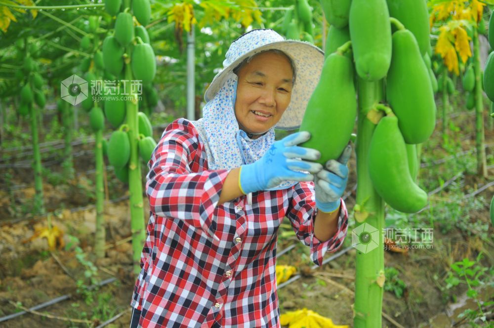 8月4日,在江西省全南县陂头镇正河村正和圩扶贫产业基地,贫困户廖义妹正在地里高兴地采摘木瓜。