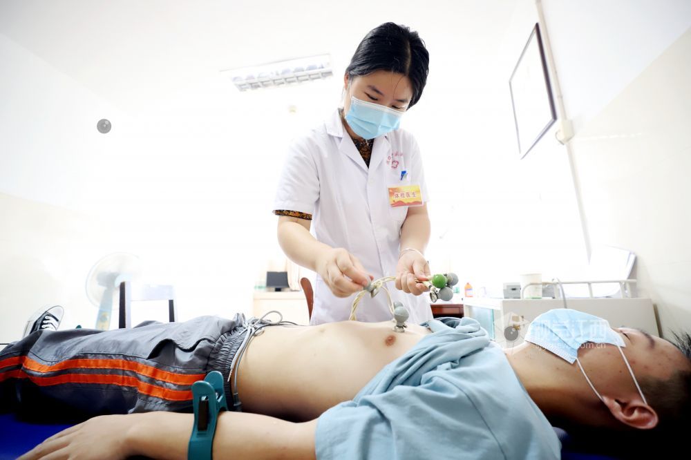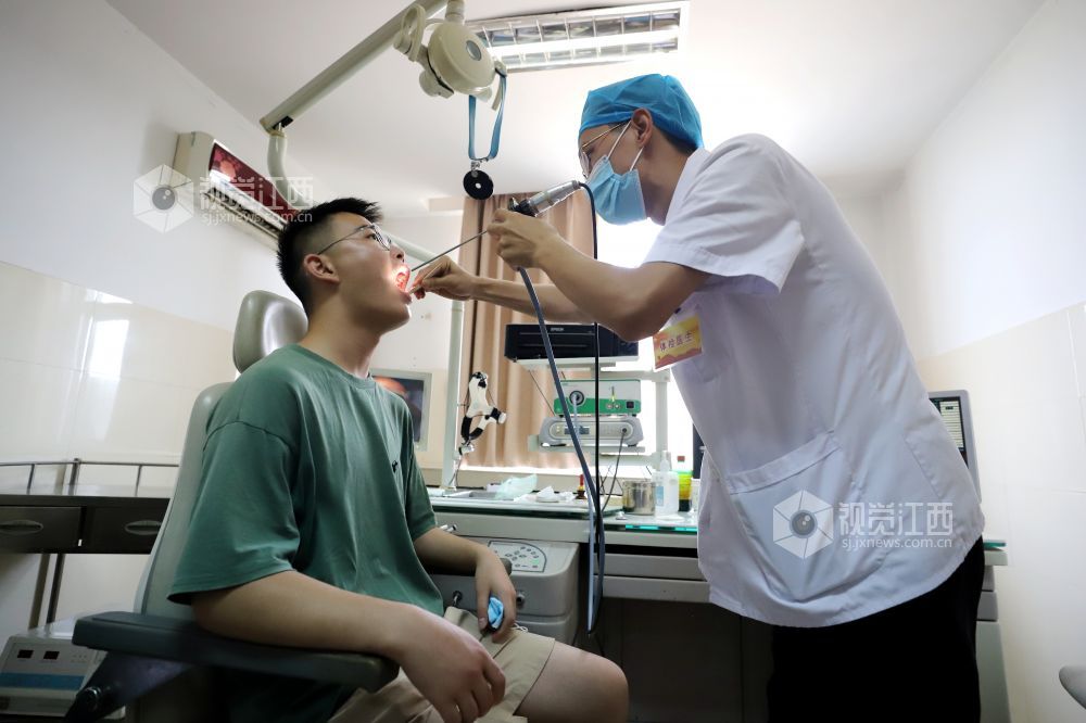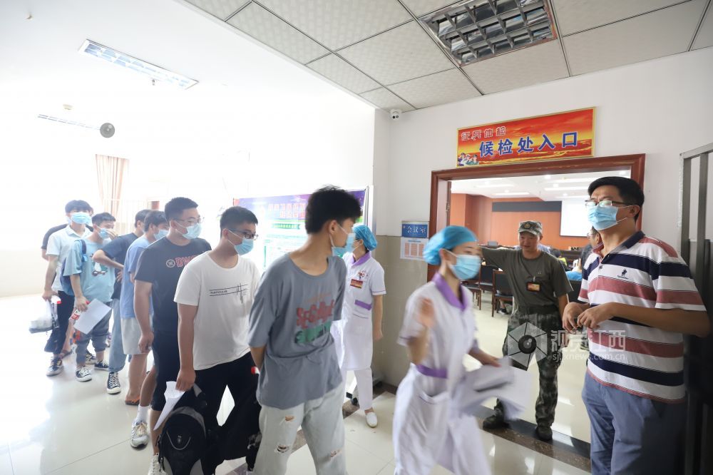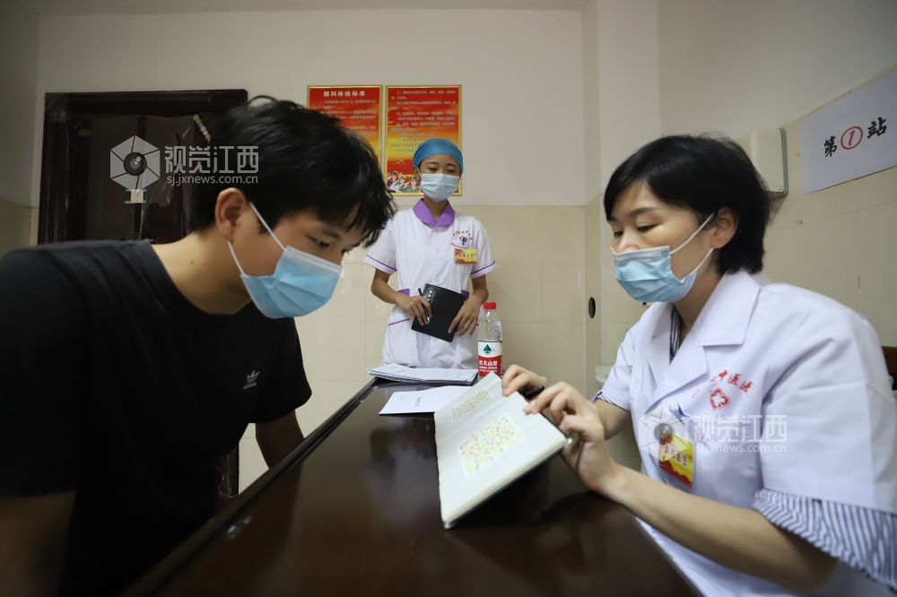 2020年8月5日上午,江西省九江市湖口县均桥镇80余名应征适龄青年在该县征兵体检站参加体检。在体检站,应征适龄青年全程佩戴口罩,在工作人员的引导、监督下,自觉有序地到各诊室进行内科、外科、口腔、耳鼻喉、眼科、心电图、B超、放射、检验、士兵职业适应性检测等项目的体检。