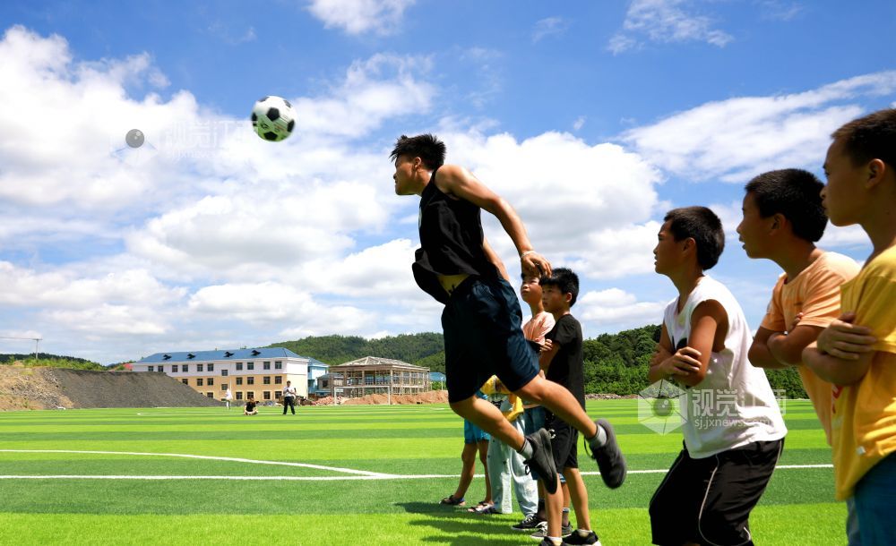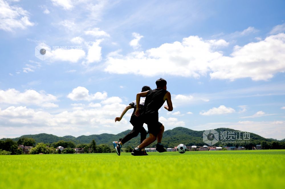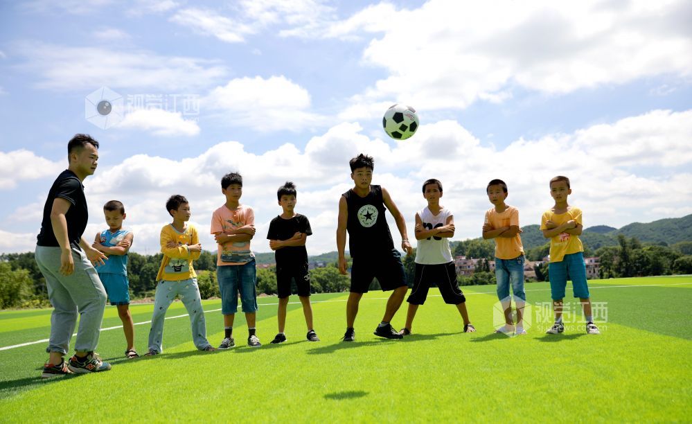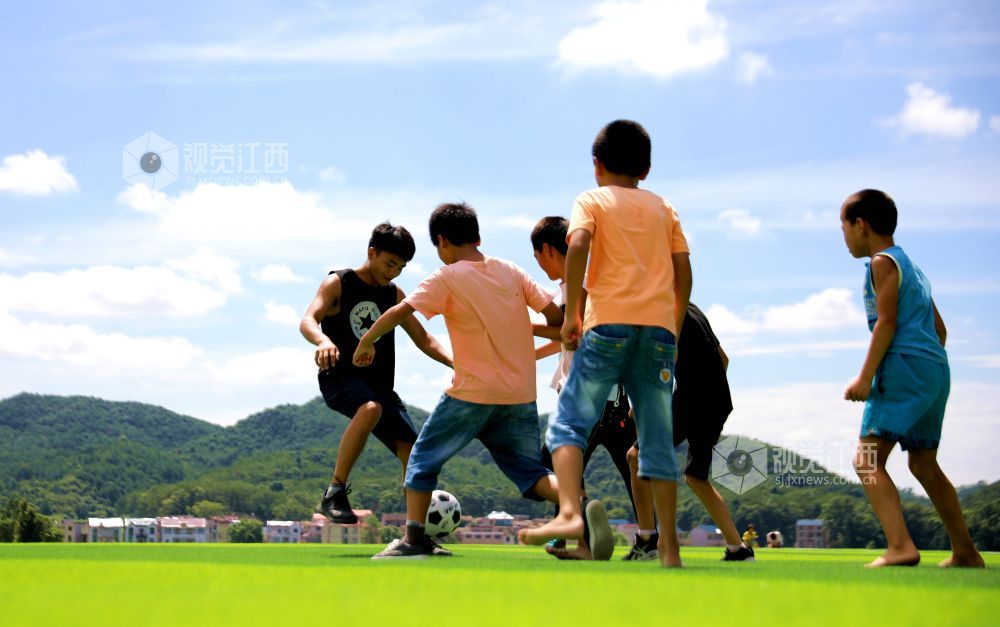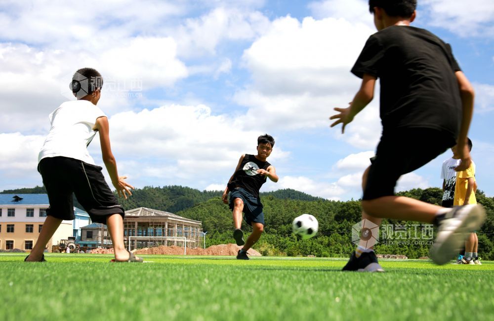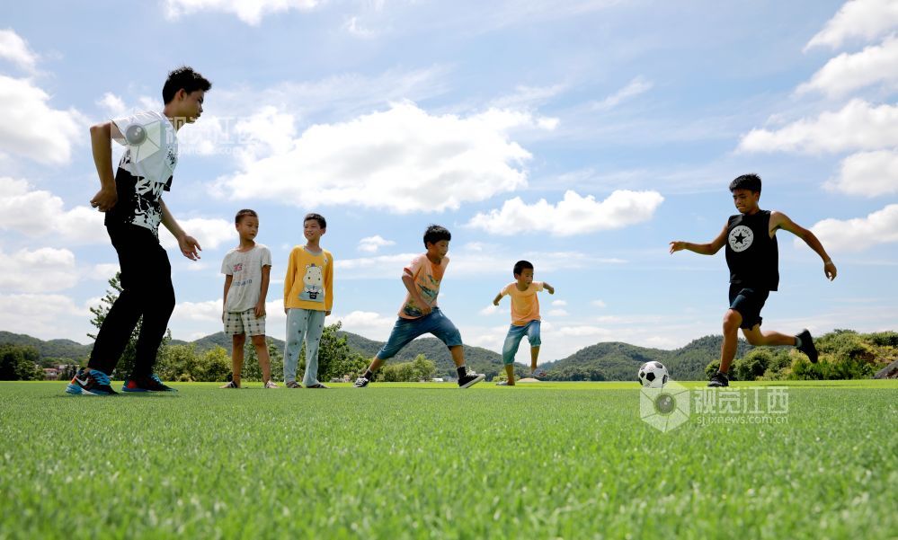 2020年8月6日,江西省吉安市吉水县阜田镇育贤村足球场,村里的孩子们正在练习足球。吉水县阜田镇育贤村积极争取中央预算内投资项目建设当地第一个乡村十一人制标准足球场。球场建成后,村内外的孩子们每天都要来到这里练习一番,现在这里已经成为当地农村孩子足球梦想开始的地方。