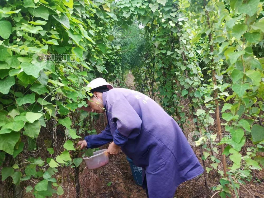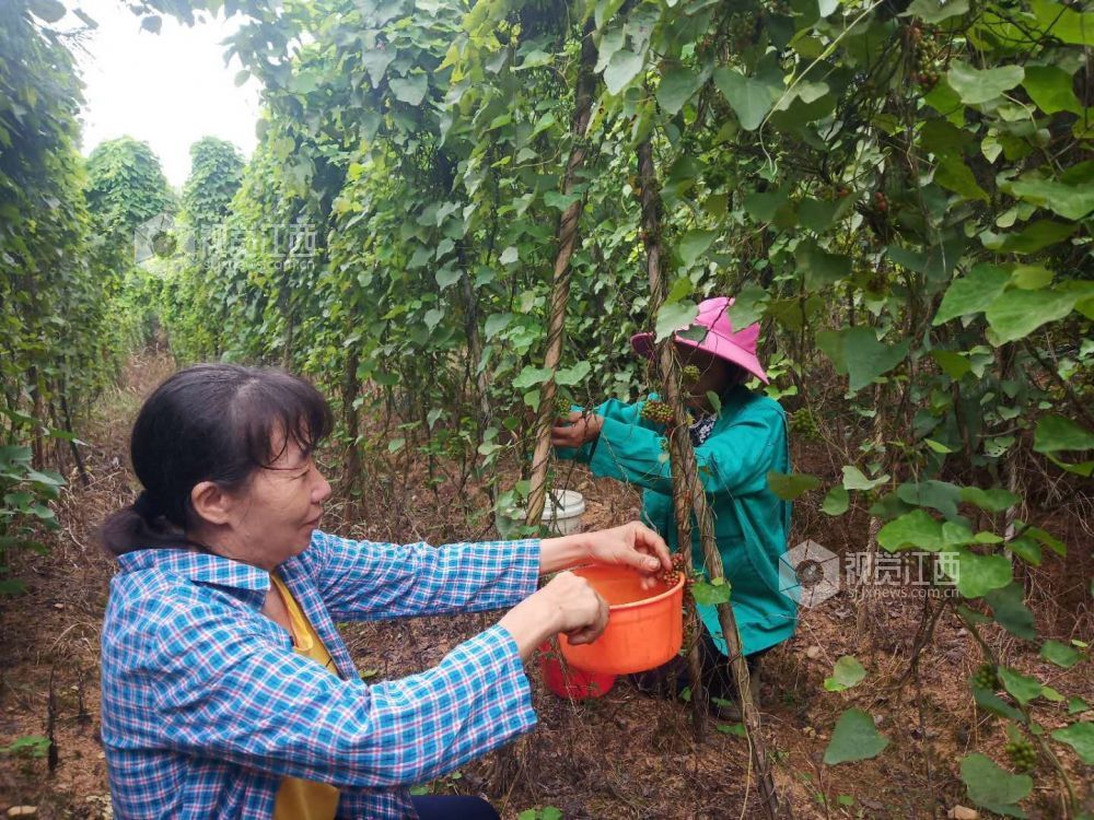 8月10日,在江西省安福县武功山林场樟树湾森林药材科技示范基地,林农正在采摘挂满一串串的粉防己果实。