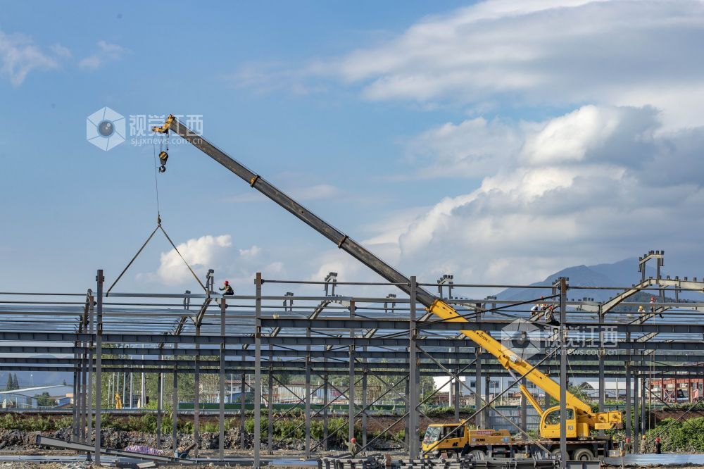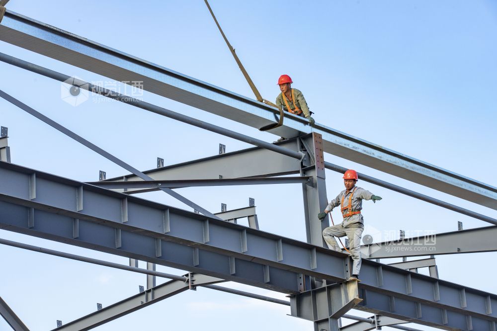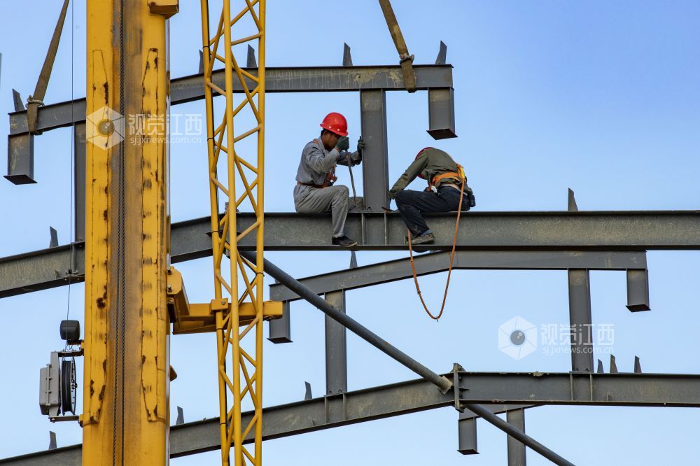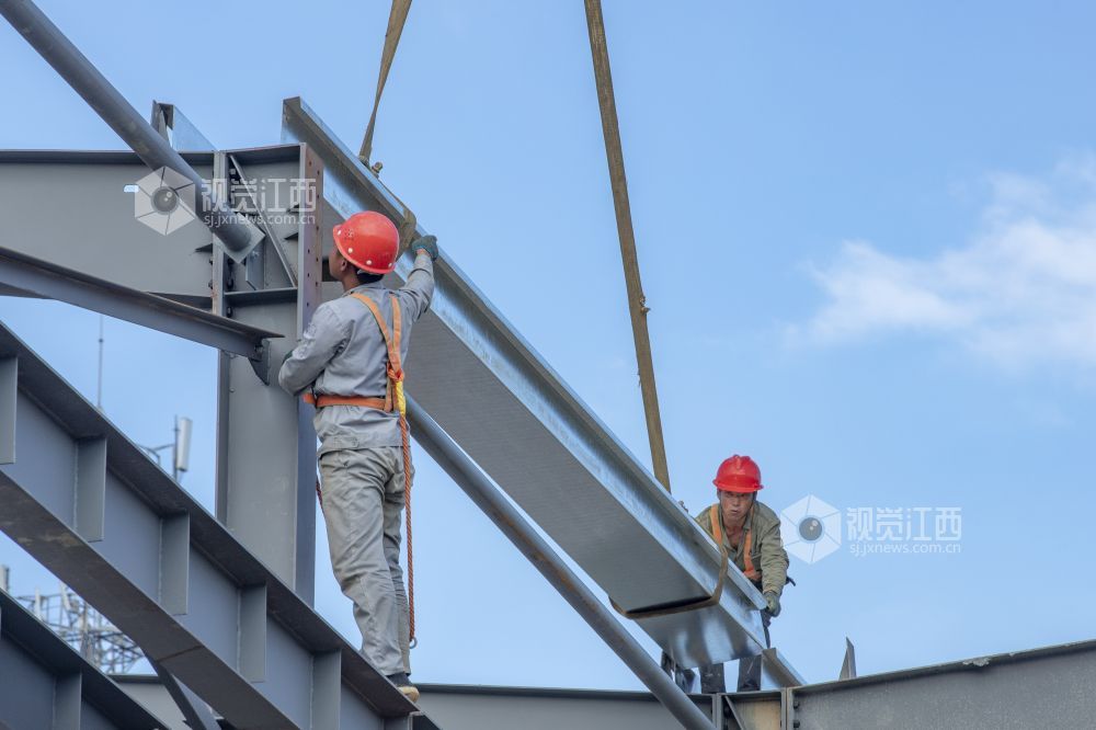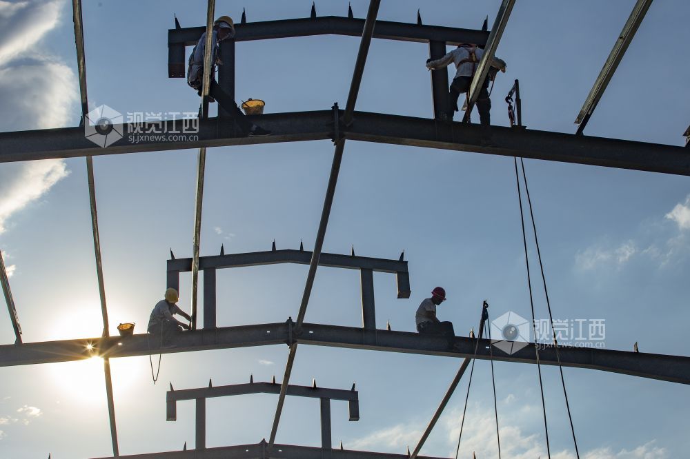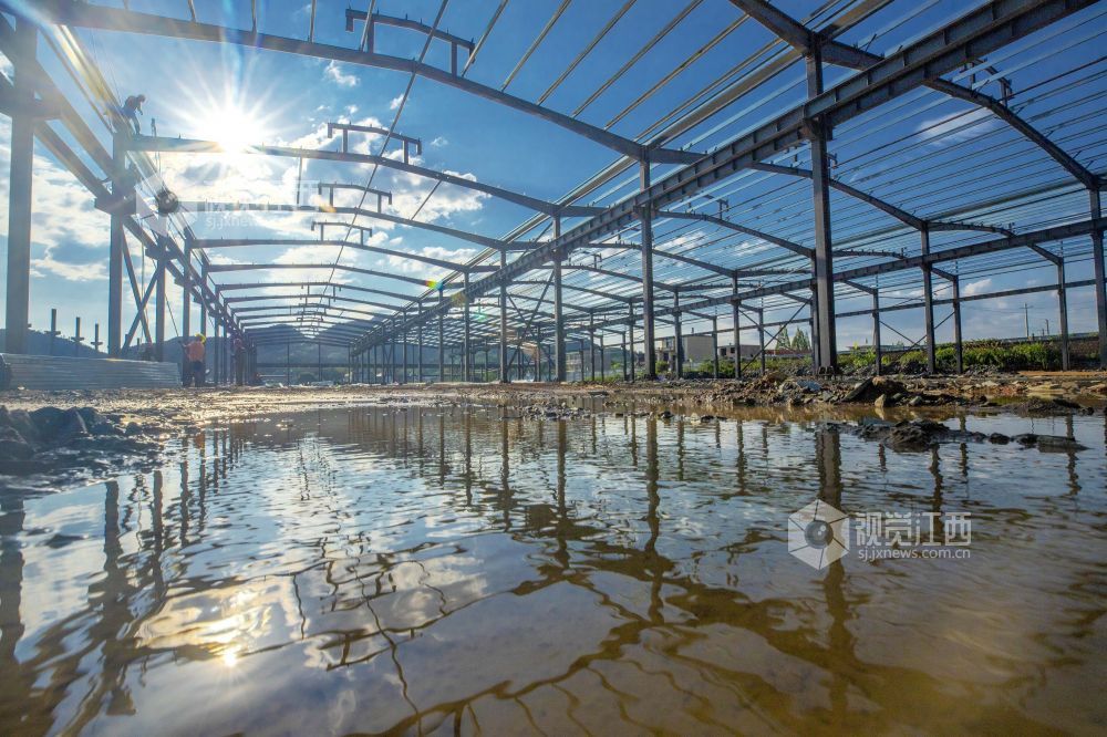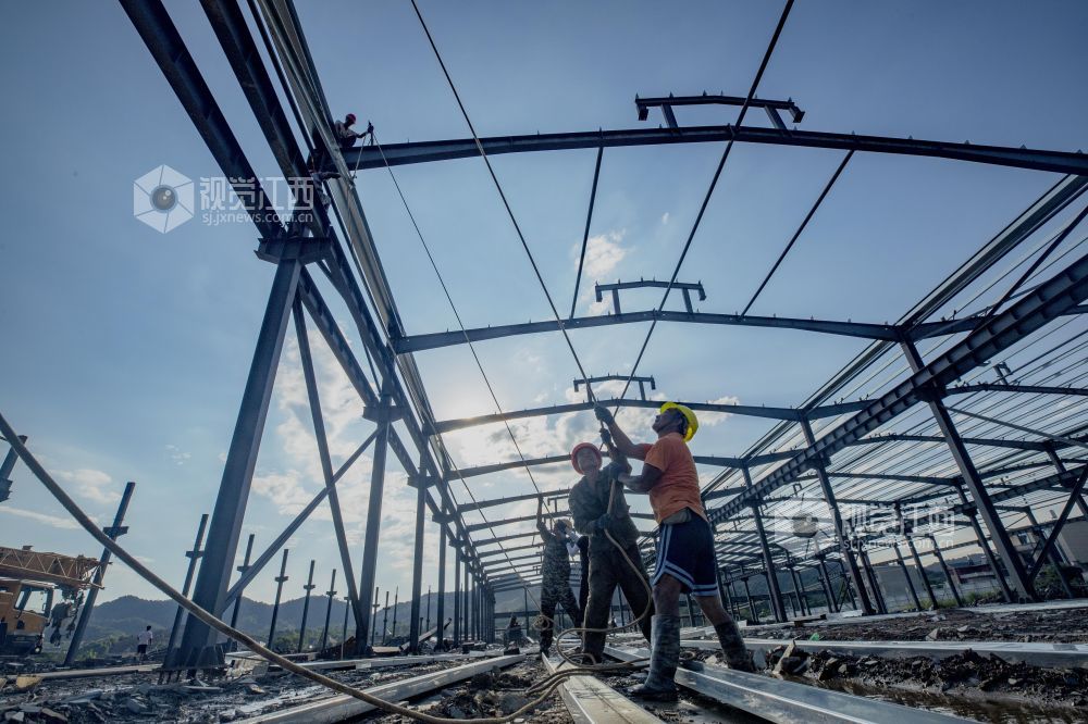 8月13日,江西省庐山市横塘镇和平村,工人们冒着高温酷暑抓紧推进板岩加工产业优化升级示范基地建设。当地克服新冠肺炎疫情和洪水灾害的不利影响,全力以赴抓好产业项目建设,大力推进乡村振兴。