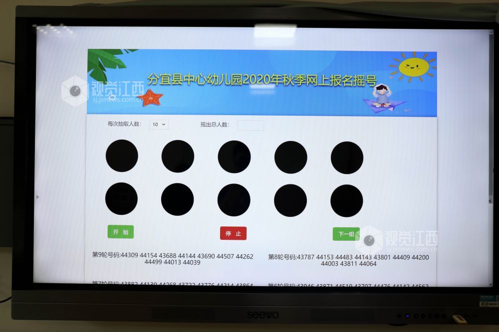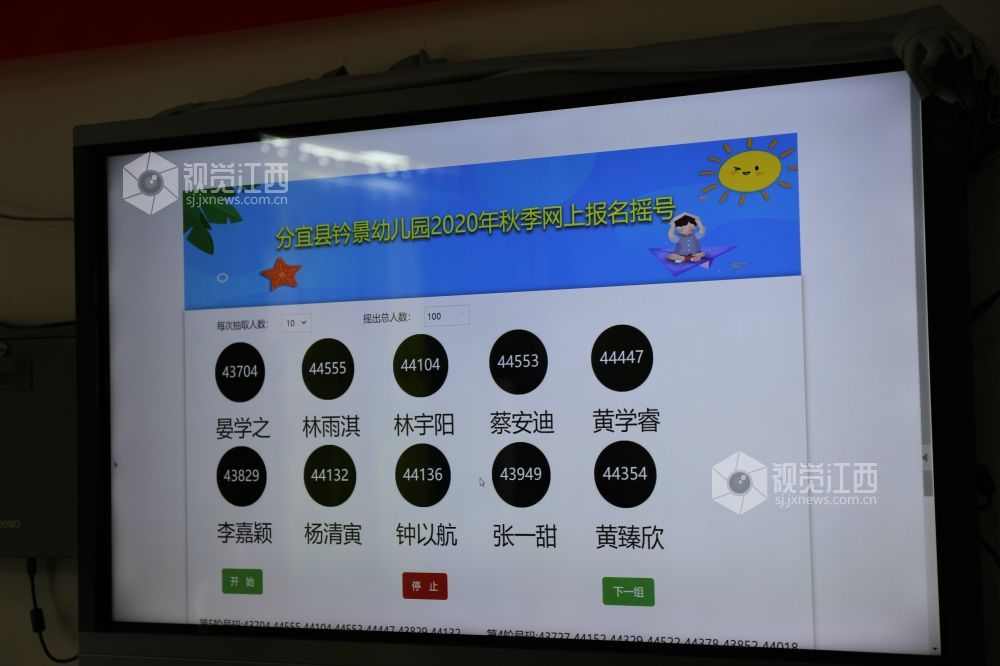 今年分宜县城区公办幼儿园新生网上申请报名人数共727名,以电脑抽号的方式招收190名幼儿,招生工作在县人大代表、政协委员、教体局纪检代表和家长代表全程监督下公平公开进行。每轮抽号由一名家长代表进行抽号,监督人员可通过现场的电子屏幕观看抽号过程,抽号结果由工作人员当场记录,之后张贴公示。
