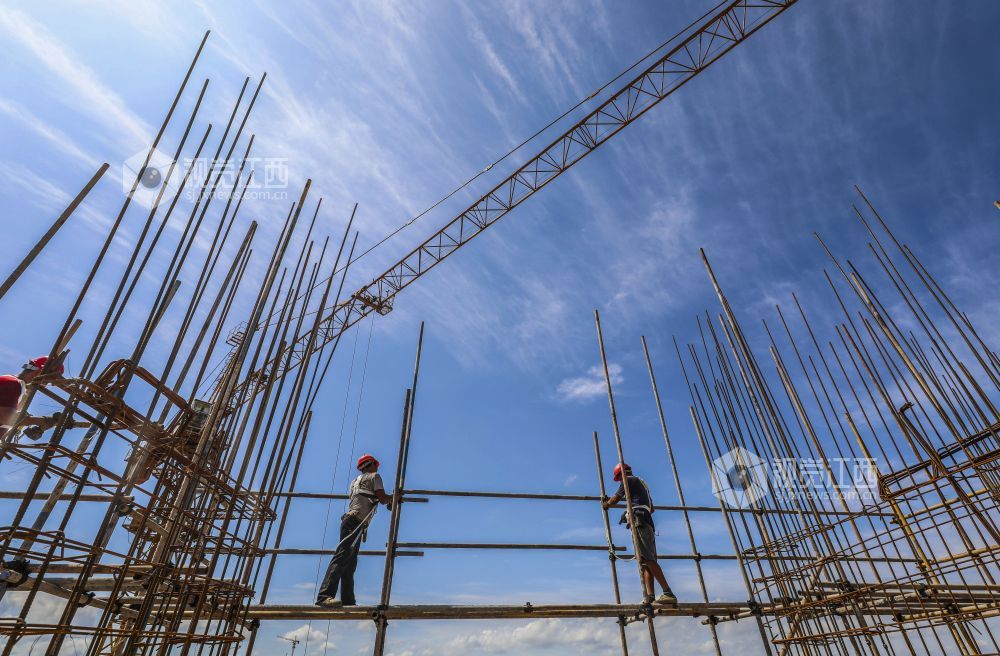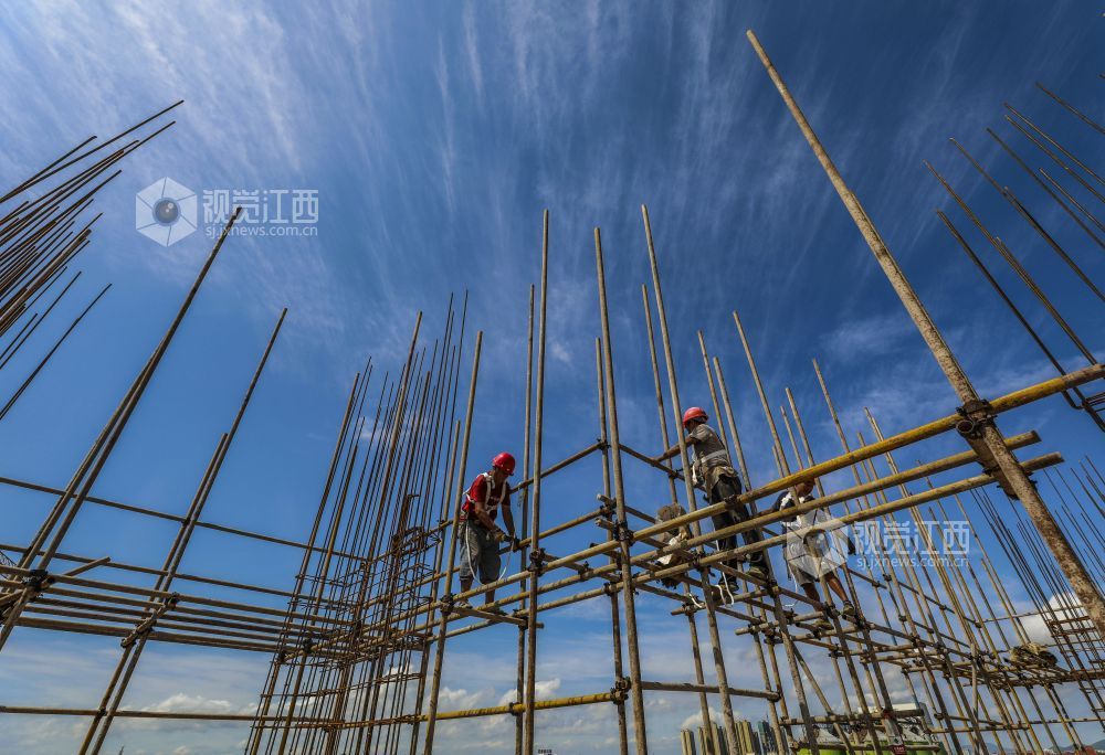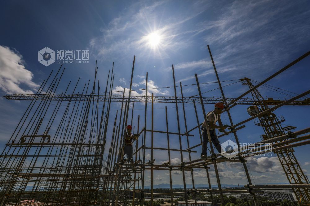 2020年8月20日,在江西省吉安市泰和县安置房项目建设工地,工人冒着高温紧张施工。今年以来,江西省吉安市泰和县一手抓疫情防控、一手抓生产发展,大力实施城乡安居保障工程,在保证建设质量的前提下,加快推进棚改安置住房项目复工建设,确保安置房建设保质保量如期竣工,让住房困难群众早日搬新家、住新房,实现安居梦想,提高群众的获得感和幸福感。