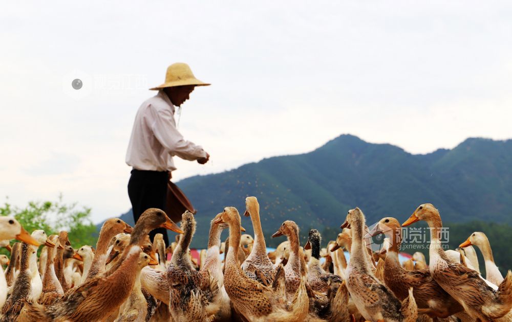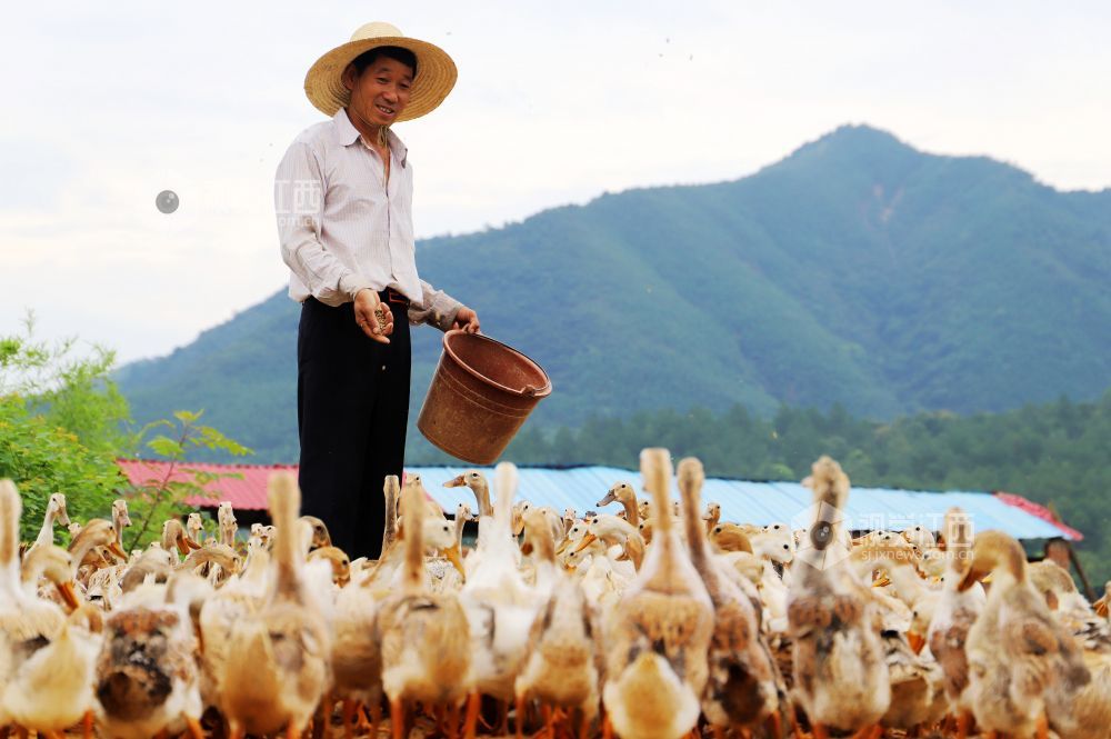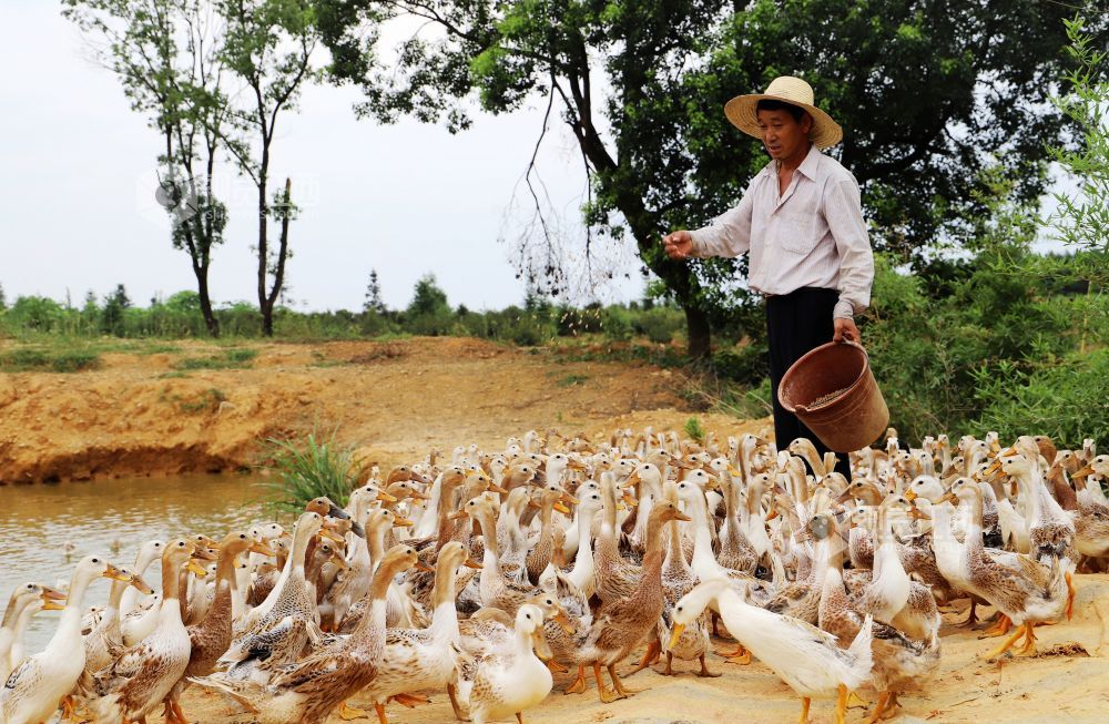 8月27日,江西省安福县洲湖镇汶源村村民王三传在喂养鸭子。王三传是建档立卡贫困户,2018年返乡后,镇扶贫办帮助他挖了3亩水塘,水里养鱼,水面养鸭,一举脱贫。近年来,安福县通过产业扶贫资金扶持贫困户从事畜禽、水产养殖,1200余户养殖户稳定脱贫。