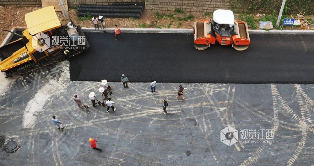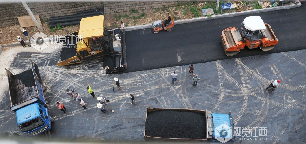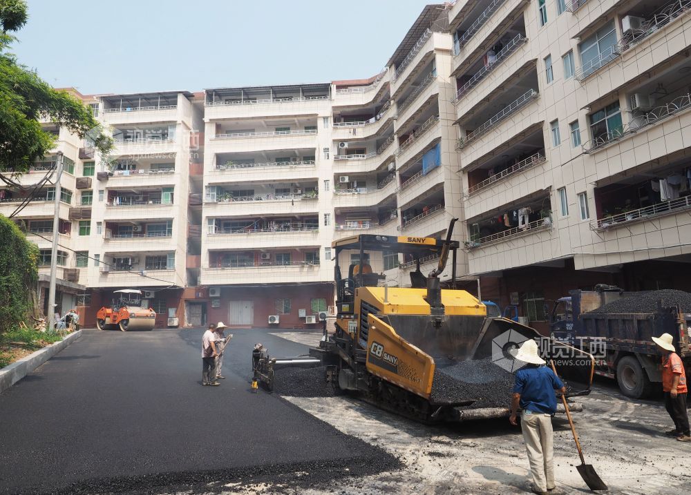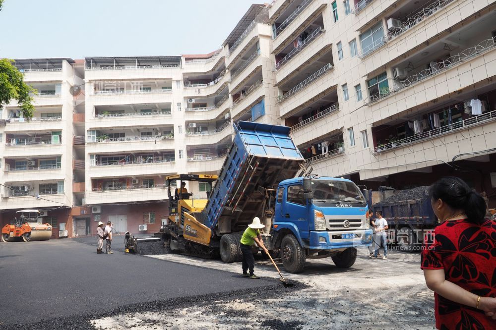 2020年8月28日,江西省南丰县琴城镇仓山路老旧小区改造施工现场,施工人员正在抓住晴好天气,铺设沥青路面,确保改造项目按期完工。据了解,去年以来,该县共有4个小区,1280余户居民纳入改造范围。按照标准,对小区范围内的绿化、网管、外墙、楼面、下水管道等基础设施进行改造,改造后的小区,面貌焕然一新。