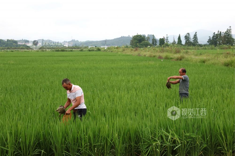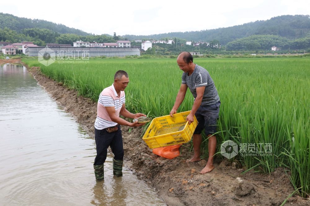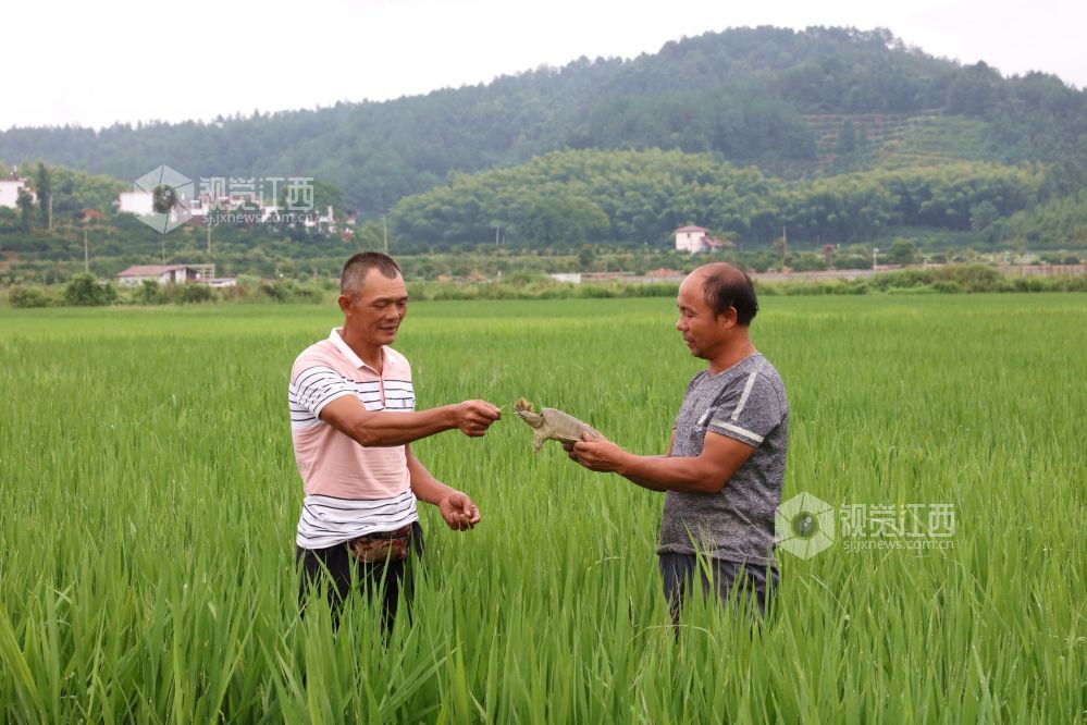2020年8月27日,在江西省南丰县太和镇丹阳村稻鳖生态种养基地,农民们在捕捉生长成熟的甲鱼。该村近年来探索推行“稻鳖共养”生态种养新模式,在50余亩稻田中喂养甲鱼,每亩综合收益近5000元。通过减少农药和化肥的生态种养环境,节约生产成本的同时,实现生态效益和经济效益双赢。