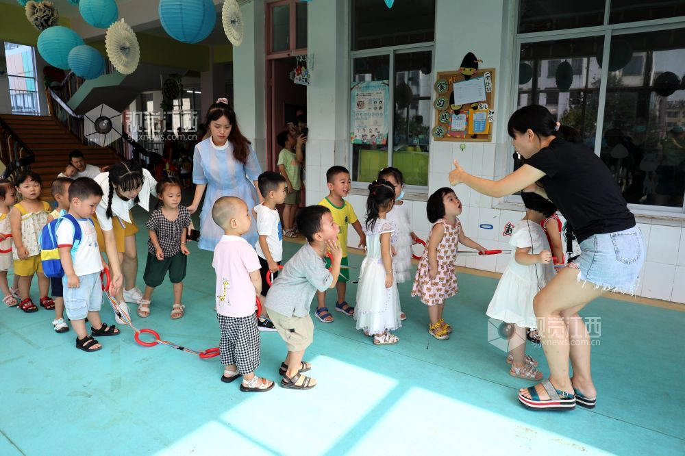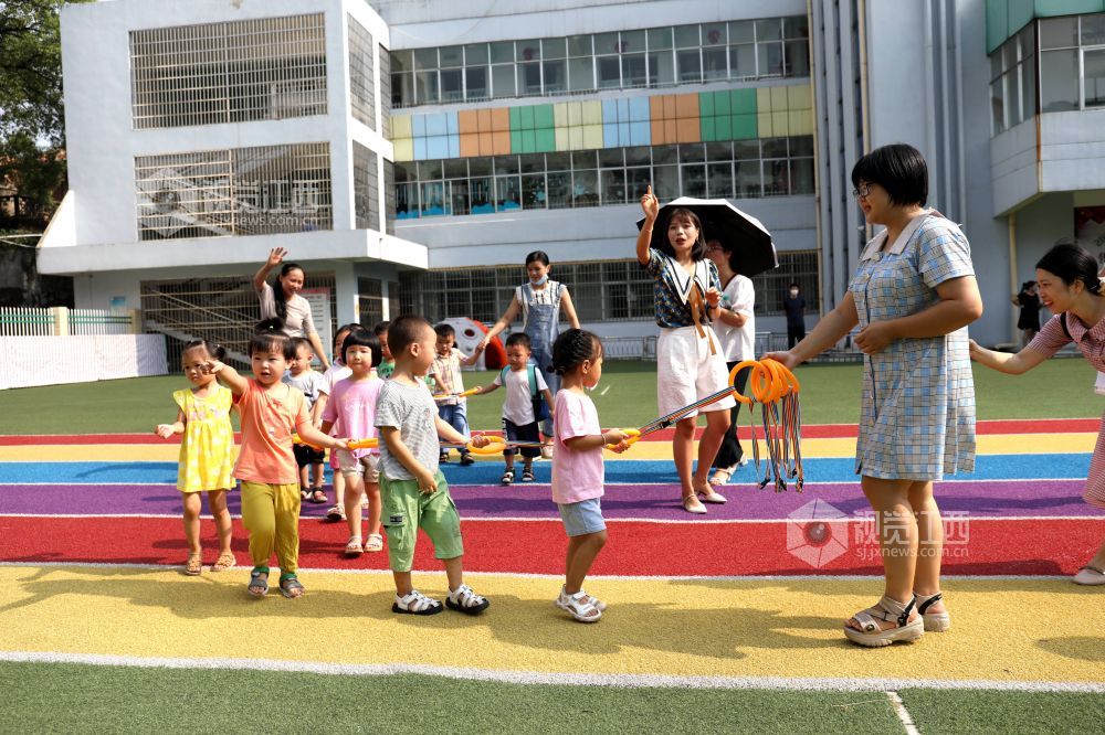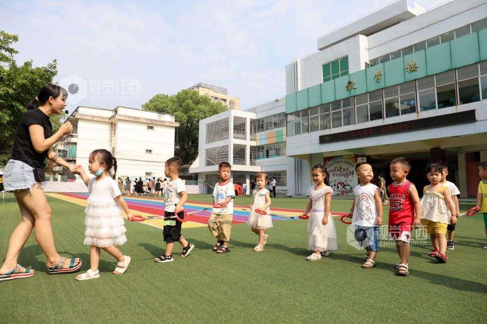 9月1日,江西省分宜县中心幼儿园小班老师带领小朋友在操场上熟悉校园环境。开学第一天,分宜县各所幼儿园为使刚入园的小班幼儿能更好地适应幼儿园集体生活,提高家长对学前教育的认识,纷纷开展小班新生入园适应活动。