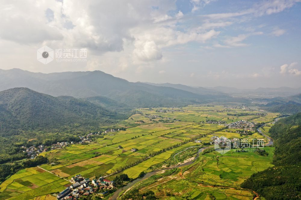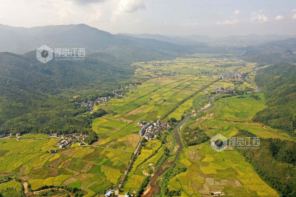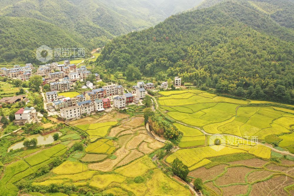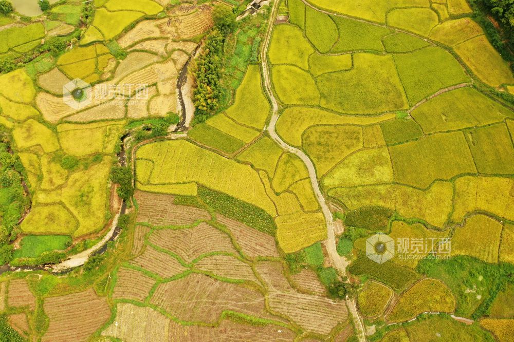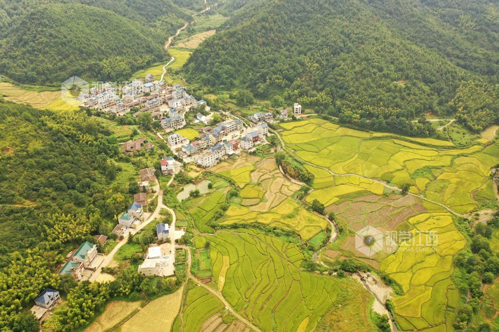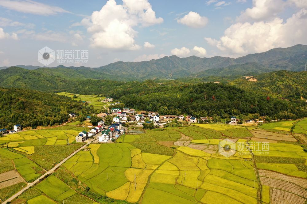 2020年9月5日,航拍江西省上饶市铅山县陈坊乡金黄色的稻田层层叠叠与房屋和乡村小道交相辉映,呈现一幅美丽的秋日画卷。