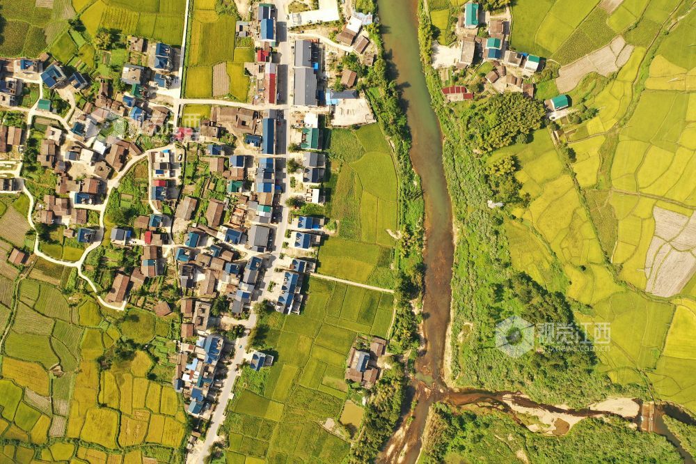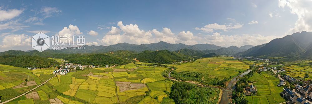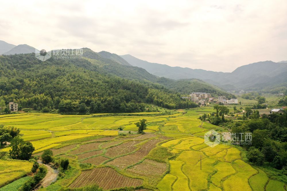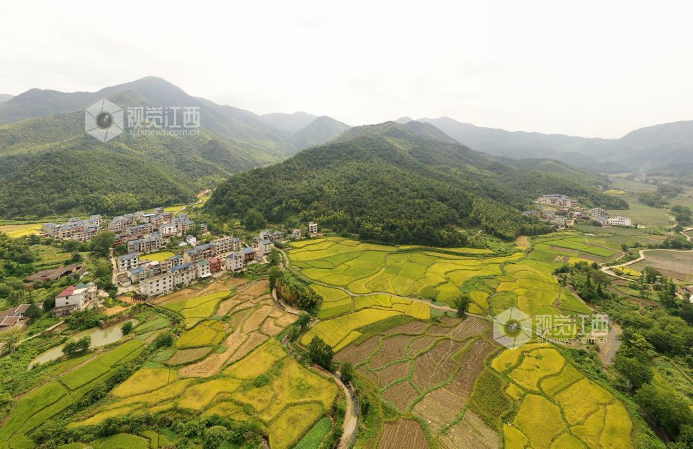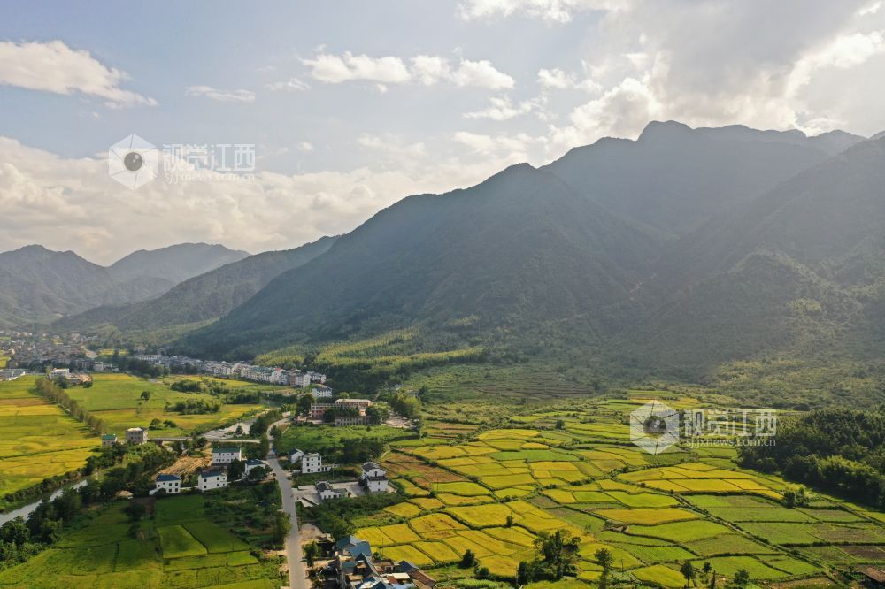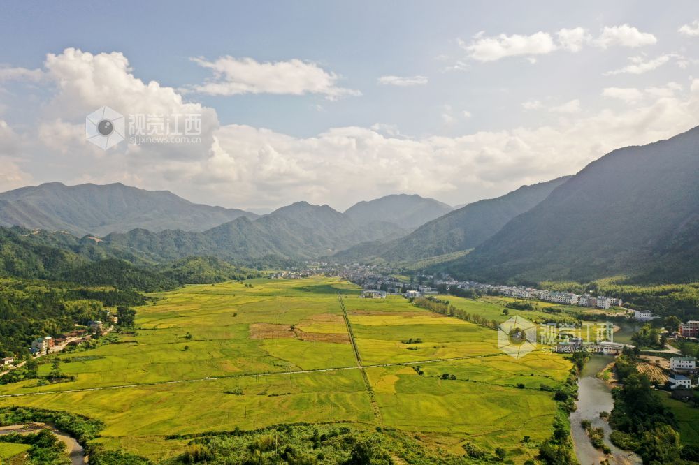 2020年9月5日,航拍江西省上饶市铅山县陈坊乡金黄色的稻田层层叠叠与房屋和乡村小道交相辉映,呈现一幅美丽的秋日画卷。