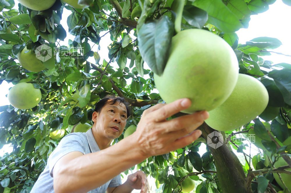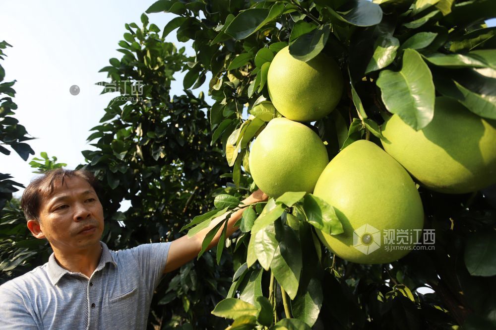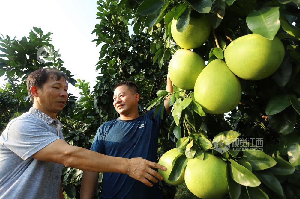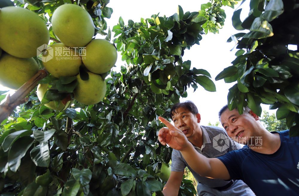 9月6日,江西省吉安市安福县赤谷乡果业技术人员在苍坑村蜜柚基地观察蜜柚长势。蜜柚是安福县八大扶贫产业之一,近年来,该县采取“合作社+家庭农场+基地+农户”的形式,加快蜜柚规模化、产业化发展,建成千亩以上基地10个,蜜柚专业合作社、家庭农场85个,总面积达6.3万亩,挂果面积达2.8万亩,年产蜜柚达2万余吨。