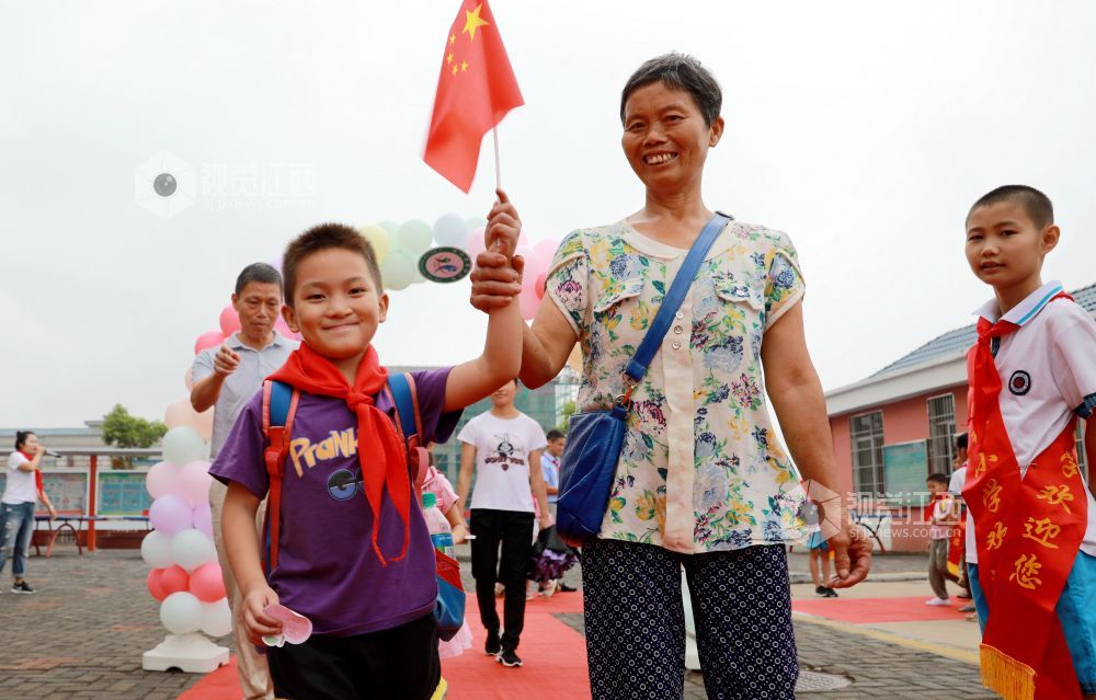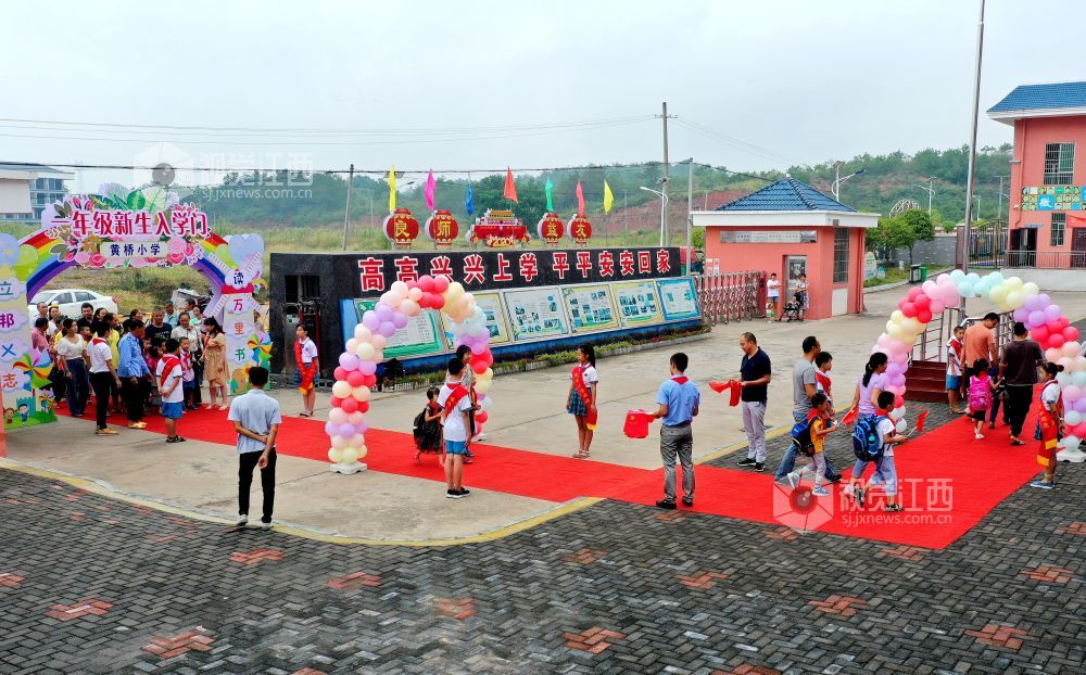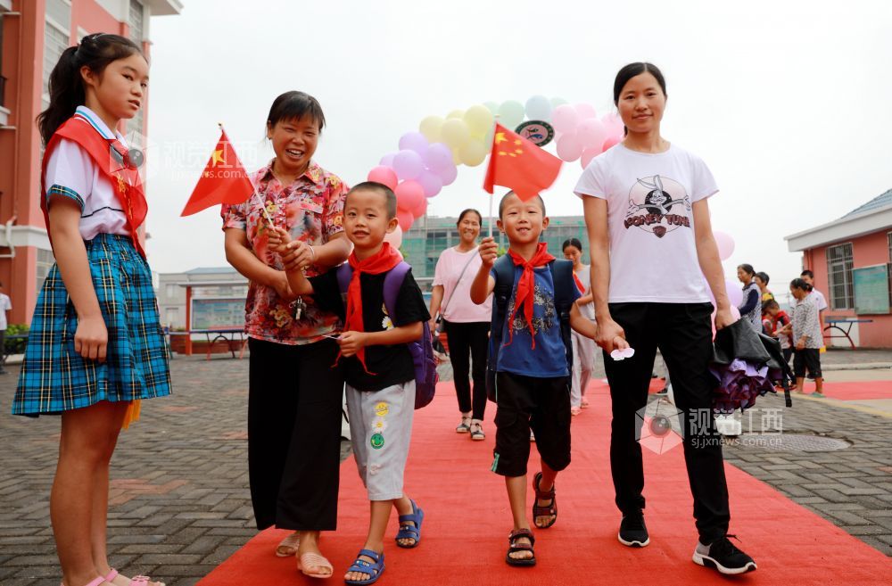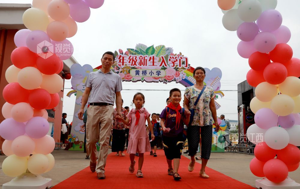 2020年9月7日,江西省吉安市吉水县黄桥镇黄桥中心小学,新入学的一年级小学生在家长的陪护下,走上红地毯,走过彩虹门,走进学校。