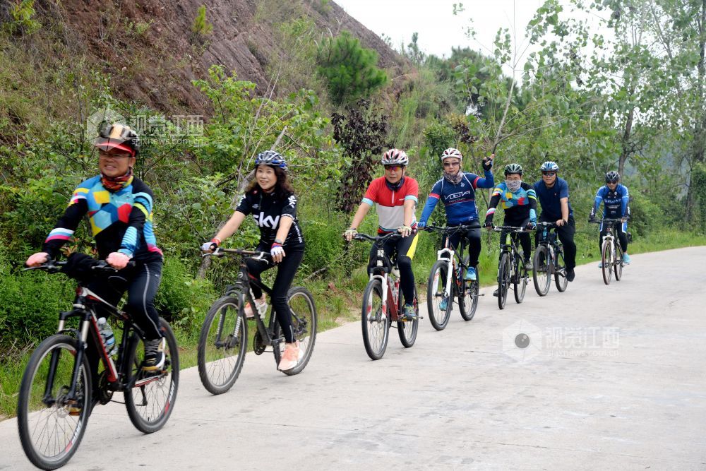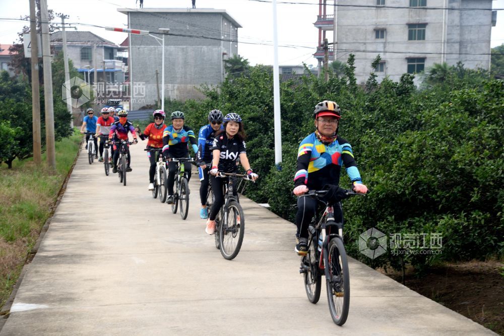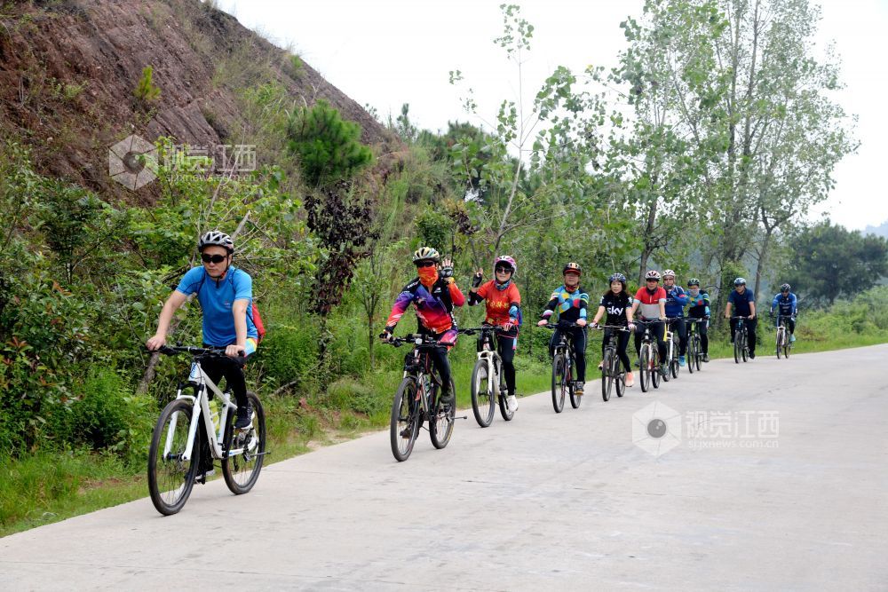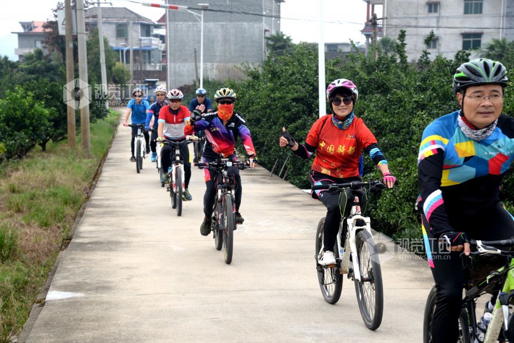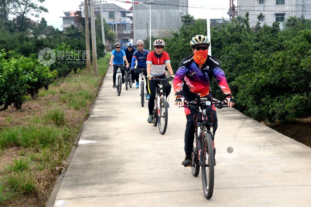 2020年9月13日,江西省南丰县登山户外运动协会自行车俱乐部的12名骑行爱好者穿行在乡村公路和桔园里,倡导“绿色出行”。