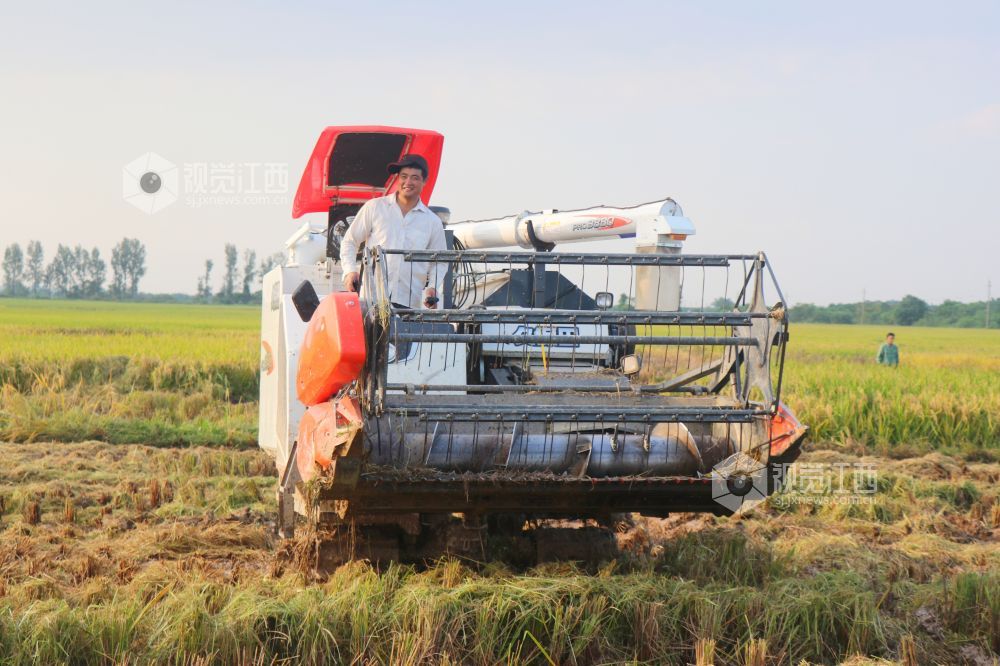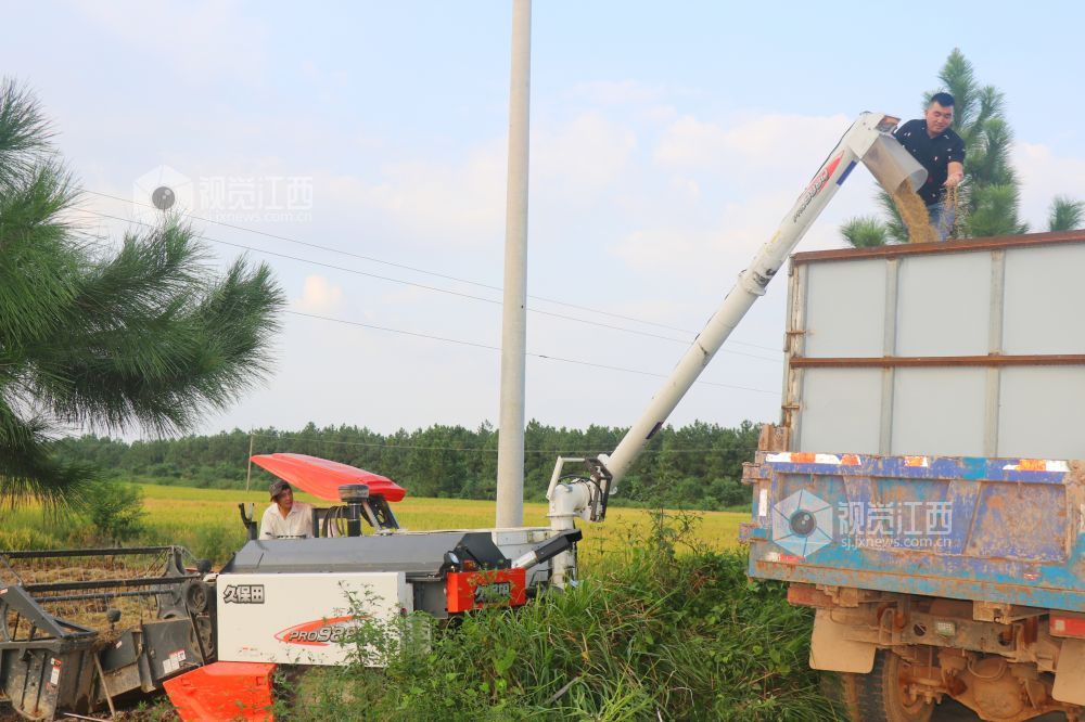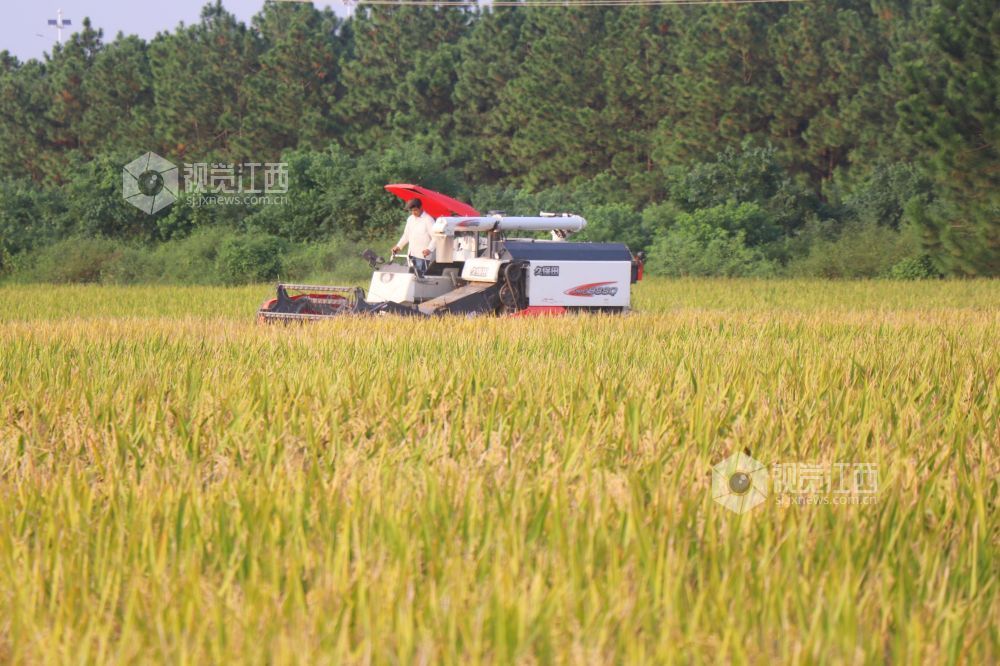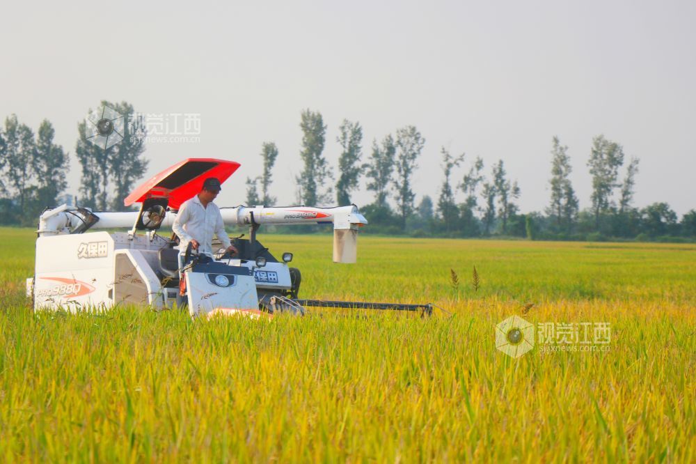 9月30日,在江西省余干县石口镇院前村稻田里,收割机正在不停地来回作业,当地农户抓住晴好天气抢收中稻。