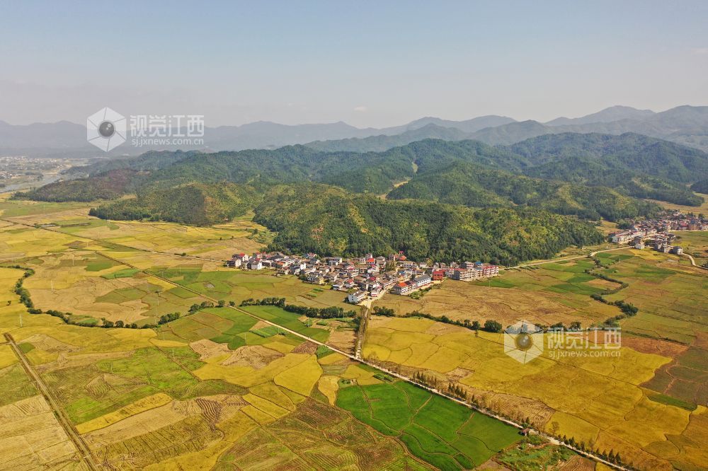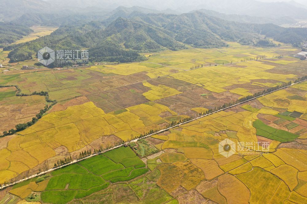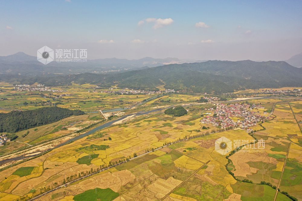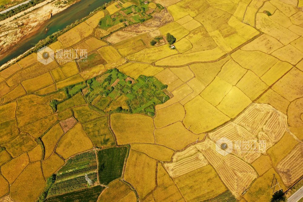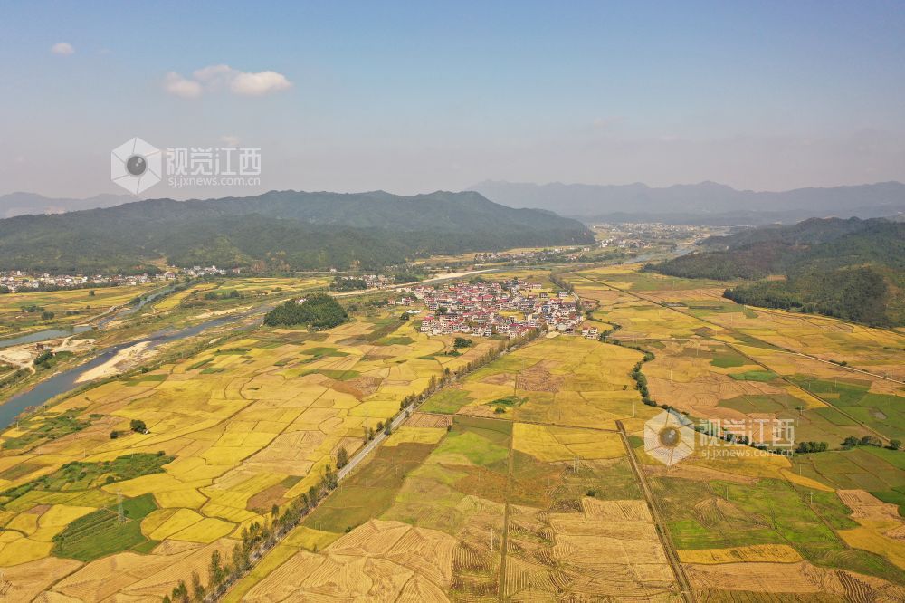 2020年10月9日,航拍江西省上饶市铅山县石塘镇稻田秋色,大地如用黄色染过一样,遍地金黄。金秋时节,铅山稻谷进入收获季,稻田一片金黄,景色宜人,一片片稻田交织成了一幅色彩明快的田园画卷。